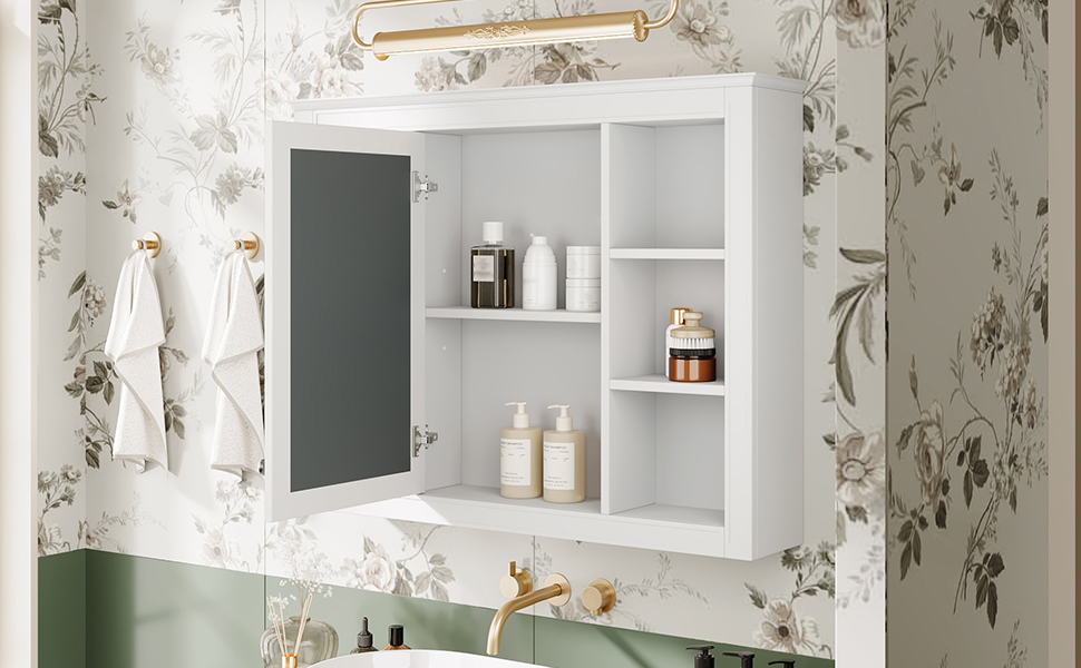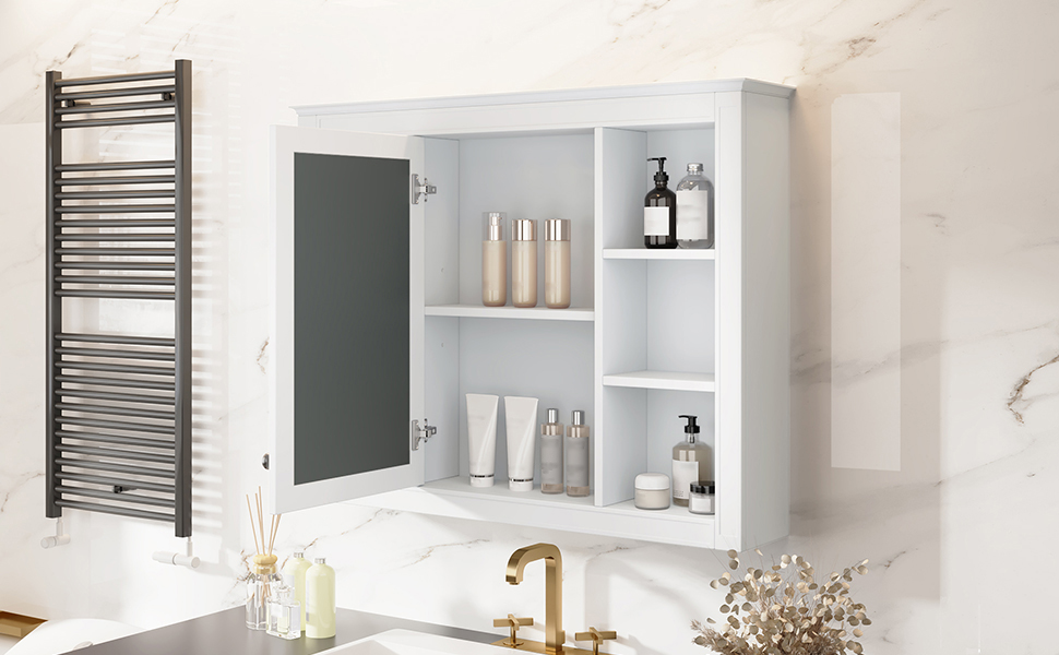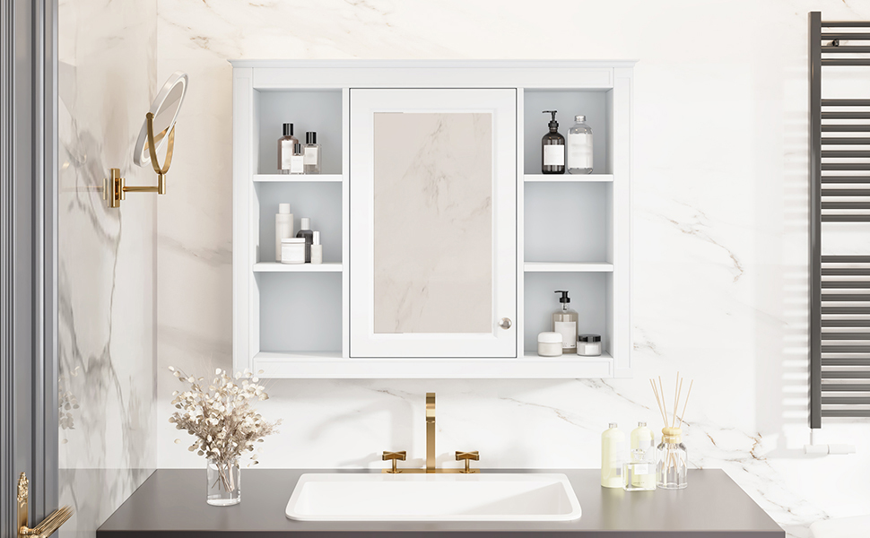 MRS 35'' x 27.5'' Medicine Cabinet, Wall Mounted Bathroom Storage Cabinet, Modern Bathroom Wall Cabinet with Mirror, Mirror Cabinet with 6 Open Shelves (Not Include Bathroom Vanity ). Designed to provide practical task lighting around a vanity or bathroom mirror while supporting everyday grooming routines. Material: MDF. Product dimensions and weight: length 39.5, width 19.75, height 7, weight 40.95.