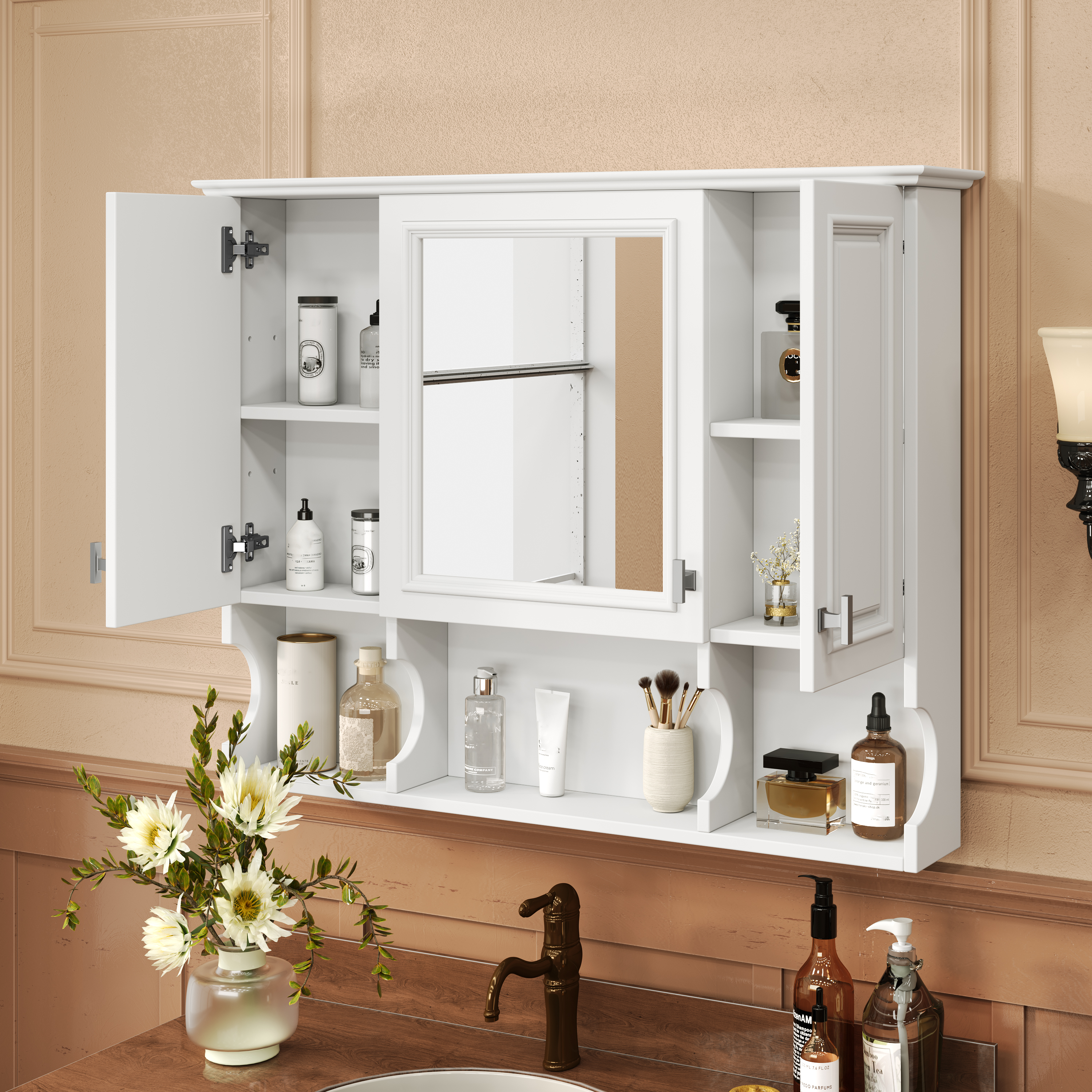 MRS 35'' x 28'' Wall Mounted Bathroom Medicine Cabinet, Modern Bathroom Wall Cabinet with Mirror, Mirror Cabinet with Open Shelves. Designed to provide practical task lighting around a vanity or bathroom mirror while supporting everyday grooming routines. Material: MDF. Product dimensions and weight: length 38.8, width 19, height 7.4, weight 43.65.