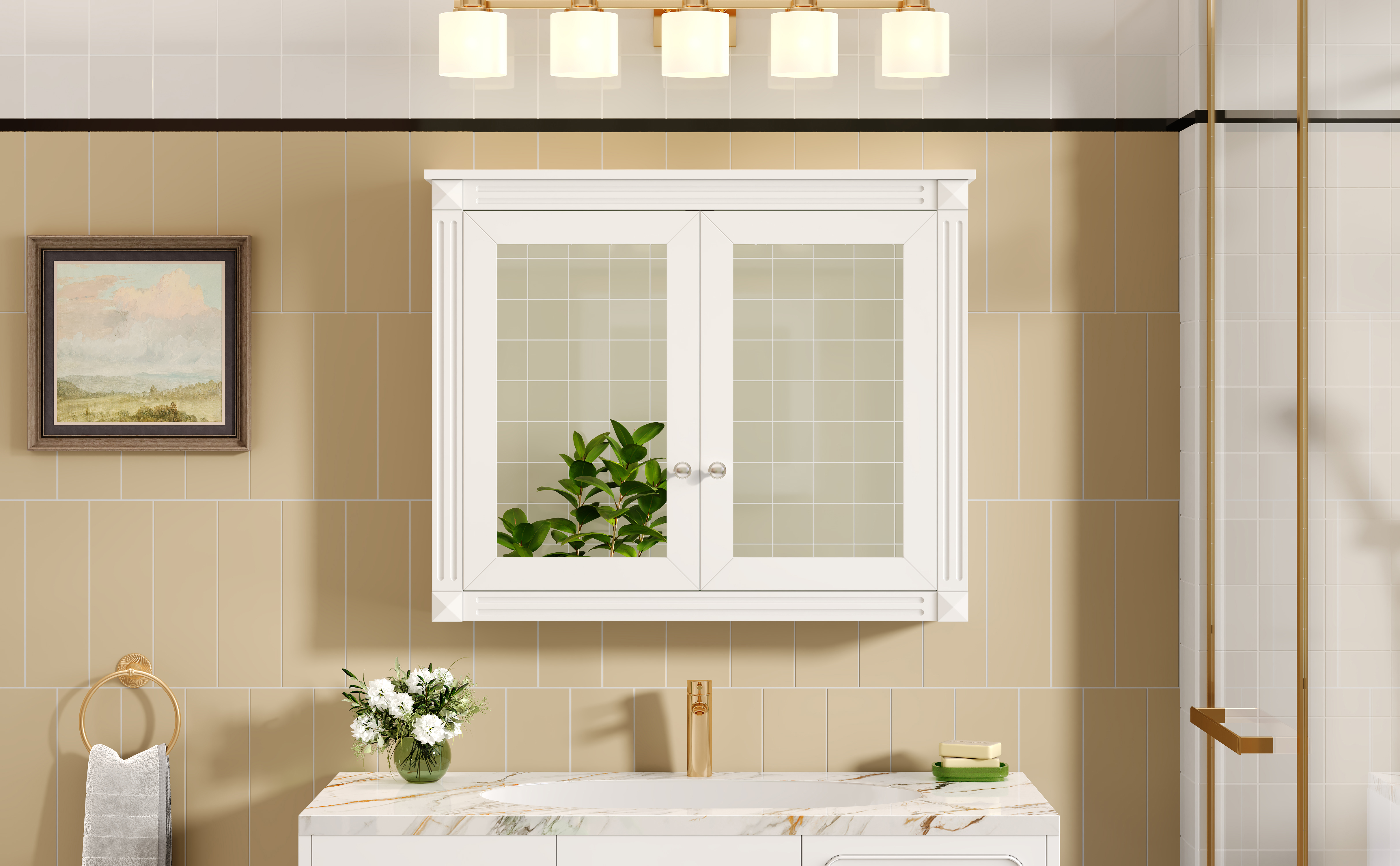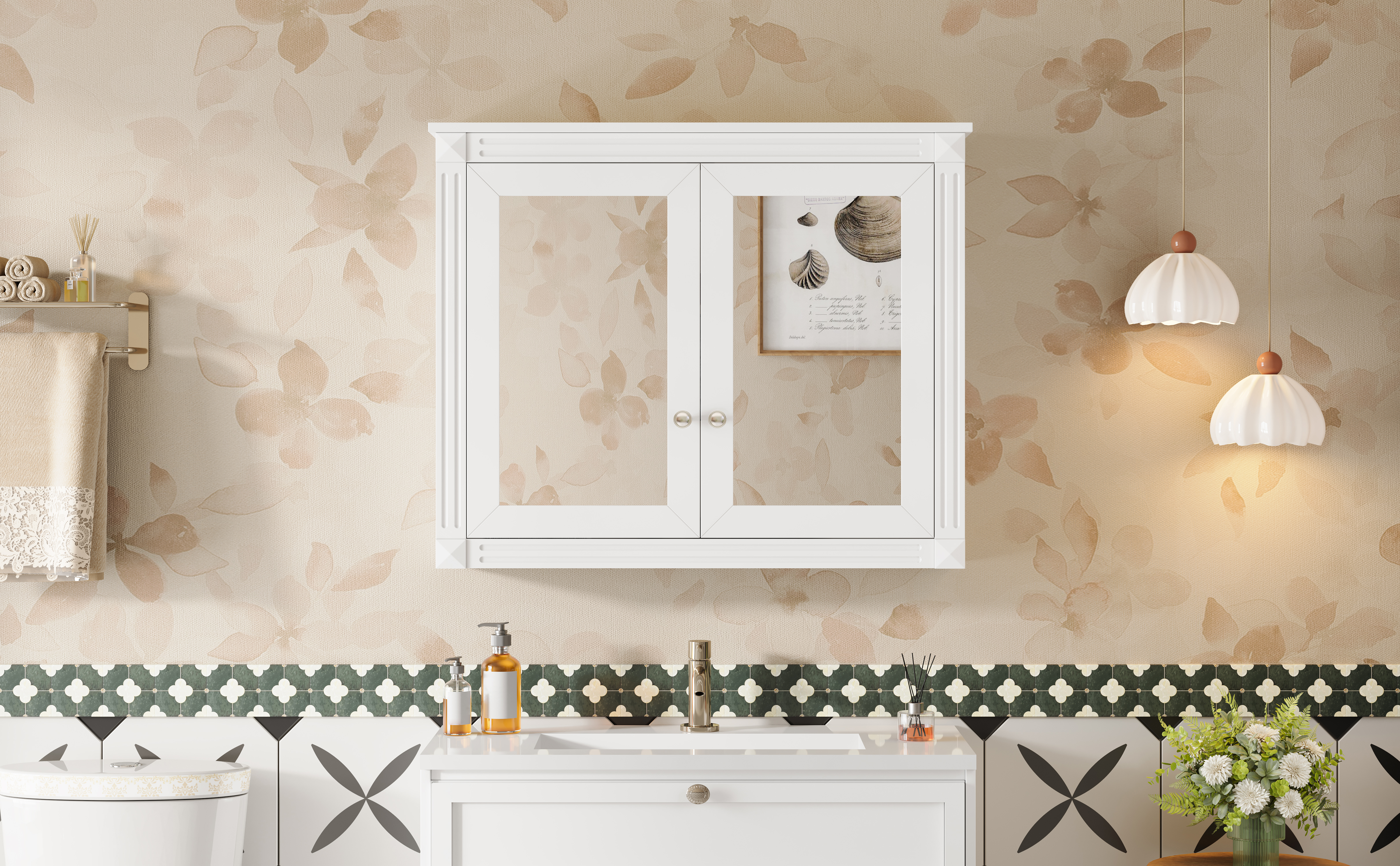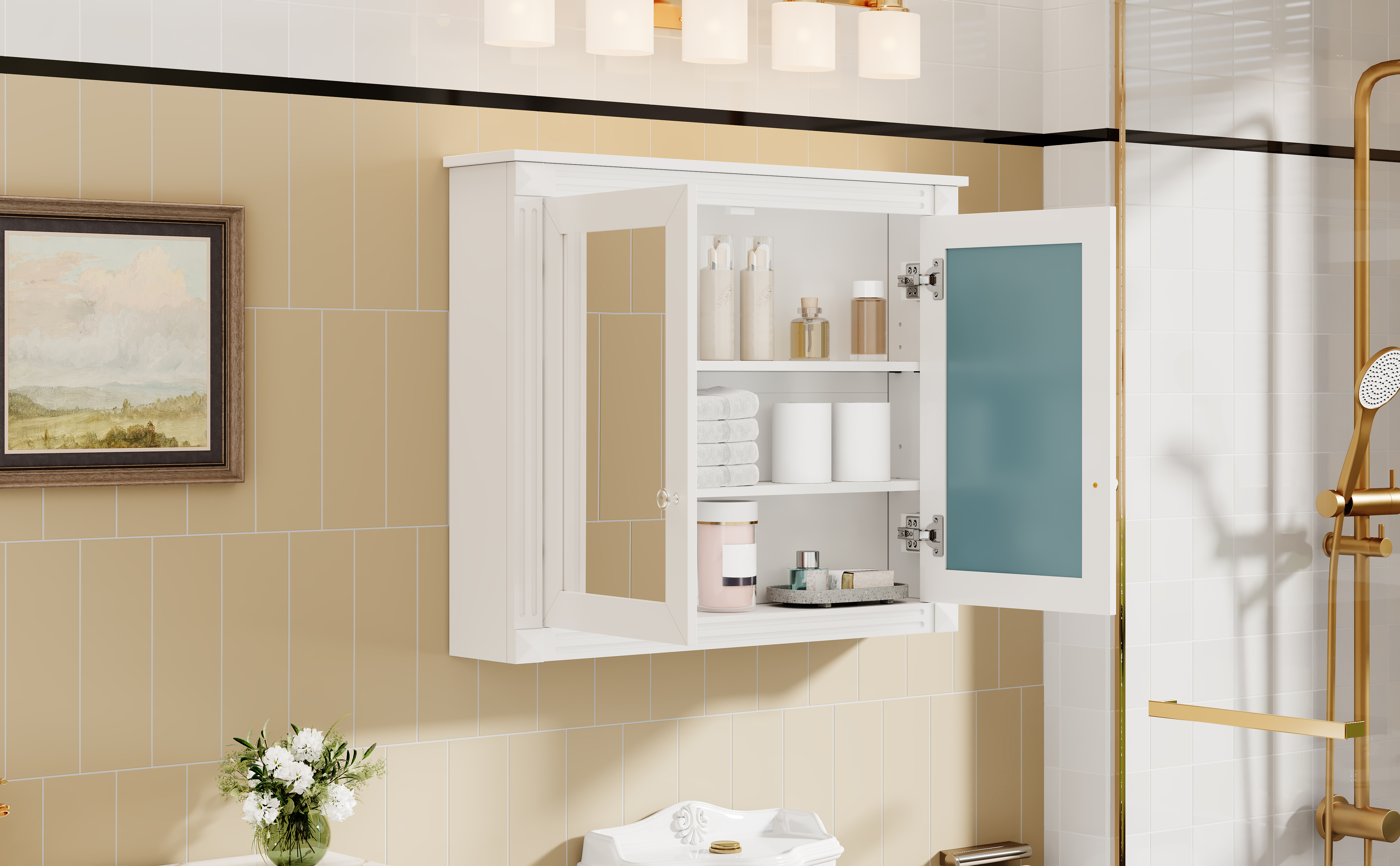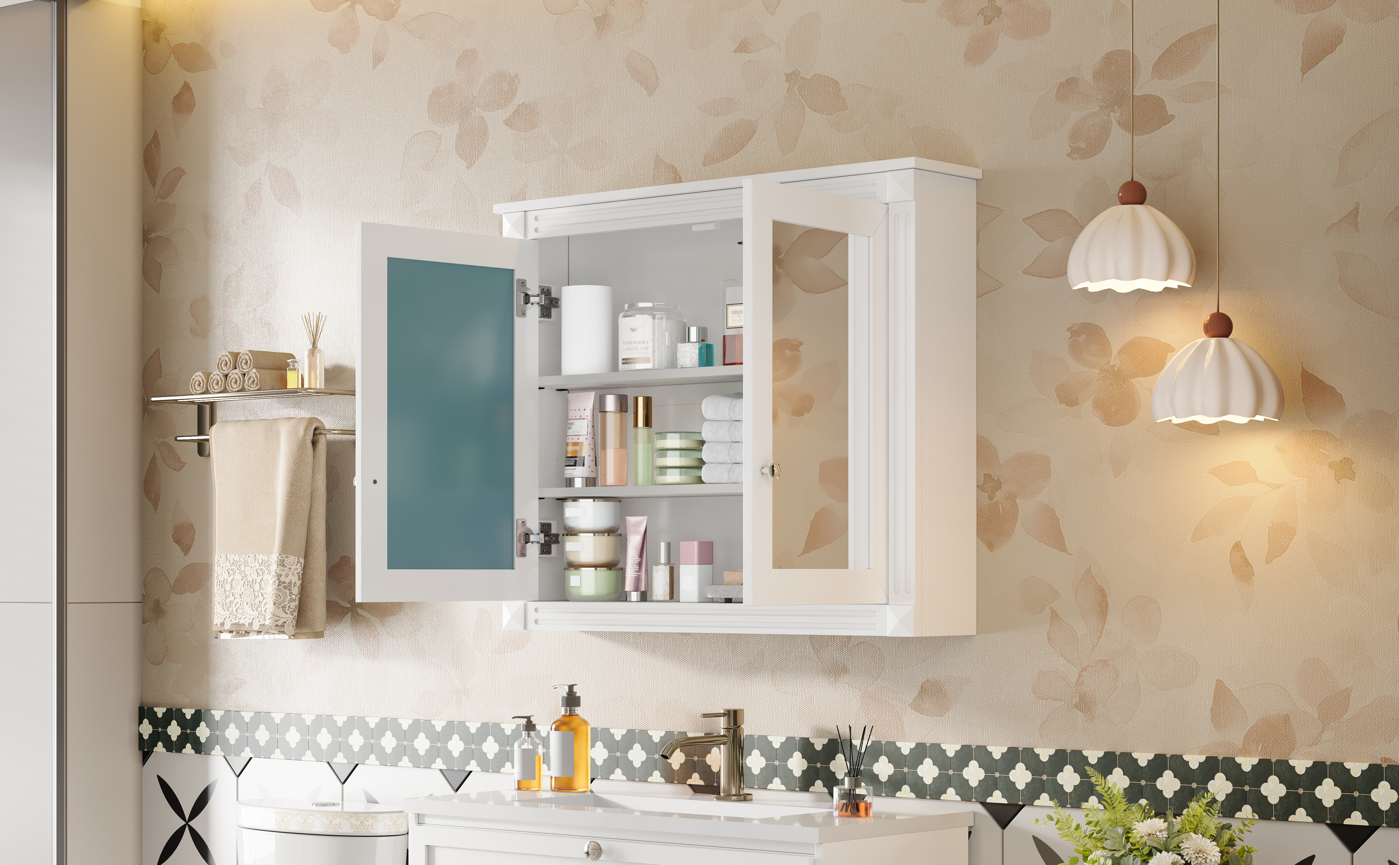 MRS 36'' x 28'' Medicine Cabinet, Wall Mounted Bathroom Storage Cabinet, Modern Bathroom Wall Cabinet with 2 Mirrors, Medicine Cabinet, Mirror Cabinet with 2 adjustable Shelves. Designed to provide practical task lighting around a vanity or bathroom mirror while supporting everyday grooming routines. Material: Solid Wood+MDF. Product dimensions and weight: length 39, width 18.5, height 7.75, weight 45.68.