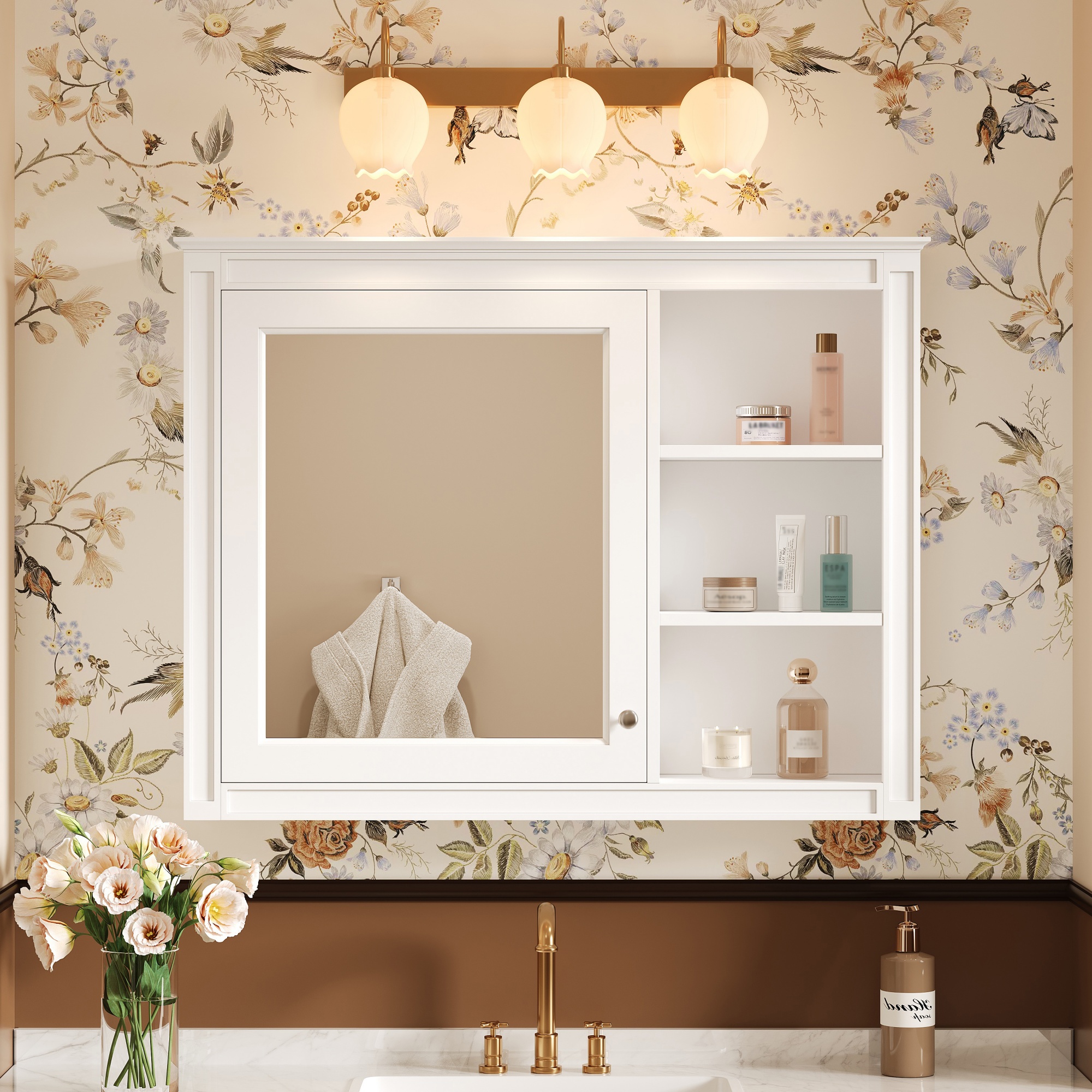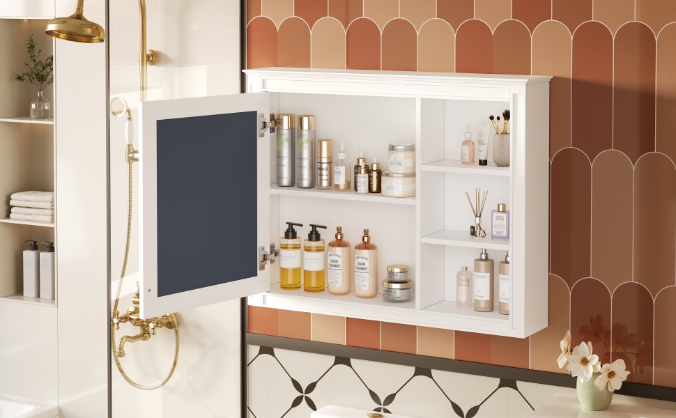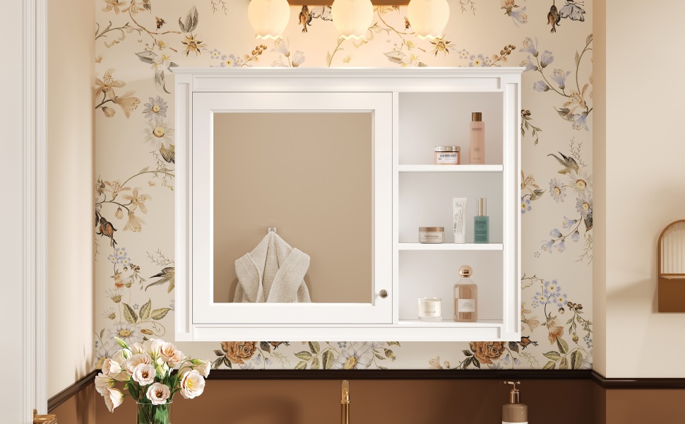 MRS 36'' x 28'' Medicine Cabinet, Wall Mounted Bathroom Storage Cabinet, Modern Bathroom Wall Cabinet with Mirror,Medicine Cabinet, Mirror Cabinet with 1 adjustable Shelf. Designed to provide practical task lighting around a vanity or bathroom mirror while supporting everyday grooming routines. Material: Solid Wood+MDF+Glass. Product dimensions and weight: length 38.8, width 25.25, height 5.75, weight 41.45.