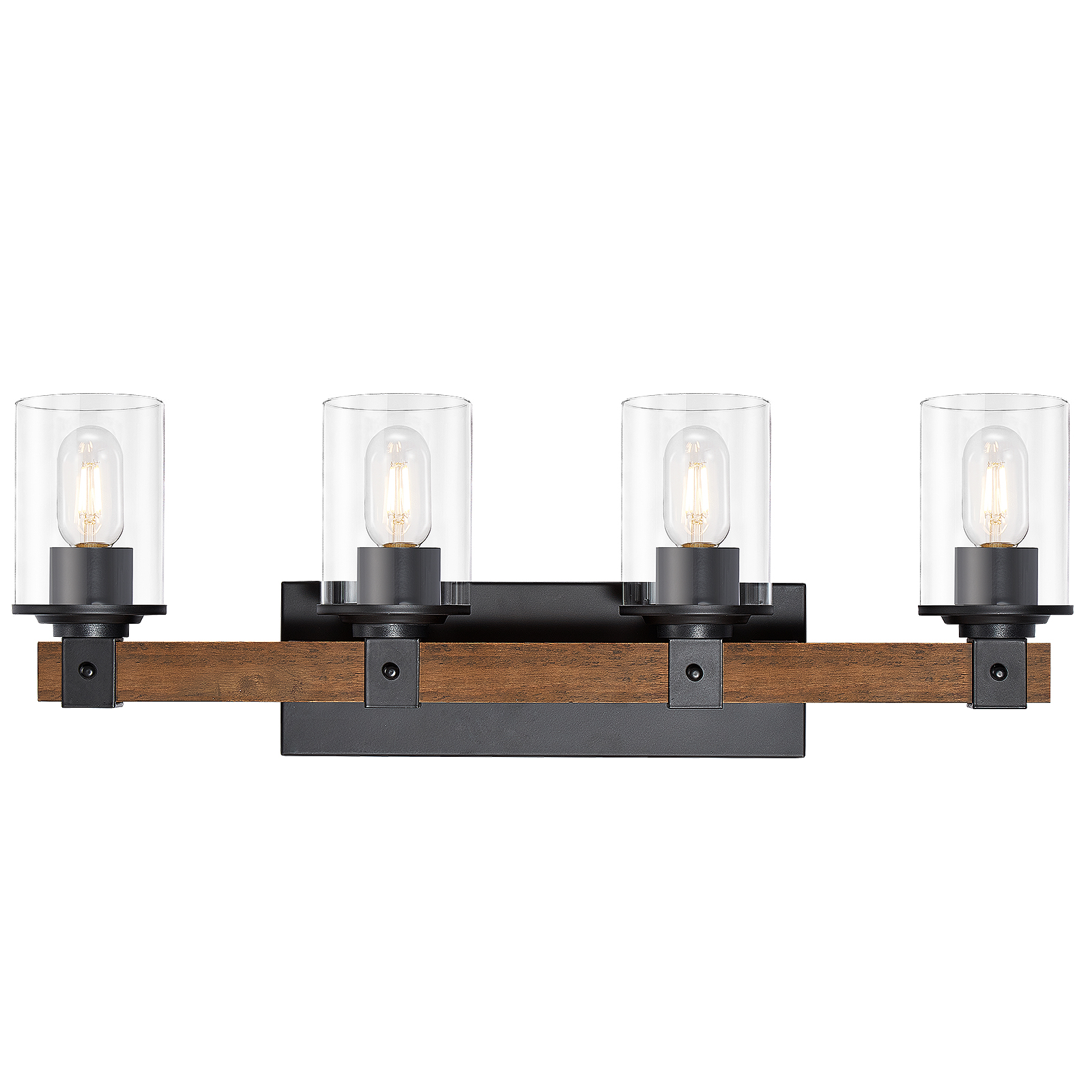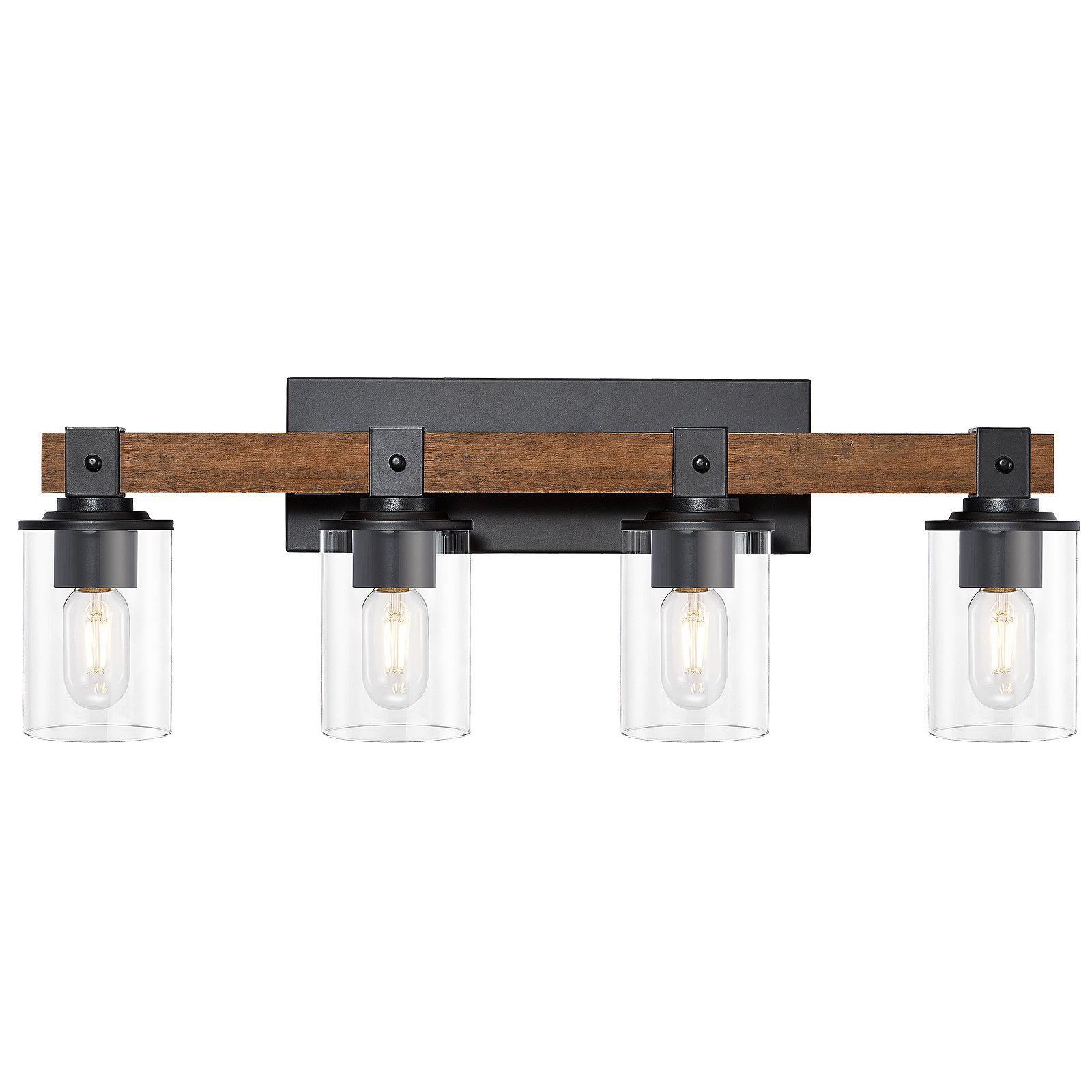 4-Light Industrial Farmhouse Vanity Light, Wood & Black Metal Clear Glass Shade for Bathroom Kitchen
