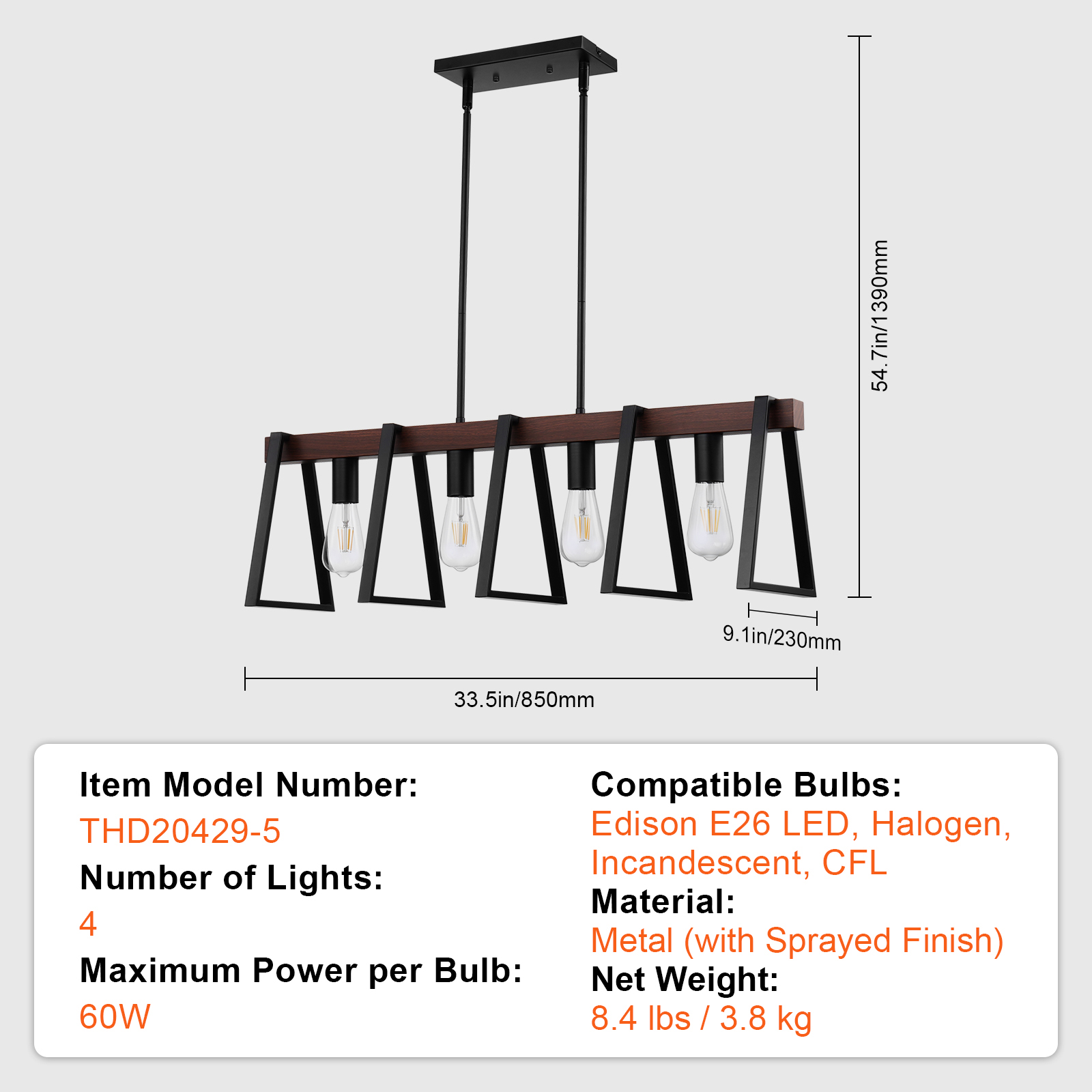 NEOSGO 4-Light Kitchen Island Pendant Lights 60W Adjustable Dining Room Light E26 is intended to deliver focused overhead light while also strengthening the decorative identity of the space. Pendant-style fixtures are especially useful over kitchen islands, sinks, breakfast areas, counters, and compact dining spaces where customers want targeted light and a visible design element. Based on the product presentation, it suits interiors that need a more finished overhead feature without overwhelming the rest of the room. It is a good option for shoppers who want everyday function together with a clean decorative upgrade. Overall size is approximately 35.04 x 11.81 x 4.92 inches with a listed weight of 10.5. The current listing includes 8 product images, which help clarify the product shape, proportions, and visual placement in a real room setting.