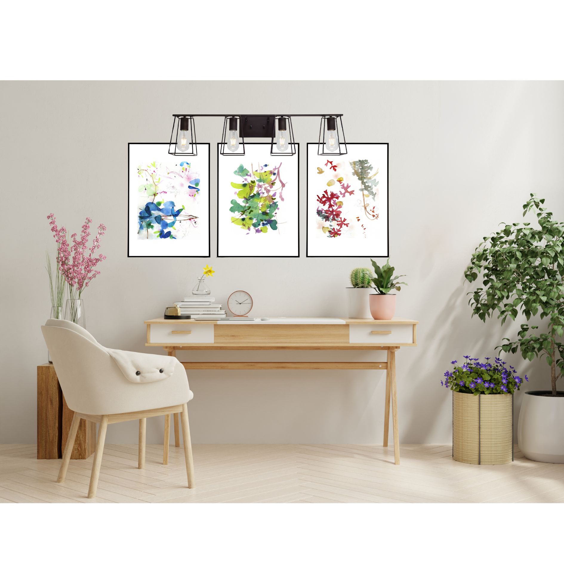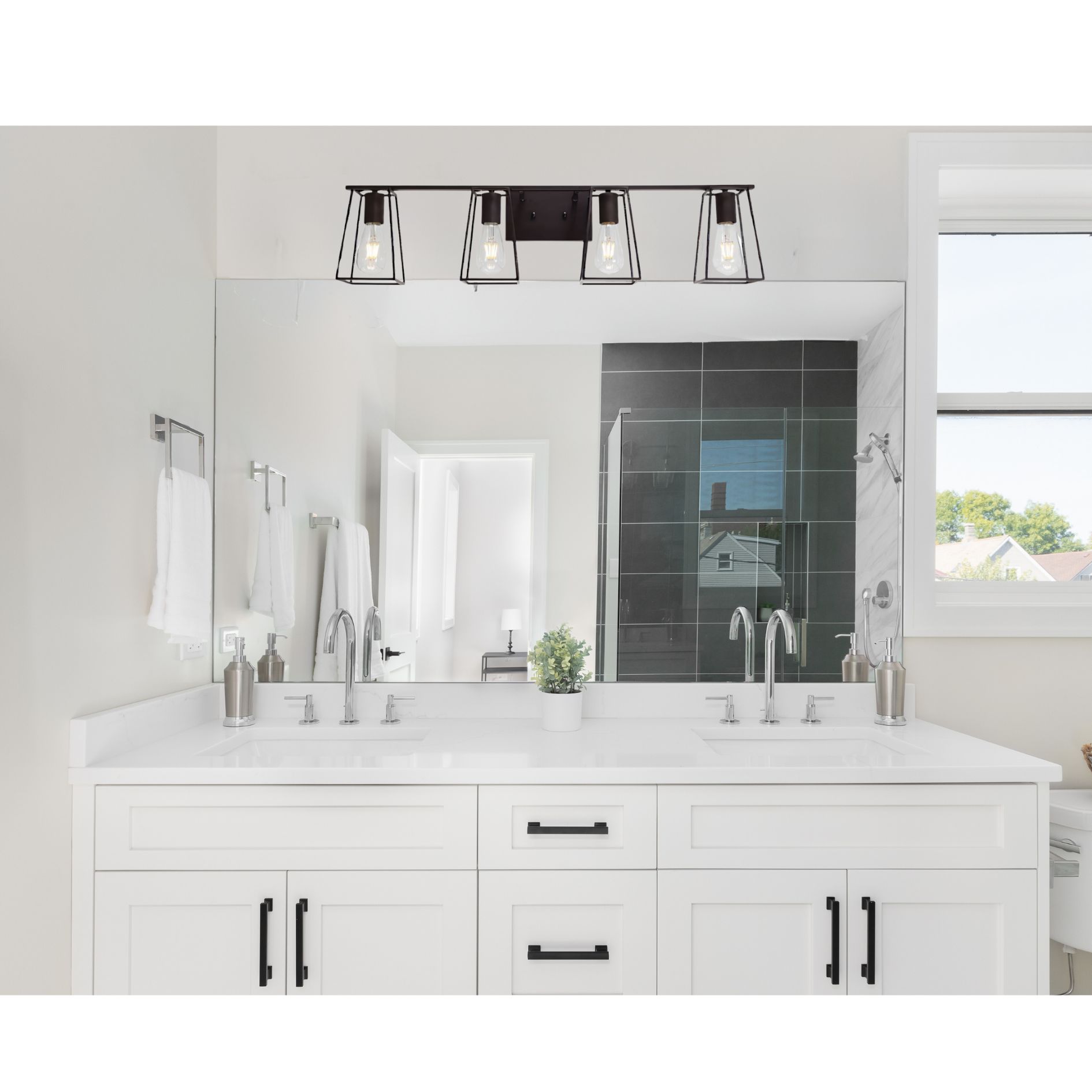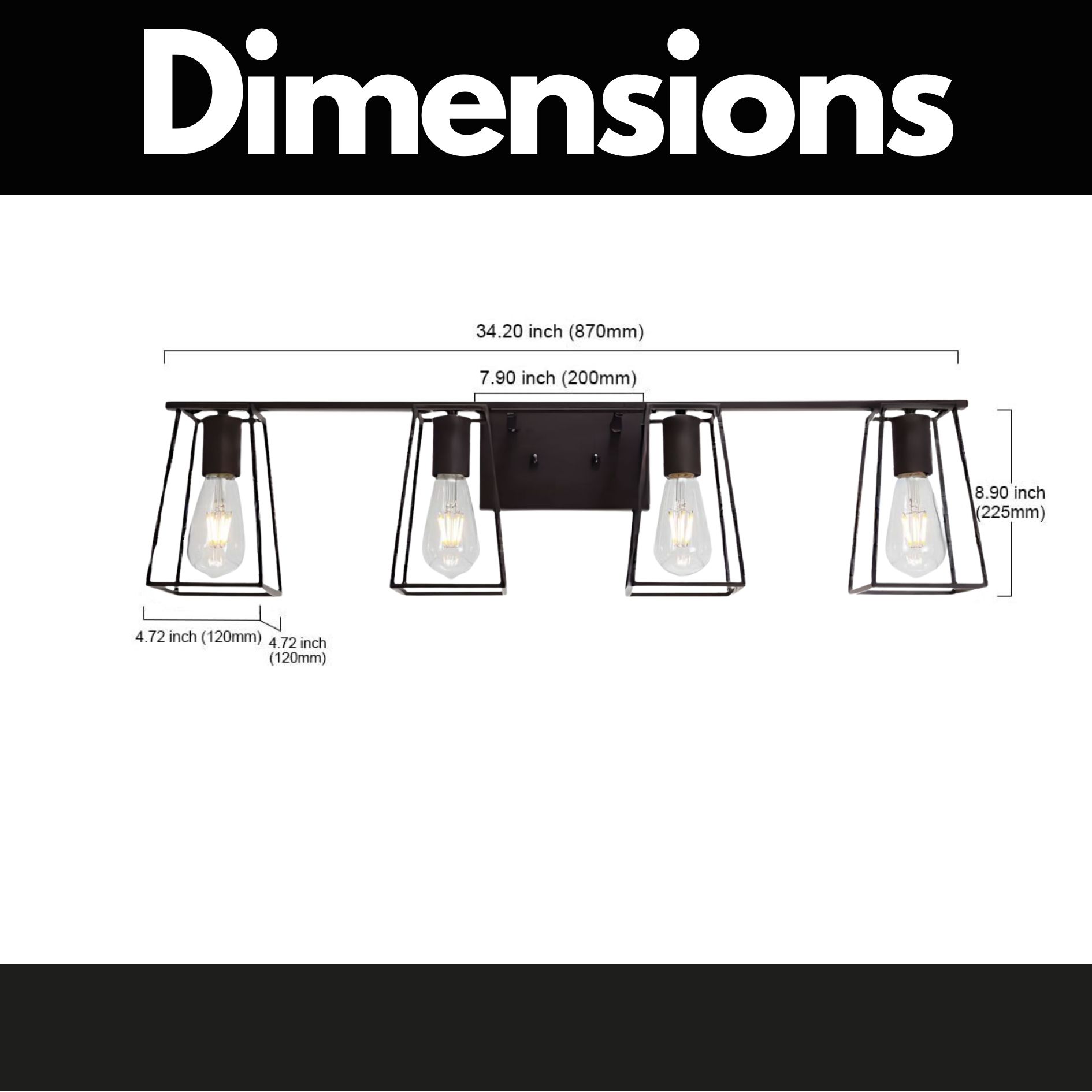 NEOSGO 4-Light Oil Rubbed Bronze Vanity Lights for Bathroom, Industrial Vintage Wall Sconce Lighting with Open Metal Cage. Works well as accent or supplemental wall lighting for hallways, bedrooms, bathrooms, and other interior spaces. Product dimensions and weight: length 35, width 10.5, height 7, weight 7.4.