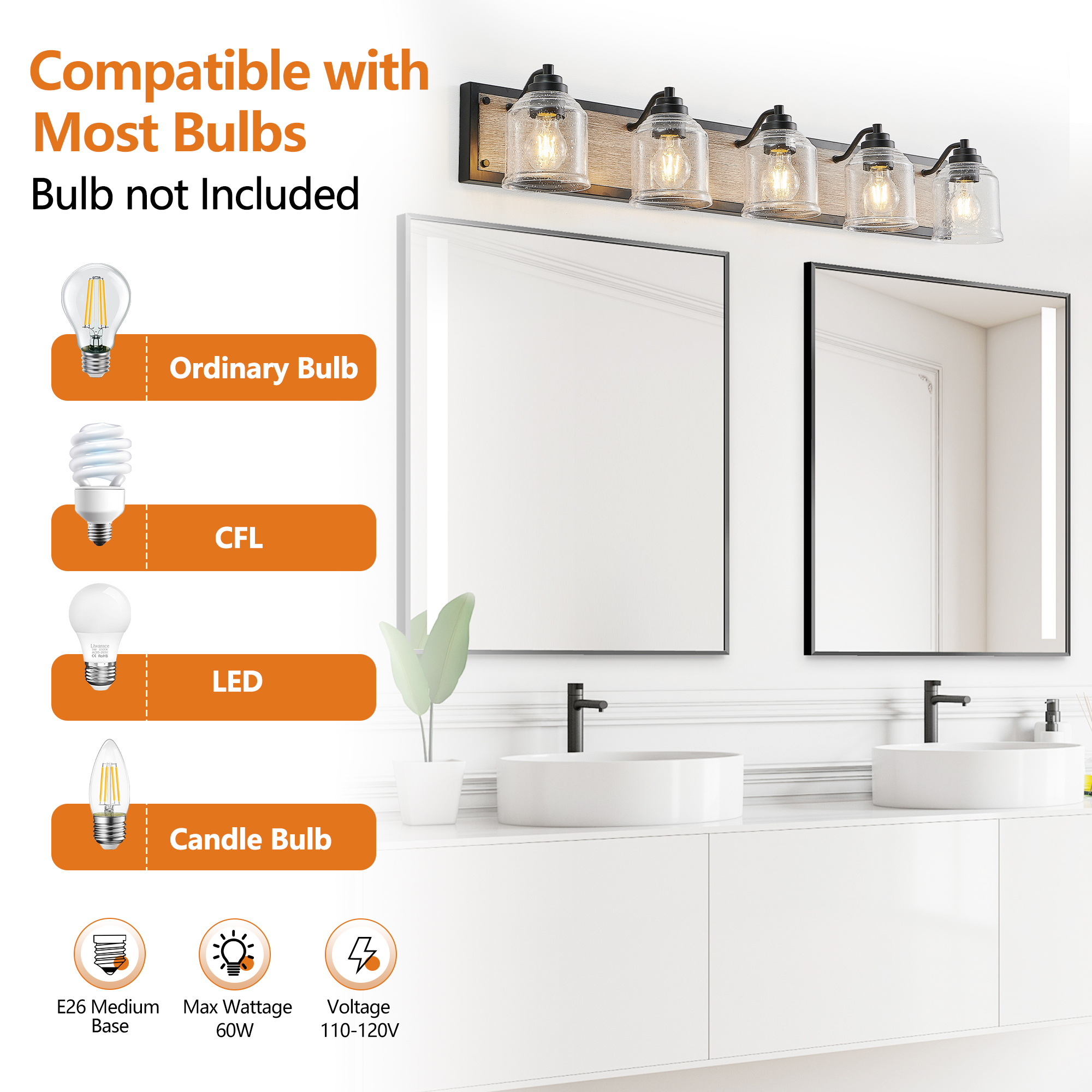 40" Farmhouse Vanity Light Fixture, 5-Light Bathroom Wall Sconce with Clear Seeded Glass Shades, Black and Wood Grain Finish, Modern Industrial Design for Bathroom or Powder Room (No Bulbs)