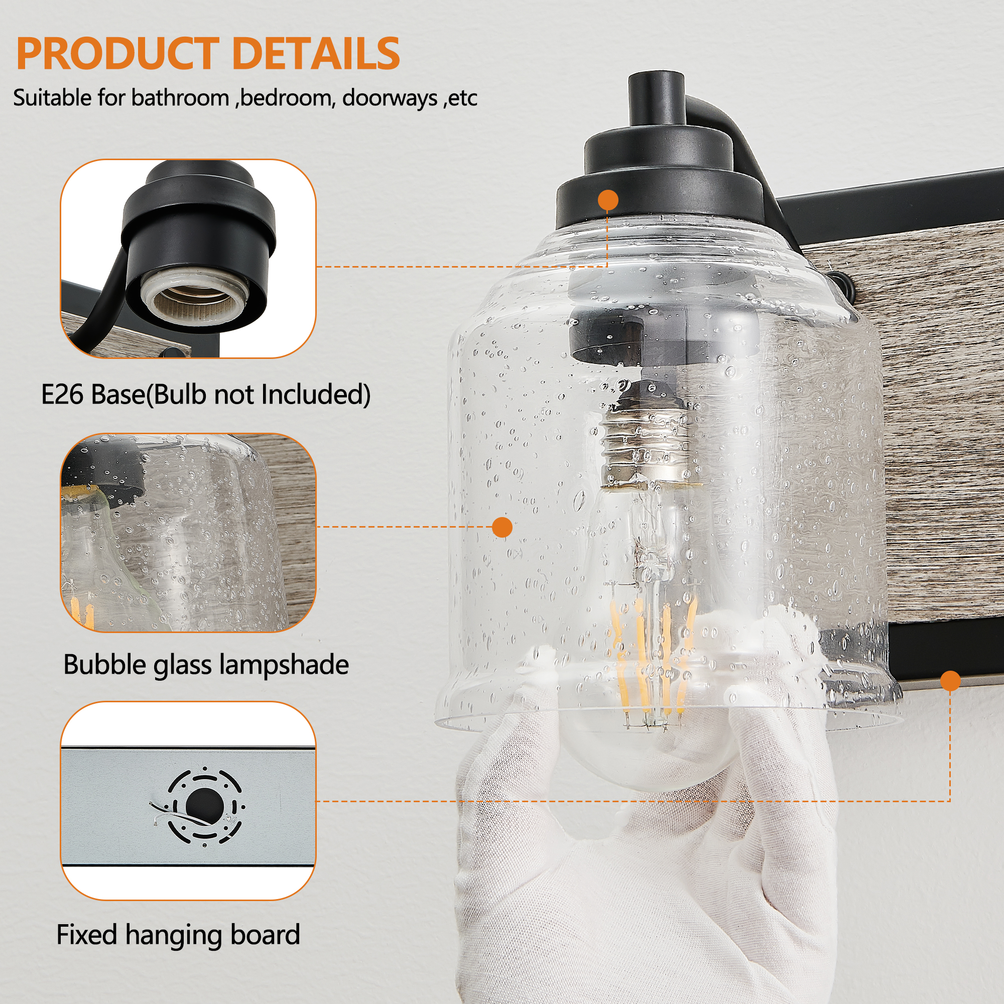 NEOSGO 40" Farmhouse Vanity Light Fixture, 5-Light Bathroom Wall Sconce with Clear Seeded Glass Shades, Black and Wood Grain Finish, Modern Industrial Design for Bathroom or Powder Room (No Bulbs). Works well as accent or supplemental wall lighting for hallways, bedrooms, bathrooms, and other interior spaces. Product dimensions and weight: length 41.3, width 10.2, height 8.7, weight 15.11.