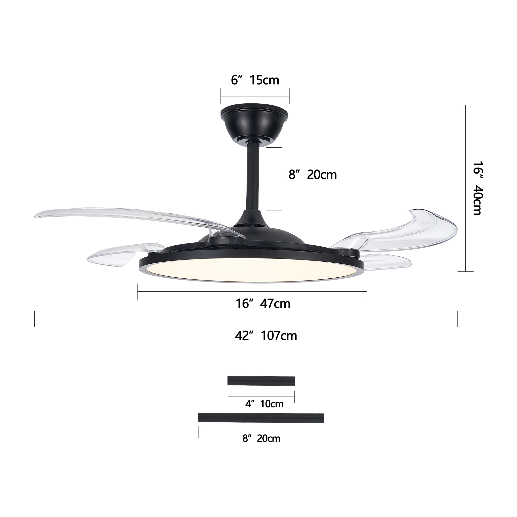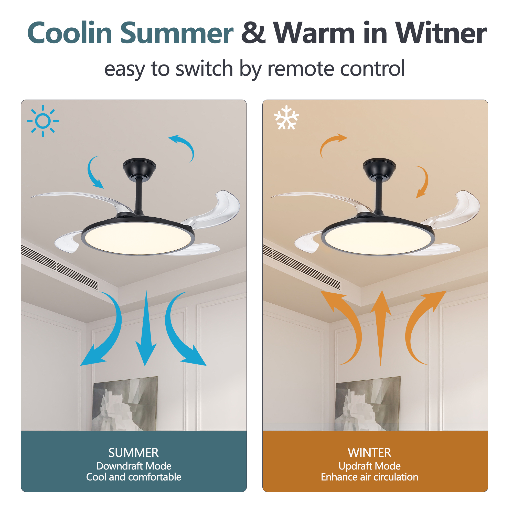 NEOSGO 42 Inch Retractable Ceiling Fan,Low Profile Ceiling Fan with Light and Remote,Modern Black Fan with Retractable Blades for Dinning Room Living Room Bedroom,Dimmable,Timer Setting combines ceiling lighting and airflow in one fixture, making it useful for rooms that need everyday comfort as well as a more finished overhead look. The caged or close-to-ceiling style shown in the product presentation helps it work well in spaces where customers want decorative character without the visual bulk of a larger hanging fixture. It is well suited for kitchens, dining rooms, bedrooms, living areas, and similar spaces where air movement, ambient light, and a coordinated design all matter. This is a practical choice for customers who want to save ceiling space while improving comfort and keeping the room visually polished. Overall size is approximately 20.67 x 20.67 x 5.91 inches with a listed weight of 10.4. The current listing includes 9 product images, which help clarify the product shape, proportions, and visual placement in a real room setting.