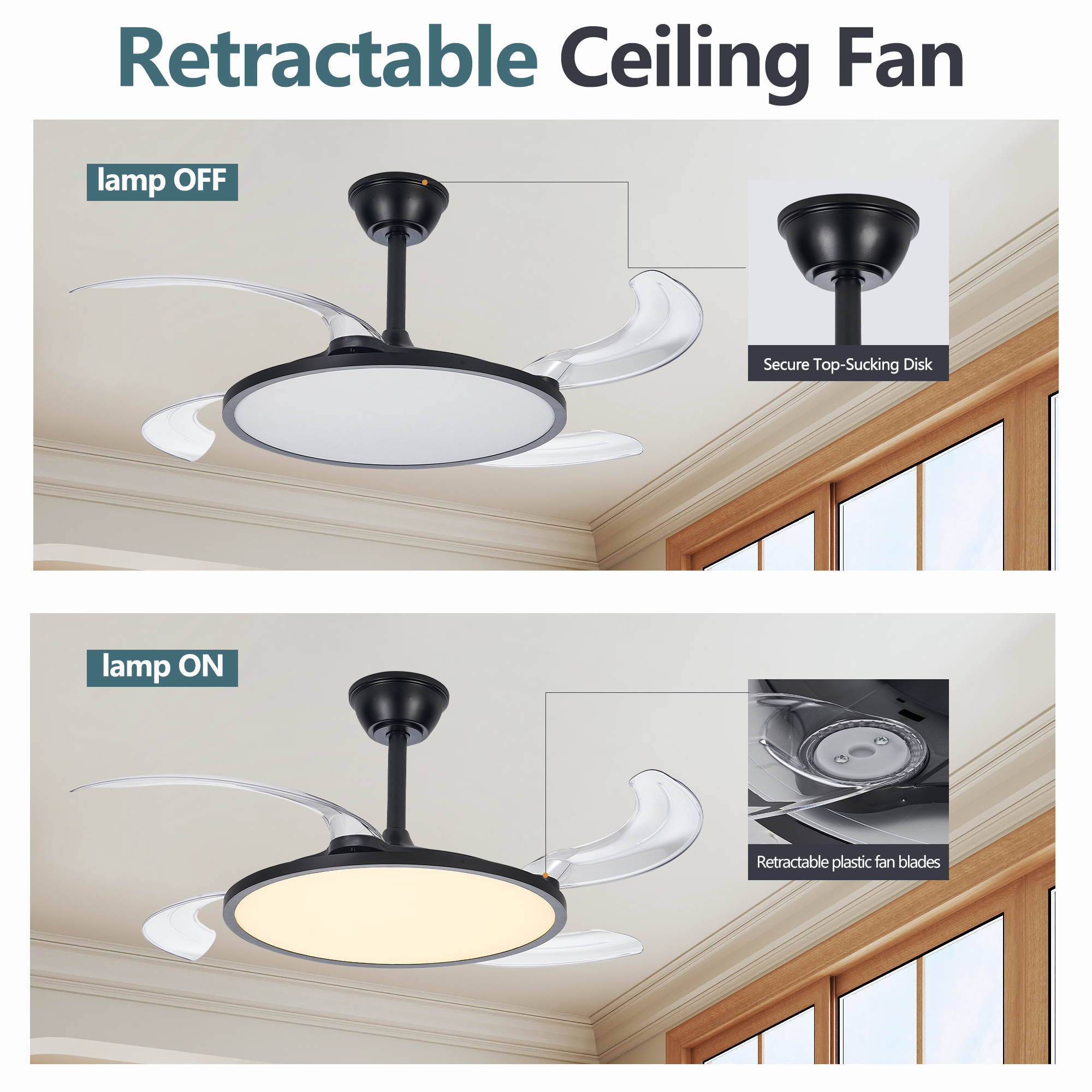 42 Inch Retractable Ceiling Fan,Low Profile Ceiling Fan with Light and Remote,Modern Black Fan with Retractable Blades for Dinning Room Living Room Bedroom,Dimmable,Timer Setting