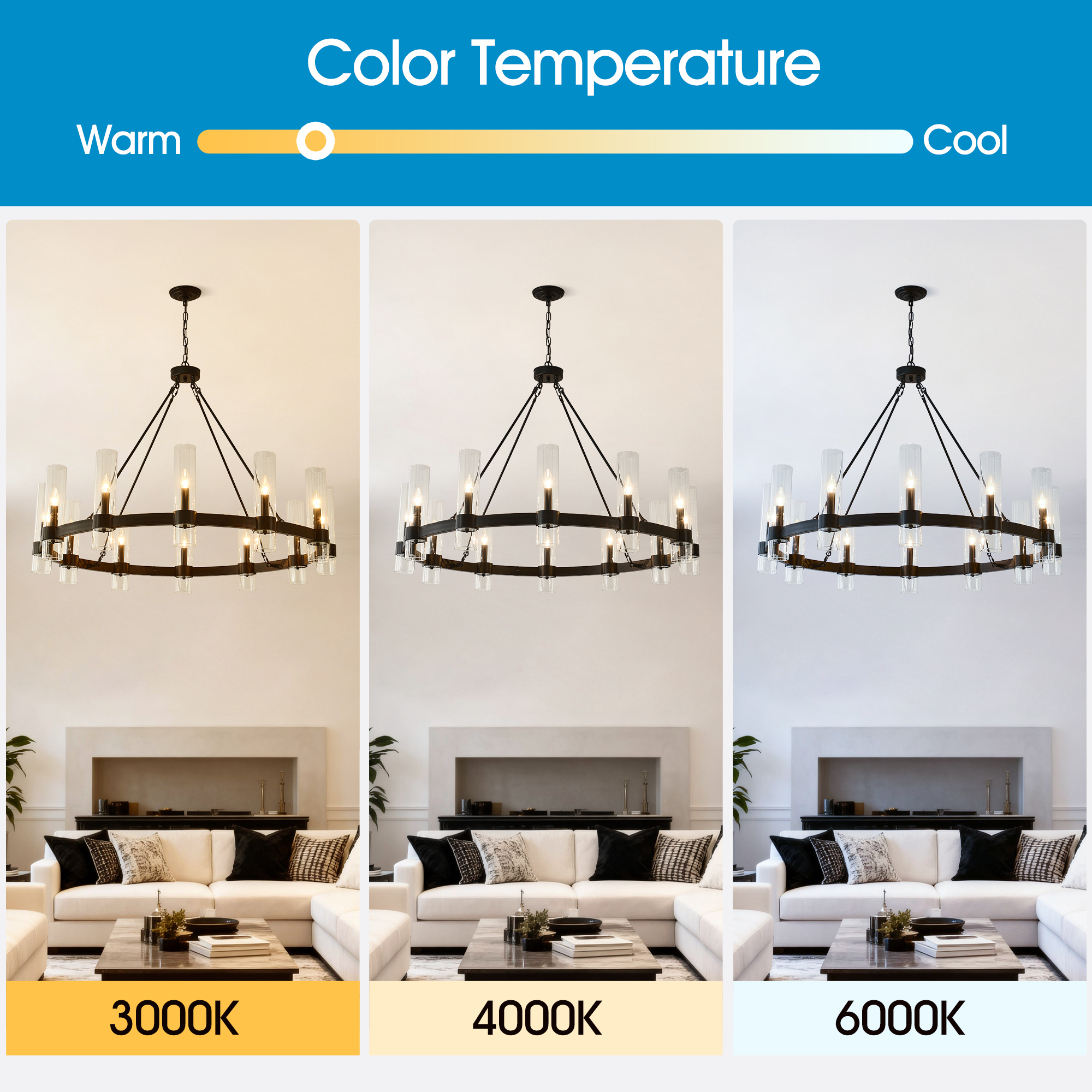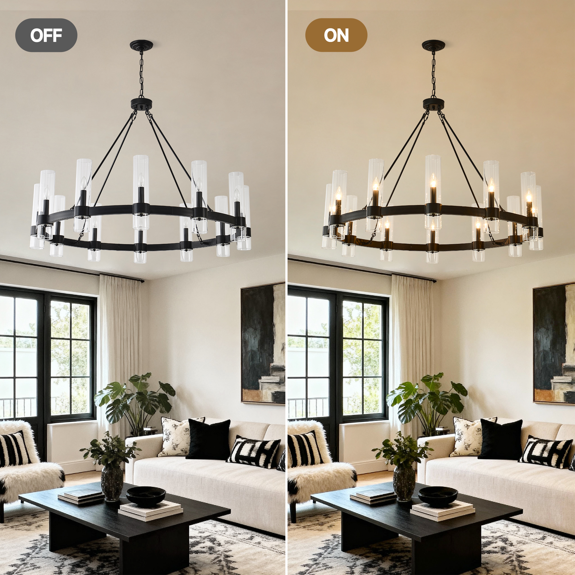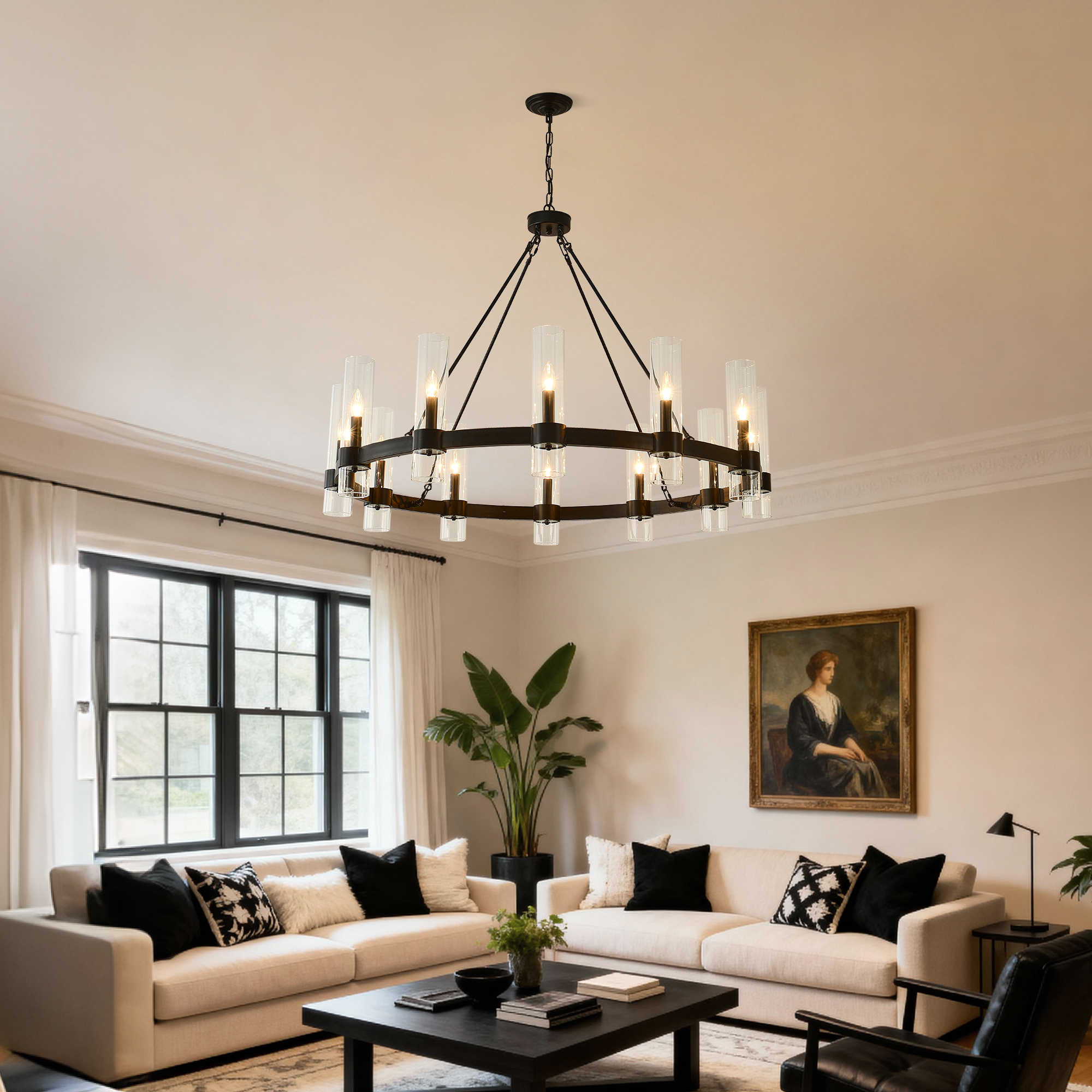 NEOSGO 43.3''Matte Black Wagon Wheel Chandelier With 12 Lights (No Bulbs) is designed to serve as both a lighting source and a decorative focal point within the room. This type of fixture is especially effective above dining tables, in entryways, and in living spaces where the customer wants overhead light with stronger visual impact. The product presentation suggests a style-driven fixture that helps define the ceiling area and gives the space a more elevated, finished character. It is a strong fit for customers who want lighting that contributes to the overall look of the room rather than functioning as a utility piece alone. Overall size is approximately 33.86 x 24.02 x 10.24 inches with a listed weight of 34.1. The current listing includes 6 product images, which help clarify the product shape, proportions, and visual placement in a real room setting.