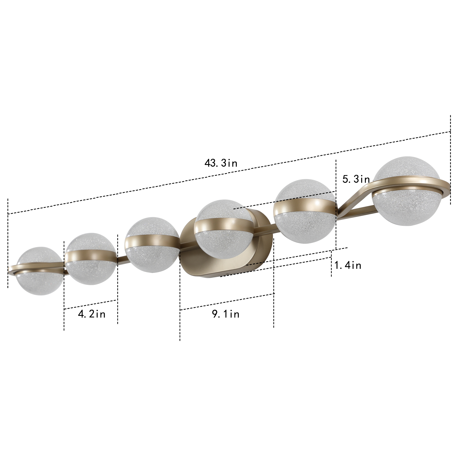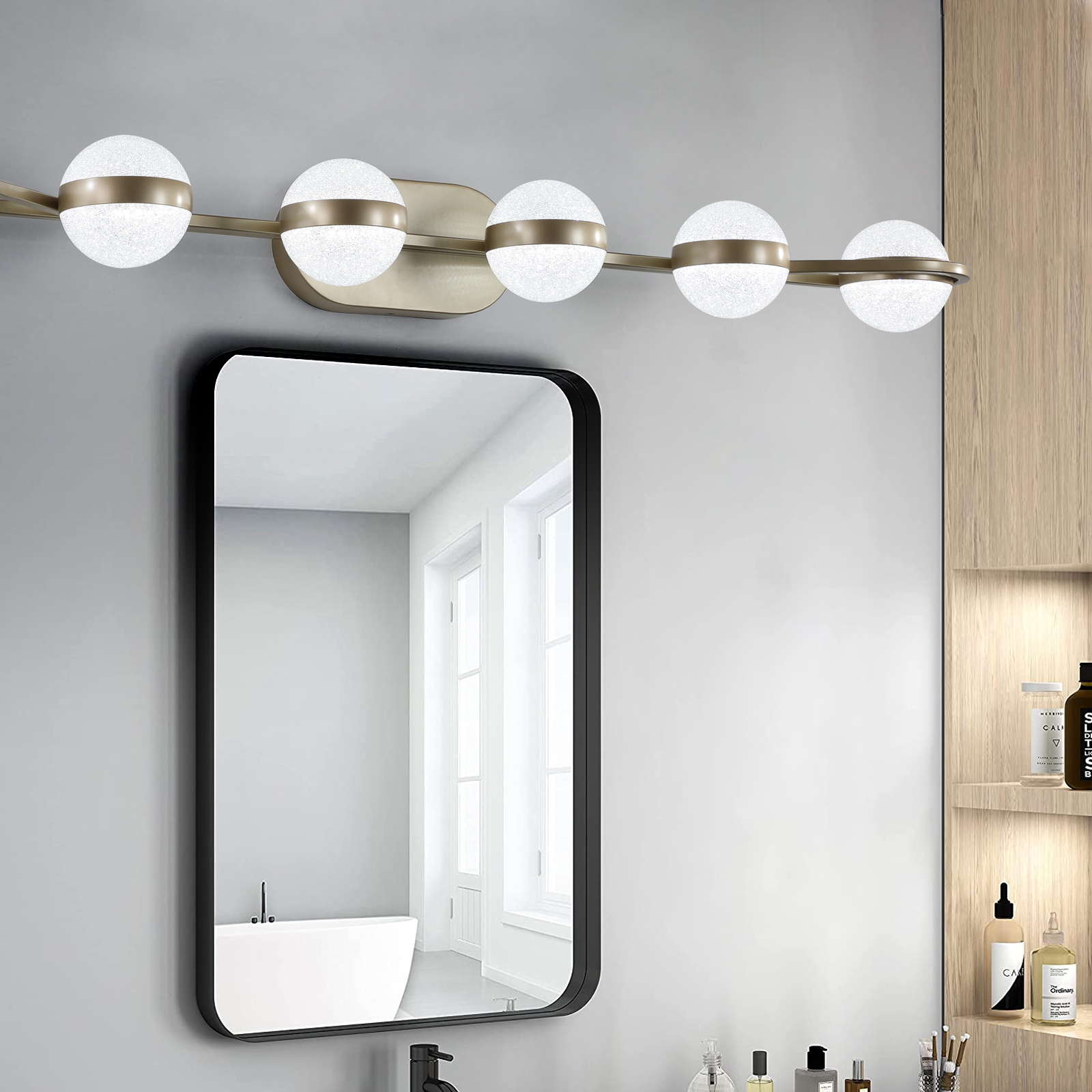 NEOSGO 43" Gold Minimalist LED Bathroom Vanity Light with Crystal Sand Acrylic Shades, 6-Light Wall Mounted Decorative Lighting Fixture, Suitable for Bathroom Vanity Mirror is designed to improve daily bathroom routines with a clearer mirror area and more useful lighting around the vanity space. The product presentation suggests a modern wall-mounted mirror intended for grooming, makeup, skincare, shaving, and other tasks that benefit from more even front-facing light. It works especially well in bathrooms, powder rooms, and remodeled vanity areas where customers want the mirror to provide both practical function and a cleaner visual upgrade. This type of mirror is a strong fit for shoppers looking to make the room feel brighter, more modern, and easier to use every day. Overall size is approximately 47.64 x 9.45 x 7.48 inches with a listed weight of 9.1. The current listing includes 11 product images, which help clarify the product shape, proportions, and visual placement in a real room setting.