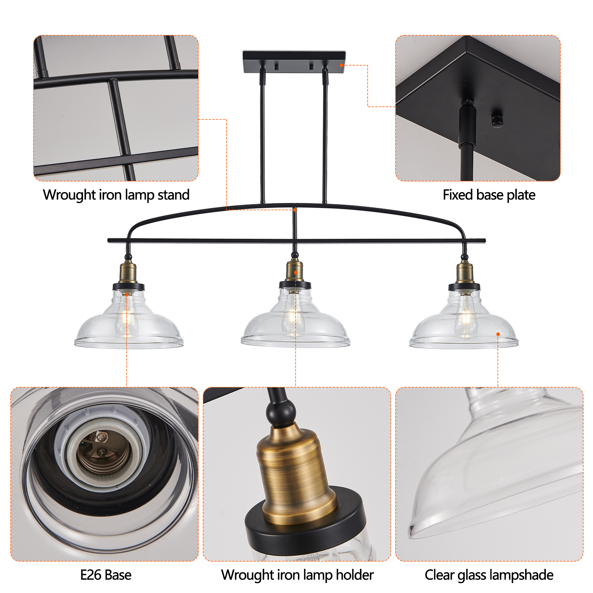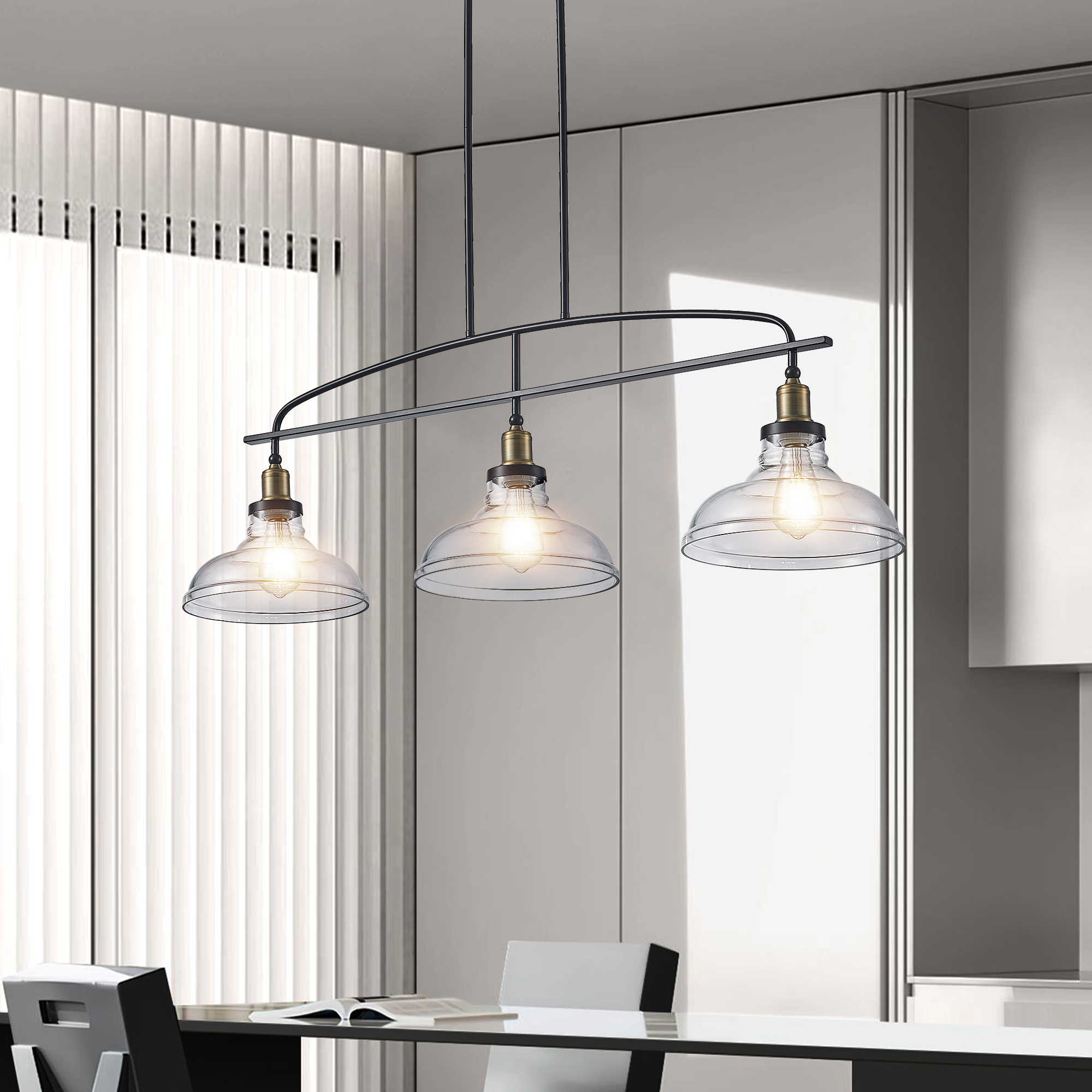 NEOSGO 45" Industrial 3-Light Pendant Chandelier with Clear Glass Shades, Black Metal Frame, Adjustable Height, Modern Farmhouse Lighting for Kitchen Island, Dining Room, or Living Room (Bulb Not Included). Made to bring focused overhead illumination and decorative impact to dining areas, entryways, or other statement spaces. Product dimensions and weight: length 38.9, width 13.7, height 10.4, weight 11.7.