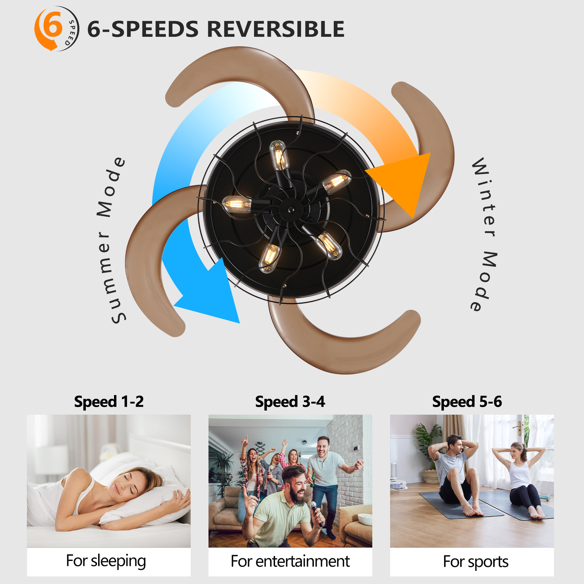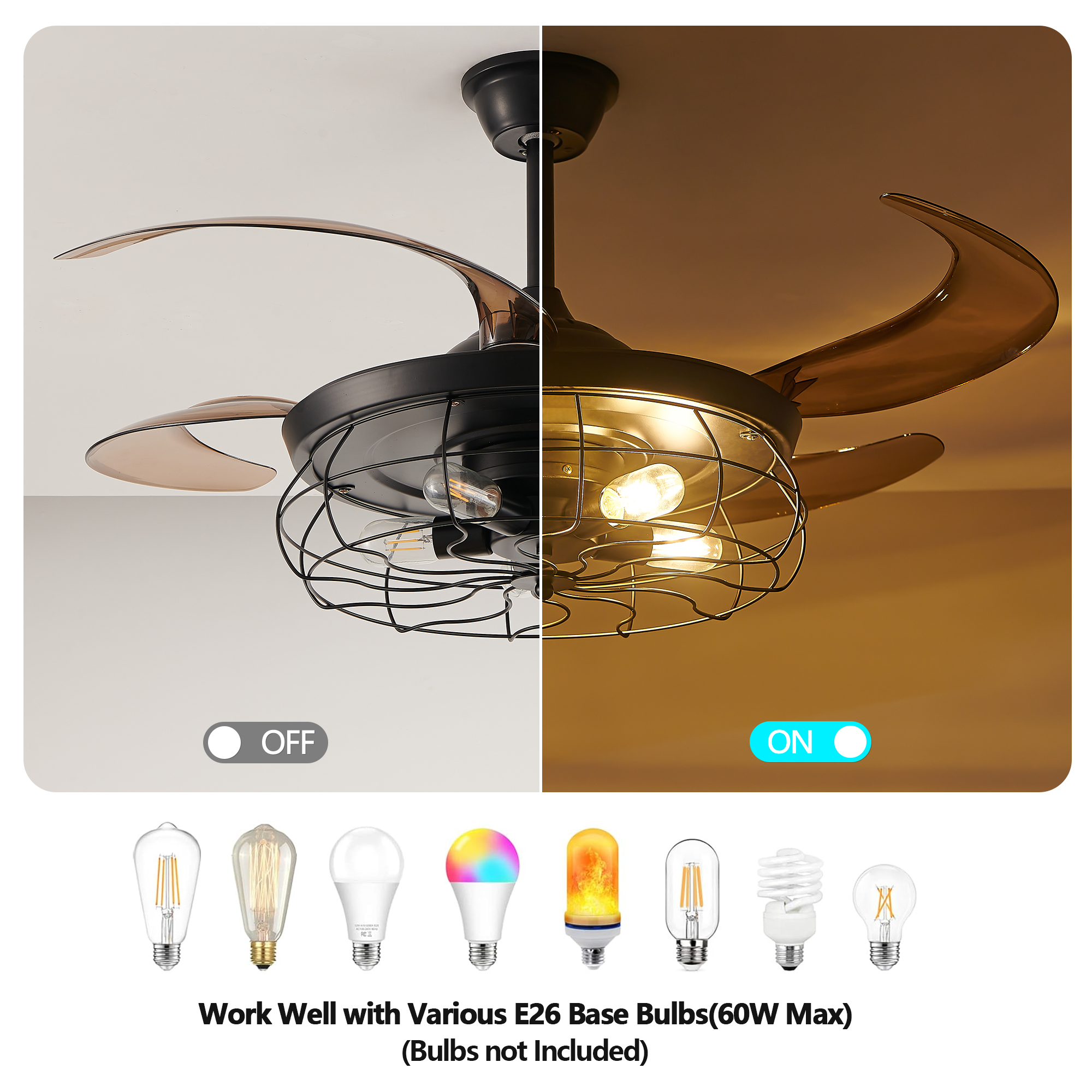 NEOSGO 48" Black Remote Control Ceiling Fan Light – Industrial 4-Blade Fan with Cage Design and Adjustable Speed for Living Room, Bedroom, or Office (Silent/6-Speed/Reversible/DC Motor) (Bulb Not Included) combines ceiling lighting and airflow in one fixture, making it useful for rooms that need everyday comfort as well as a more finished overhead look. The caged or close-to-ceiling style shown in the product presentation helps it work well in spaces where customers want decorative character without the visual bulk of a larger hanging fixture. It is well suited for kitchens, dining rooms, bedrooms, living areas, and similar spaces where air movement, ambient light, and a coordinated design all matter. This is a practical choice for customers who want to save ceiling space while improving comfort and keeping the room visually polished. Overall size is approximately 21.26 x 21.26 x 10.63 inches with a listed weight of 19.6. The current listing includes 12 product images, which help clarify the product shape, proportions, and visual placement in a real room setting.