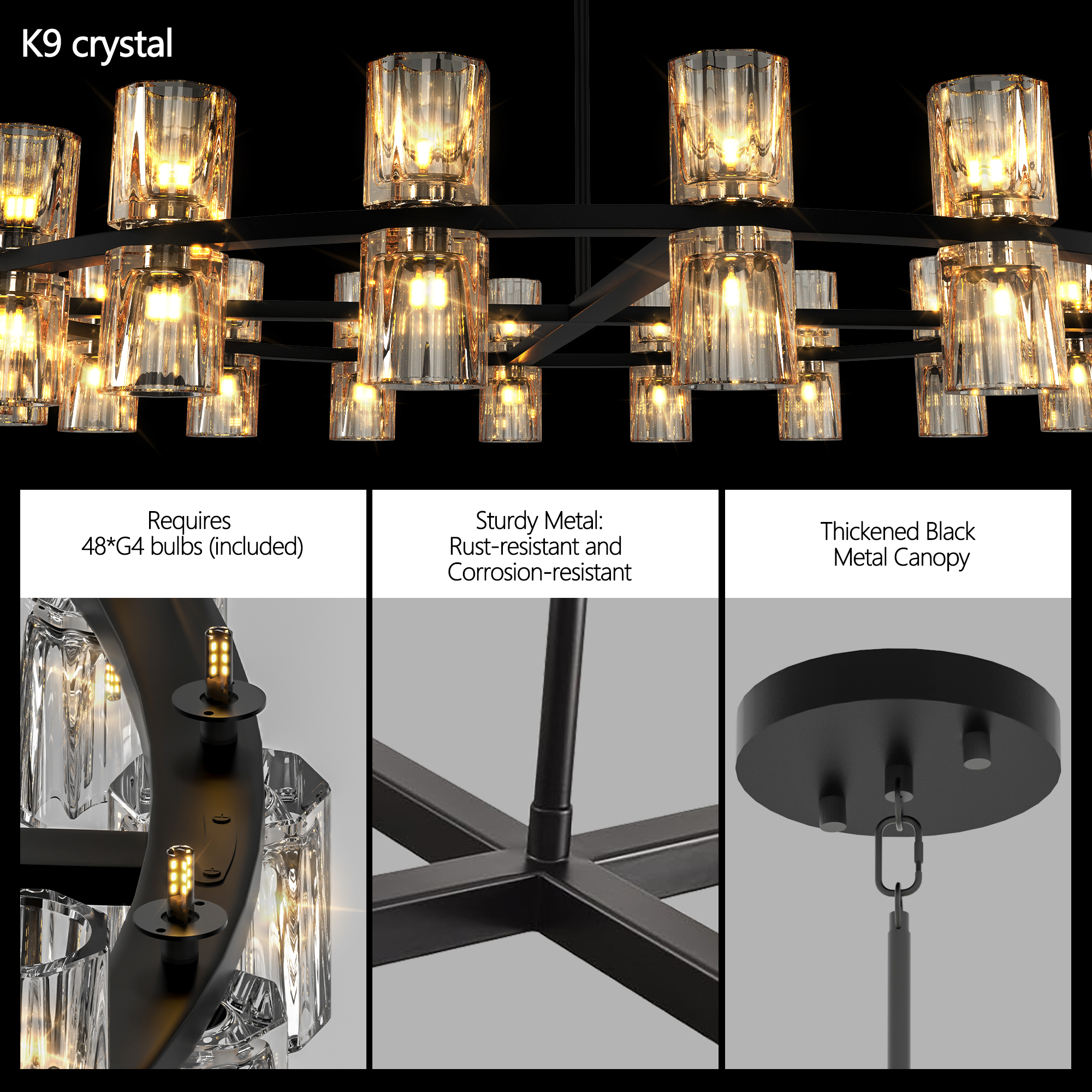 NEOSGO 48 Inches Luxury Chandeliers Crystal Living Room Decorative Lights Simple Modern Dining Room LED Lighting,for Home Decor (Bulbs Included) Black is designed to serve as both a lighting source and a decorative focal point within the room. This type of fixture is especially effective above dining tables, in entryways, and in living spaces where the customer wants overhead light with stronger visual impact. The product presentation suggests a style-driven fixture that helps define the ceiling area and gives the space a more elevated, finished character. It is a strong fit for customers who want lighting that contributes to the overall look of the room rather than functioning as a utility piece alone. Overall size is approximately 50 x 50 x 5.9 inches with a listed weight of 71.6. The current listing includes 9 product images, which help clarify the product shape, proportions, and visual placement in a real room setting.