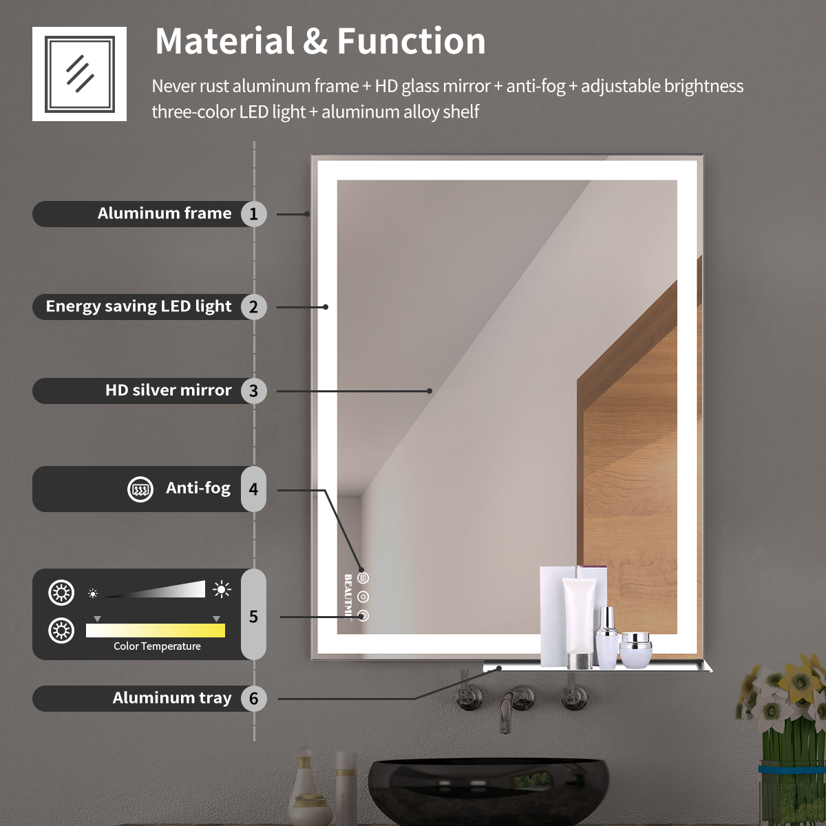 30x36 inch LED Bathroom Vanity Mirror Wall Mounted Adjustable White/Warm/Natural Lights Anti-Fog Touch Switch with Memory Modern Smart Large Bathroom Mirrors