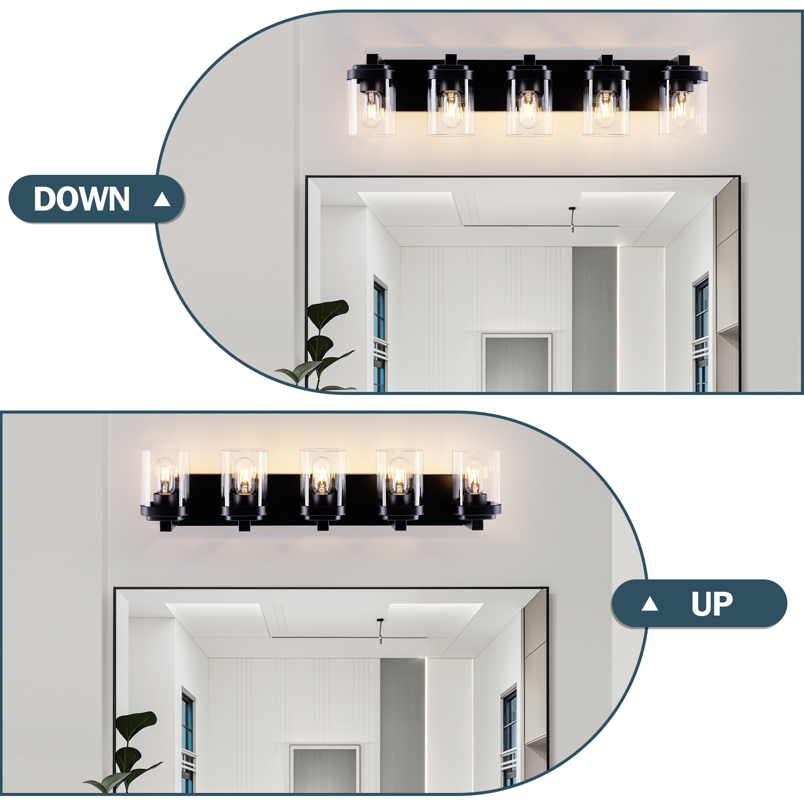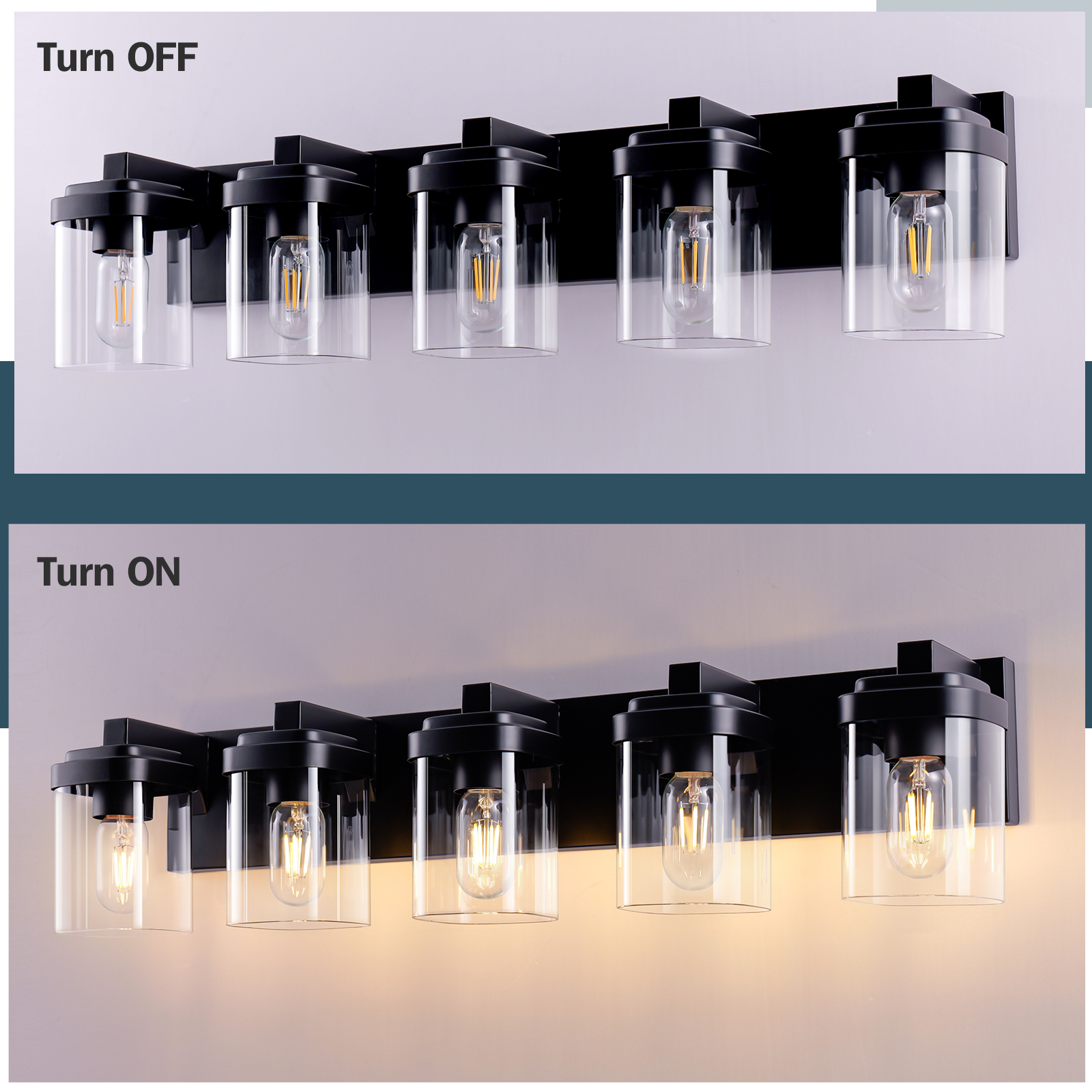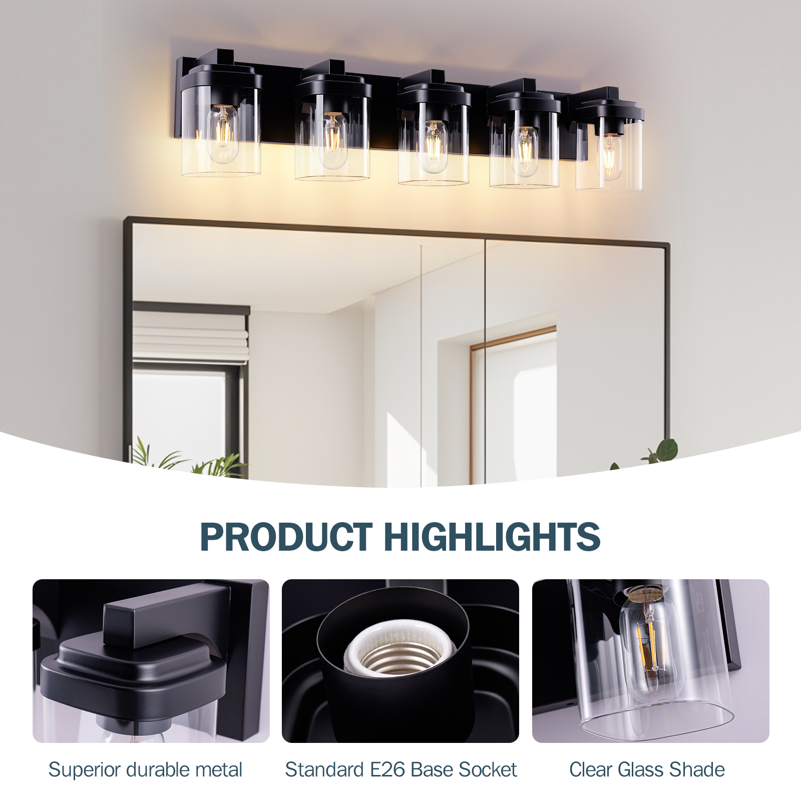 NEOSGO 5 Light Bathroom Vanity Light, Matte Black Bathroom Light Fixtures with Clear Glass Shade, Vanity Light Fixtures Over Mirror for Bedroom Living Room(NO BULBS) is designed to improve daily bathroom routines with a clearer mirror area and more useful lighting around the vanity space. The product presentation suggests a modern wall-mounted mirror intended for grooming, makeup, skincare, shaving, and other tasks that benefit from more even front-facing light. It works especially well in bathrooms, powder rooms, and remodeled vanity areas where customers want the mirror to provide both practical function and a cleaner visual upgrade. This type of mirror is a strong fit for shoppers looking to make the room feel brighter, more modern, and easier to use every day. Overall size is approximately 34.3 x 10.2 x 8.5 inches with a listed weight of 9.7. The current listing includes 7 product images, which help clarify the product shape, proportions, and visual placement in a real room setting.