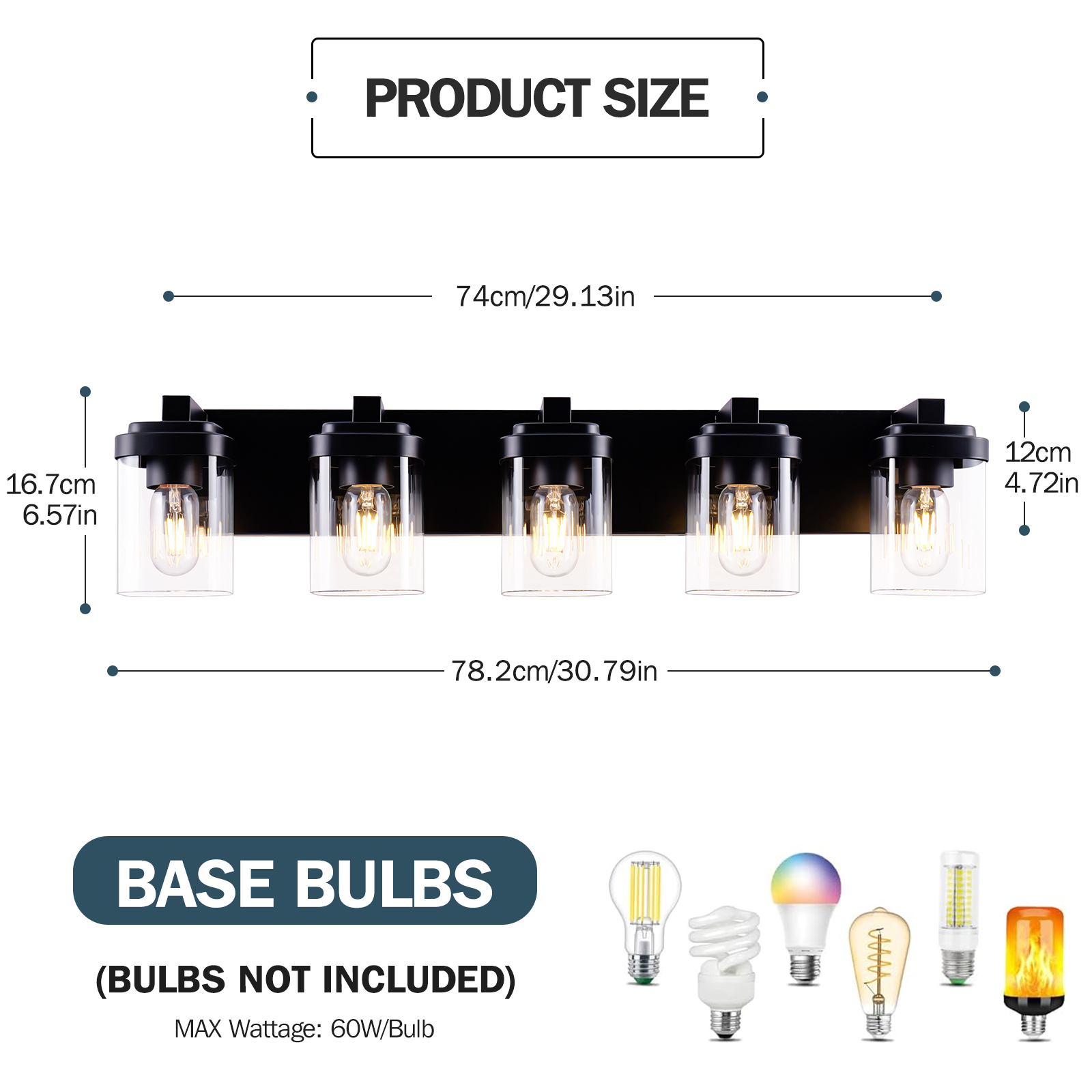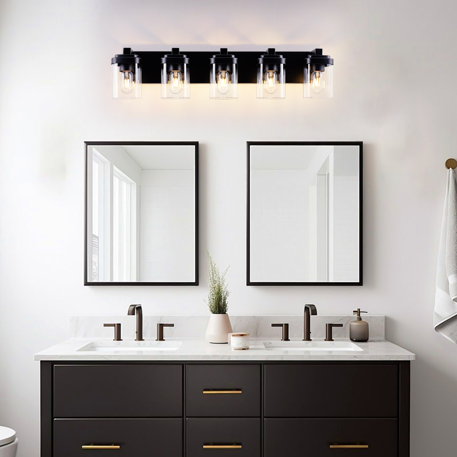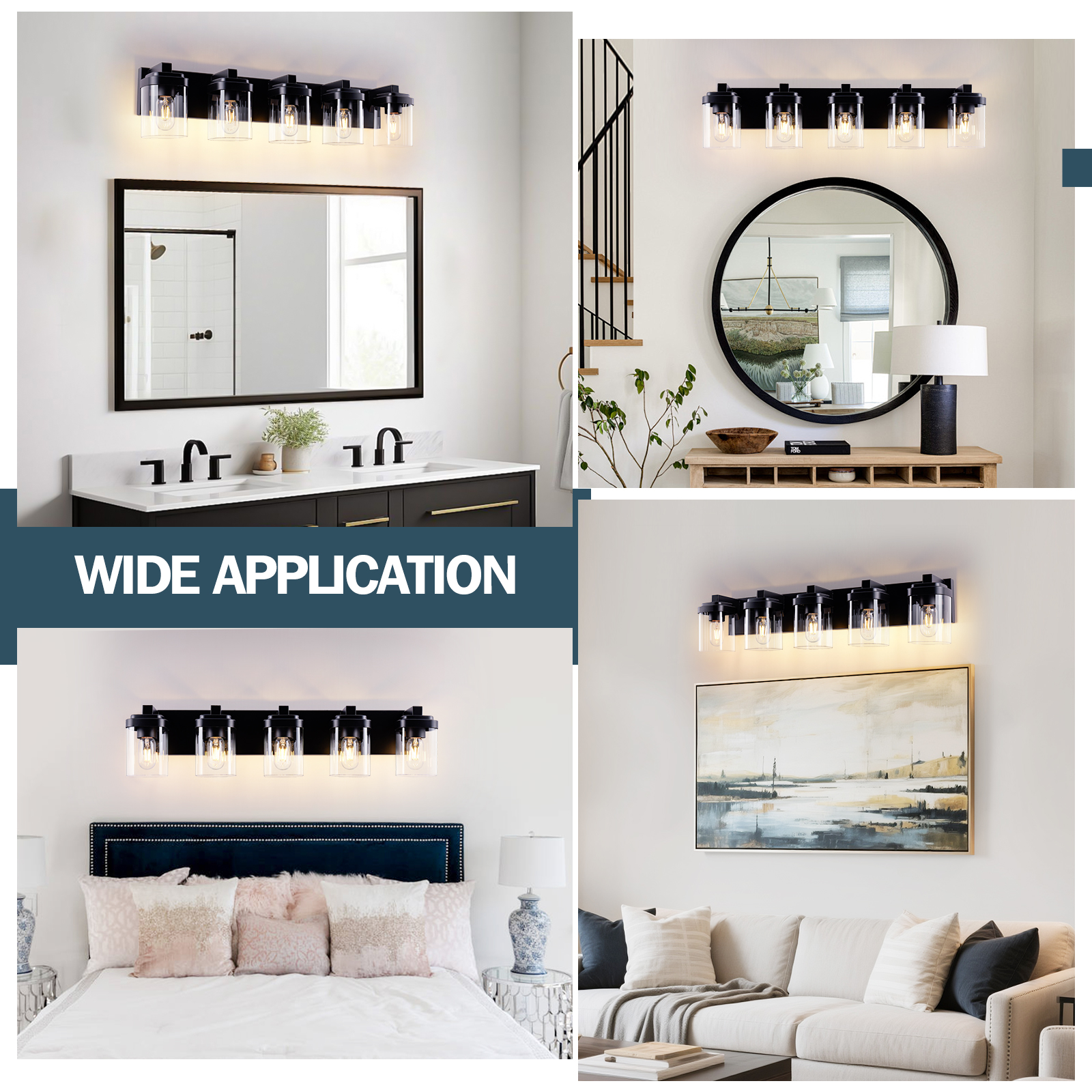 NEOSGO 5 Light Bathroom Vanity Light, Matte Black Bathroom Light Fixtures with Clear Glass Shade, Vanity Light Fixtures Over Mirror for Bedroom Living Room(NO BULBS) is designed to improve daily bathroom routines with a clearer mirror area and more useful lighting around the vanity space. The product presentation suggests a modern wall-mounted mirror intended for grooming, makeup, skincare, shaving, and other tasks that benefit from more even front-facing light. It works especially well in bathrooms, powder rooms, and remodeled vanity areas where customers want the mirror to provide both practical function and a cleaner visual upgrade. This type of mirror is a strong fit for shoppers looking to make the room feel brighter, more modern, and easier to use every day. Overall size is approximately 34.3 x 10.2 x 8.5 inches with a listed weight of 9.7. The current listing includes 7 product images, which help clarify the product shape, proportions, and visual placement in a real room setting.