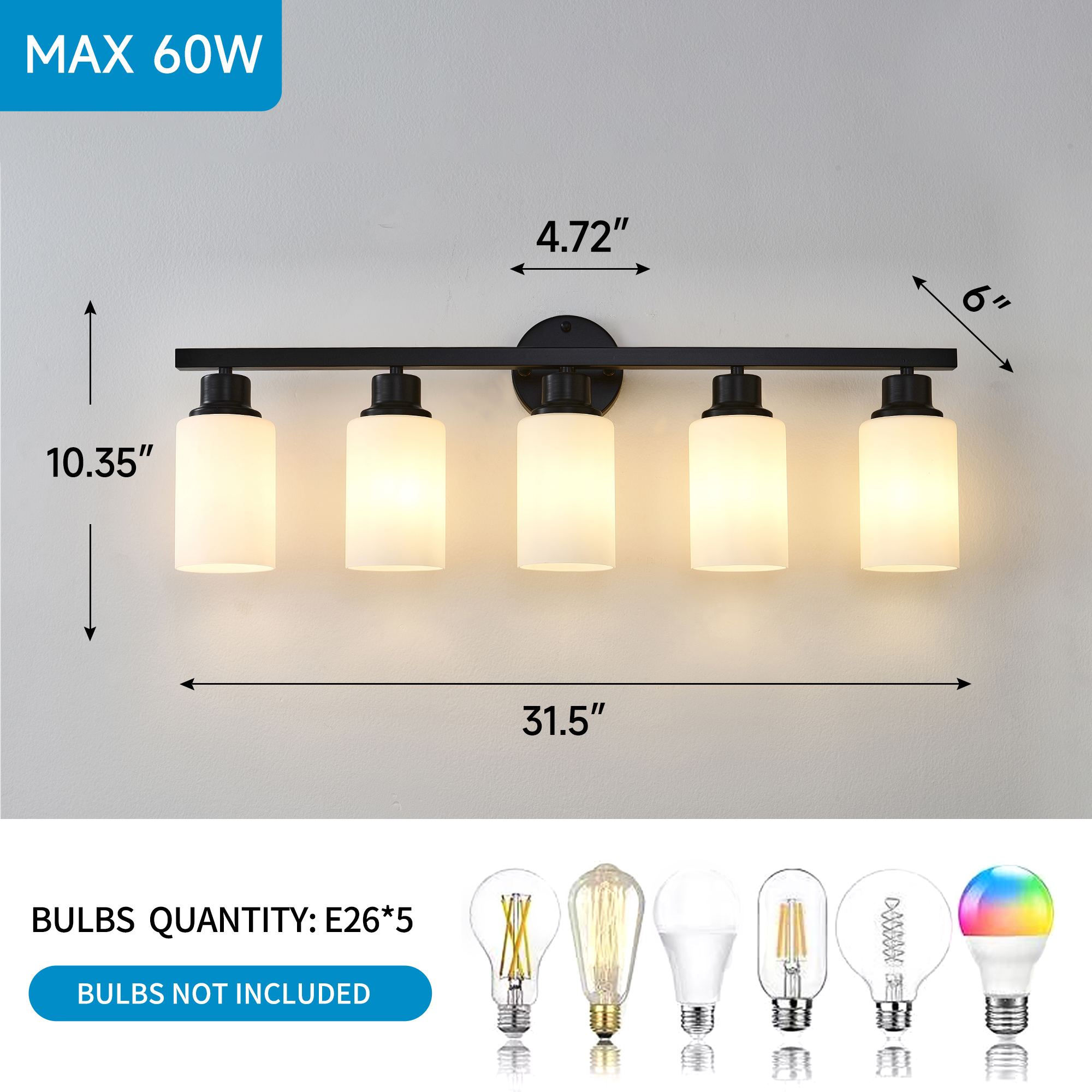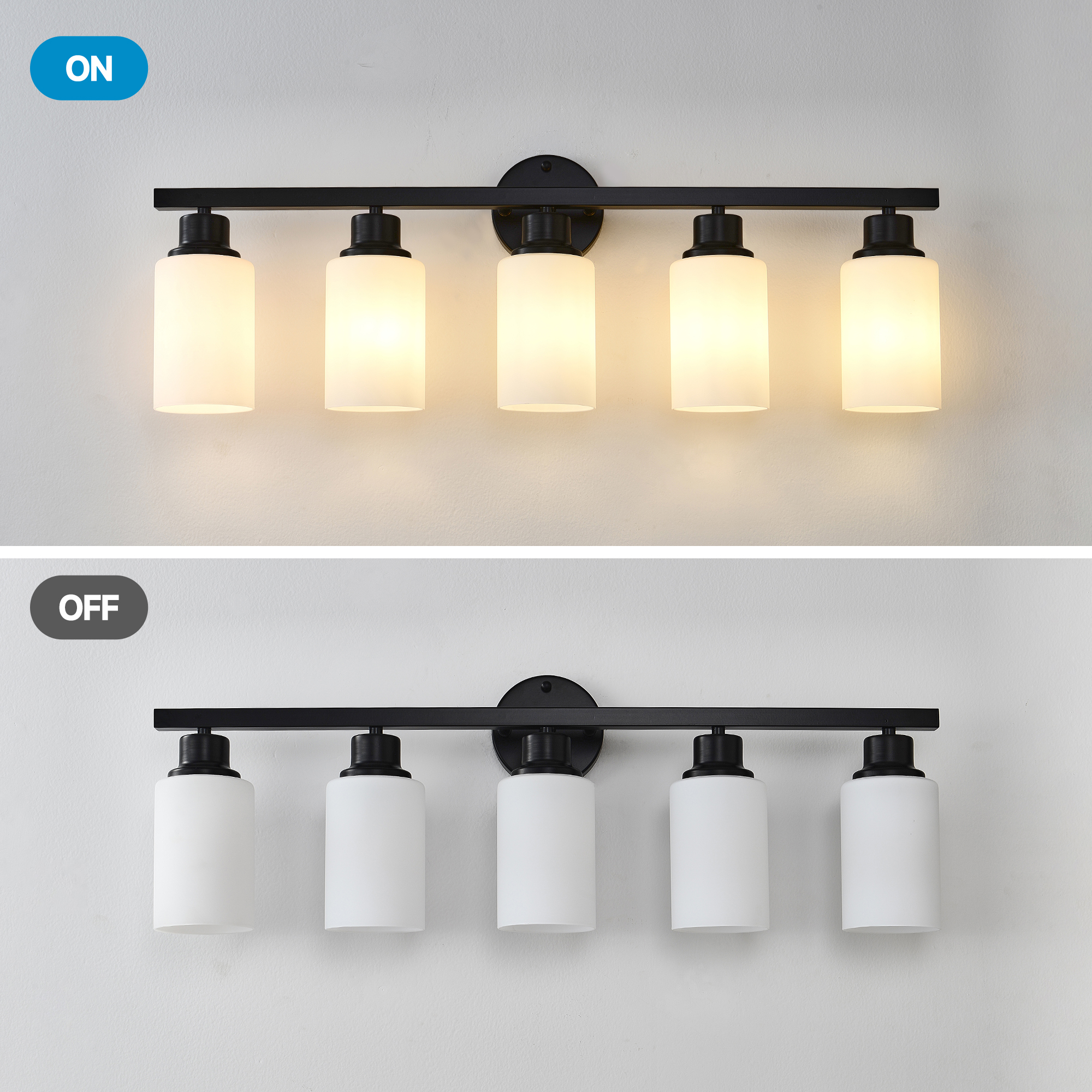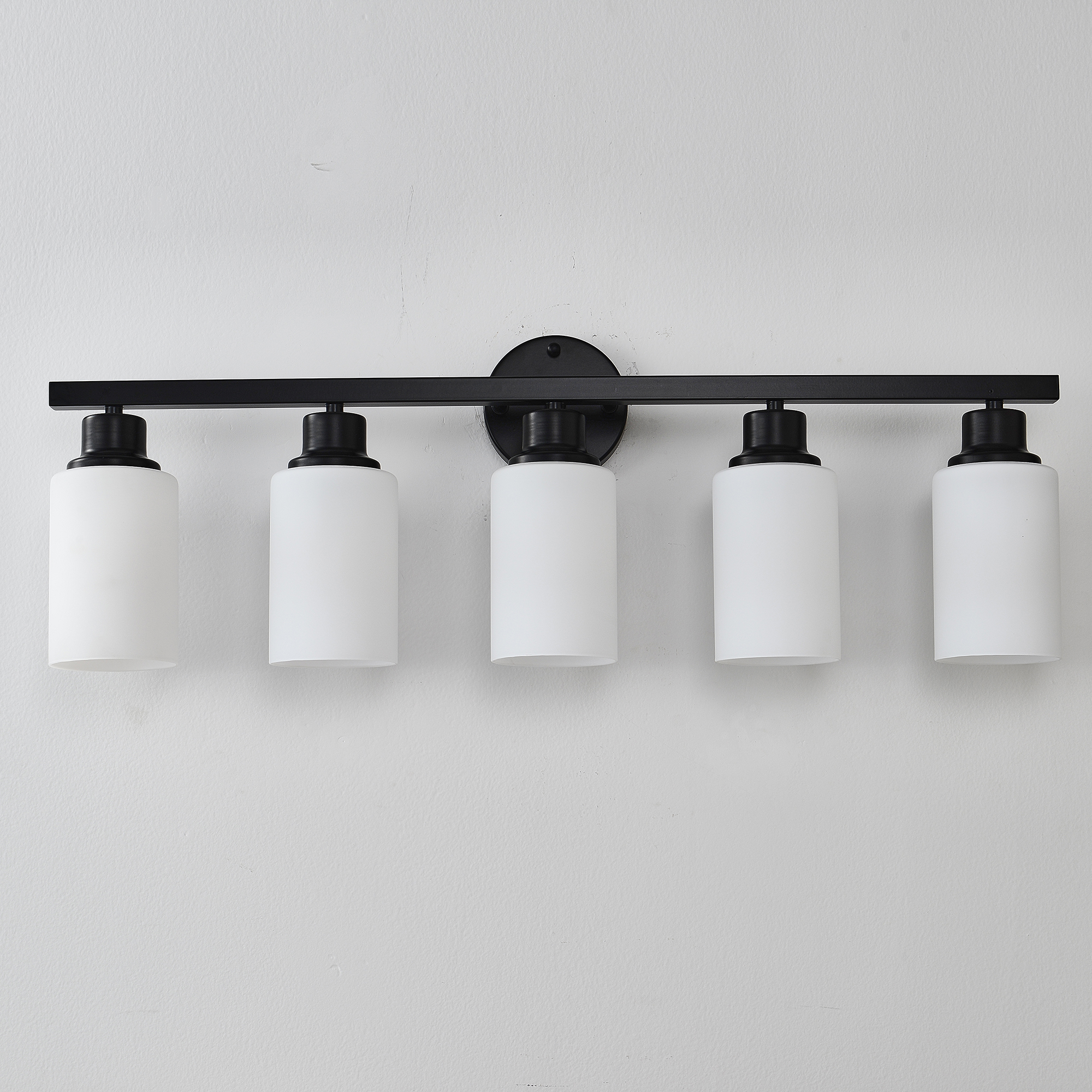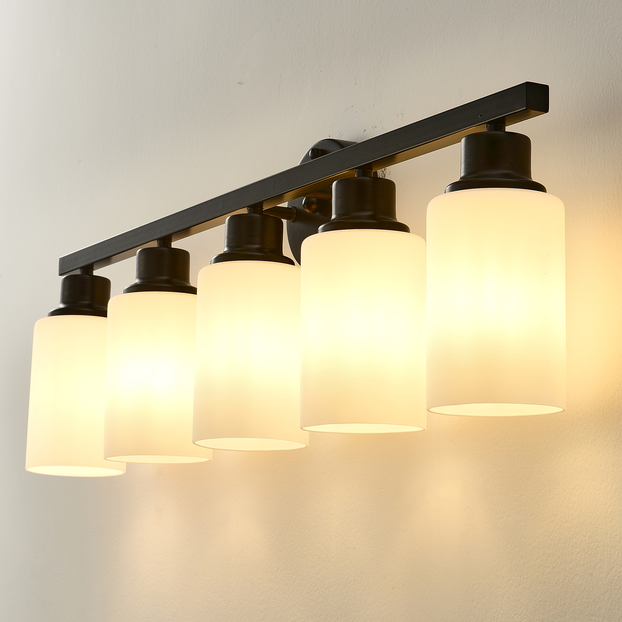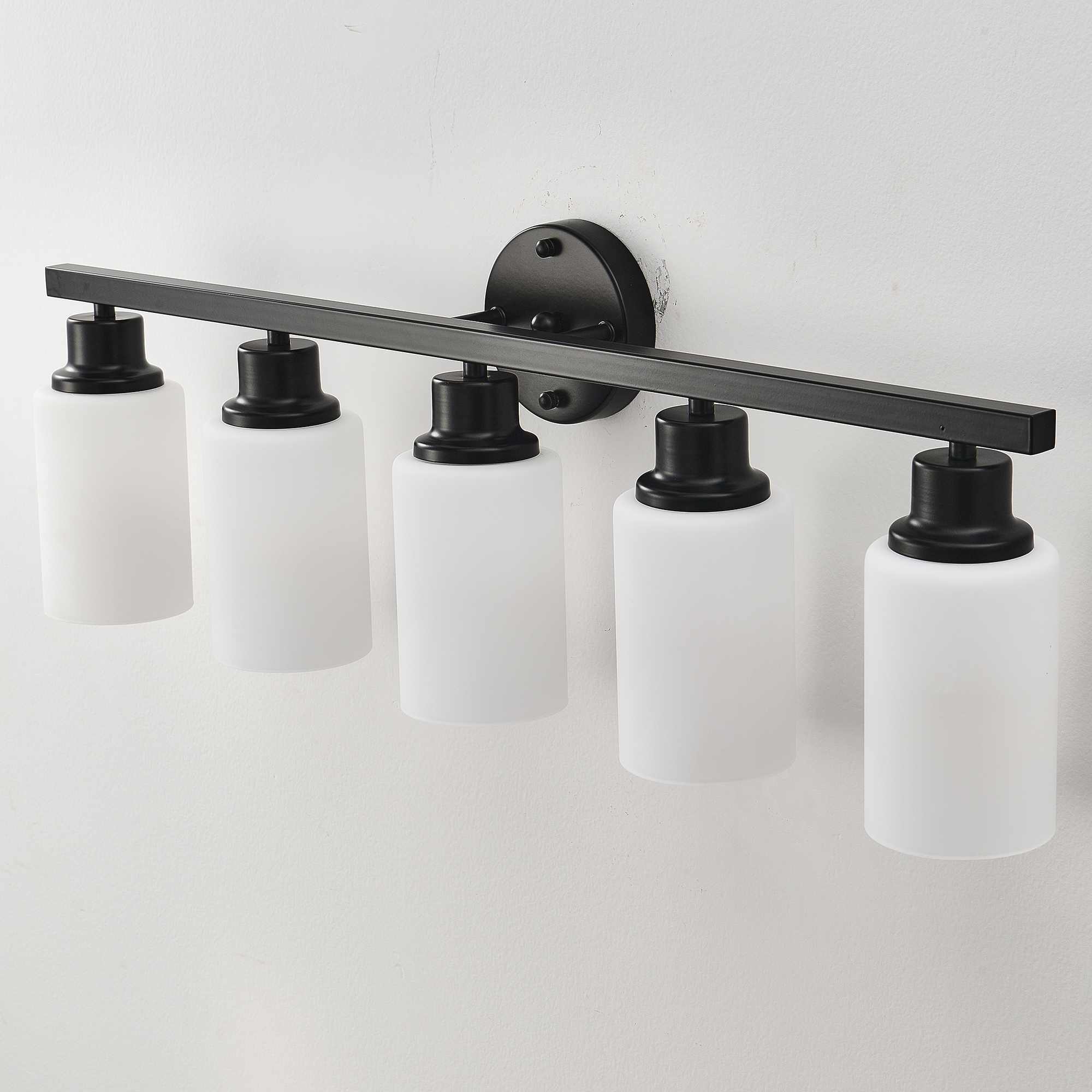 NEOSGO 5-Light Matte Black Wall Lamps with White Glass Shades (No Bulbs) Sconce Lighting for Bedroom Living Room is intended to provide focused wall lighting while also adding decorative detail to the surrounding space. This style is especially useful near mirrors, over bathroom vanities, along hallways, in bedrooms, or in accent areas that benefit from directed light rather than relying only on ceiling fixtures. Based on the product presentation, it offers a practical mix of daily illumination and visual styling, which helps the room feel more complete and intentionally designed. It is a good option for customers who want better task lighting together with a more refined finished look on the wall. Overall size is approximately 33.86 x 7.09 x 10.83 inches with a listed weight of 8.8. The current listing includes 12 product images, which help clarify the product shape, proportions, and visual placement in a real room setting.