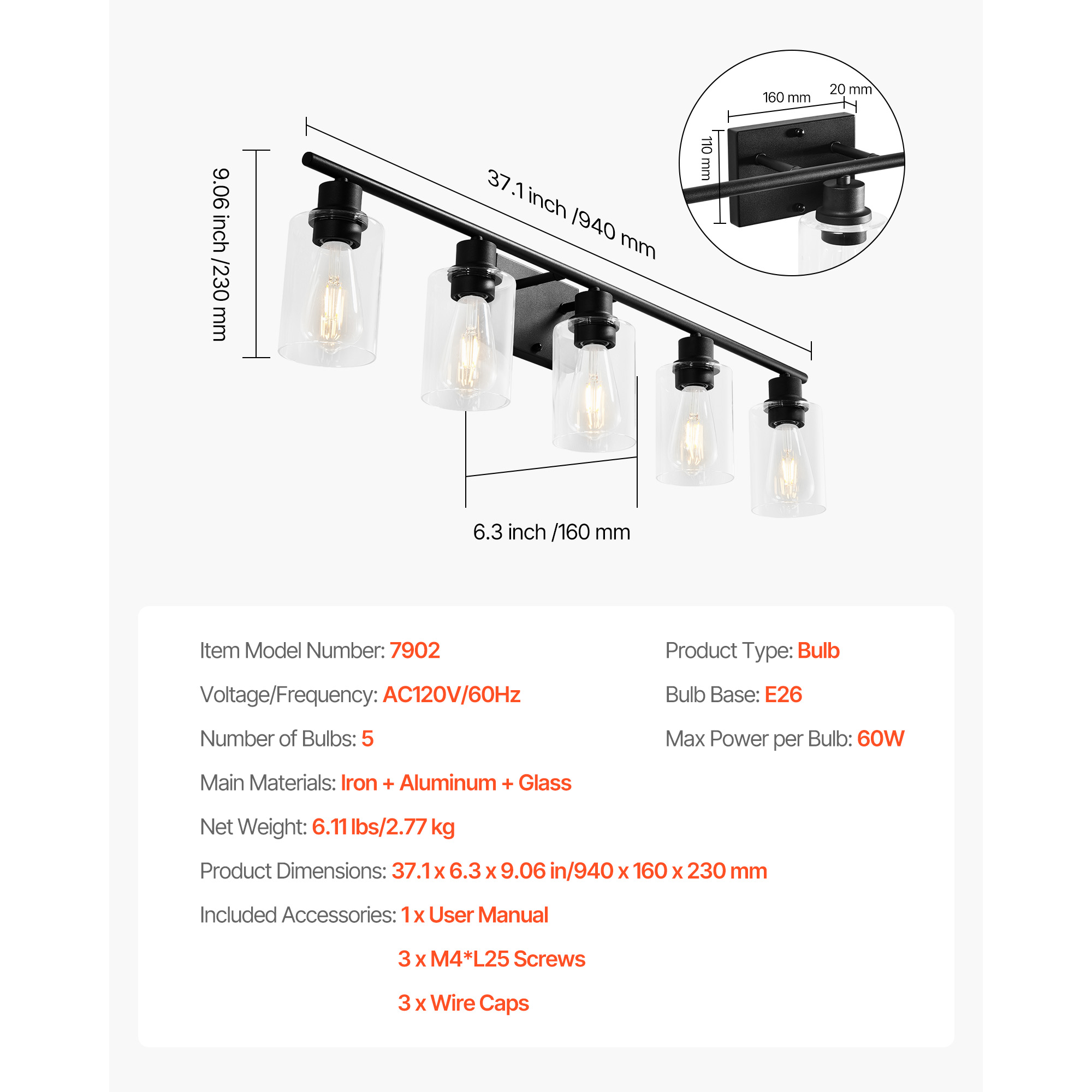 5-Light Modern Bathroom Vanity Light 37.1-Inch Wall Light Fixtures Over Mirror