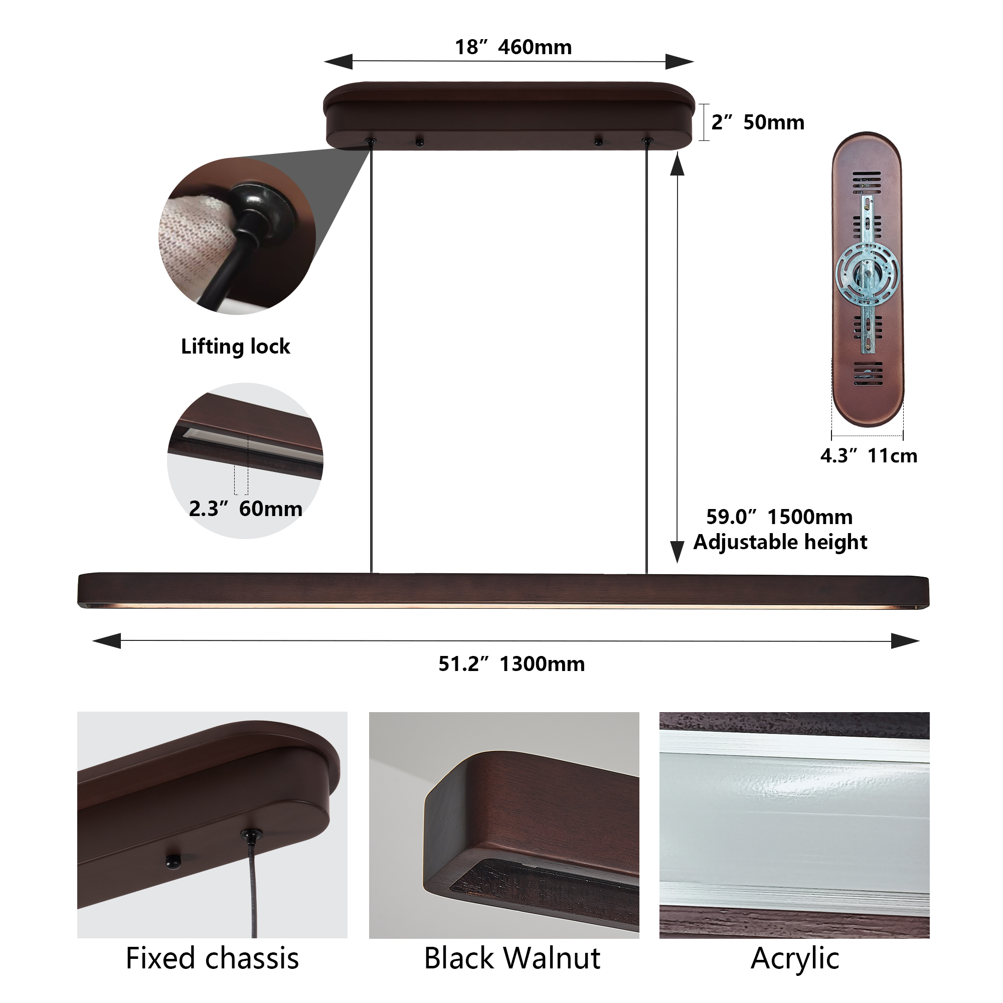 51-inch Walnut Wood Modern LED Pendant Light, Adjustable Hanging Light for Dining Room, Kitchen, Living Room – Sleek Walnut Color Finish