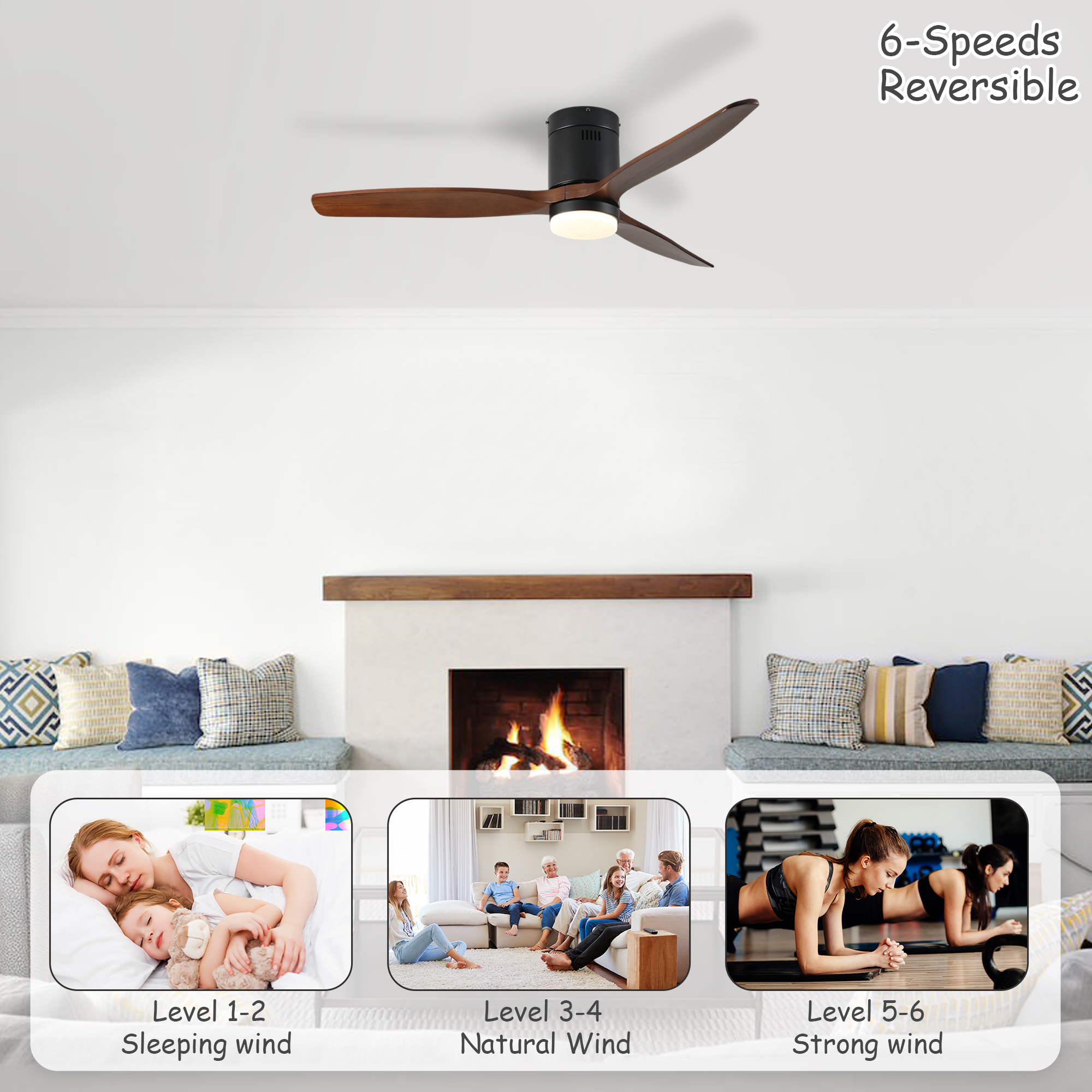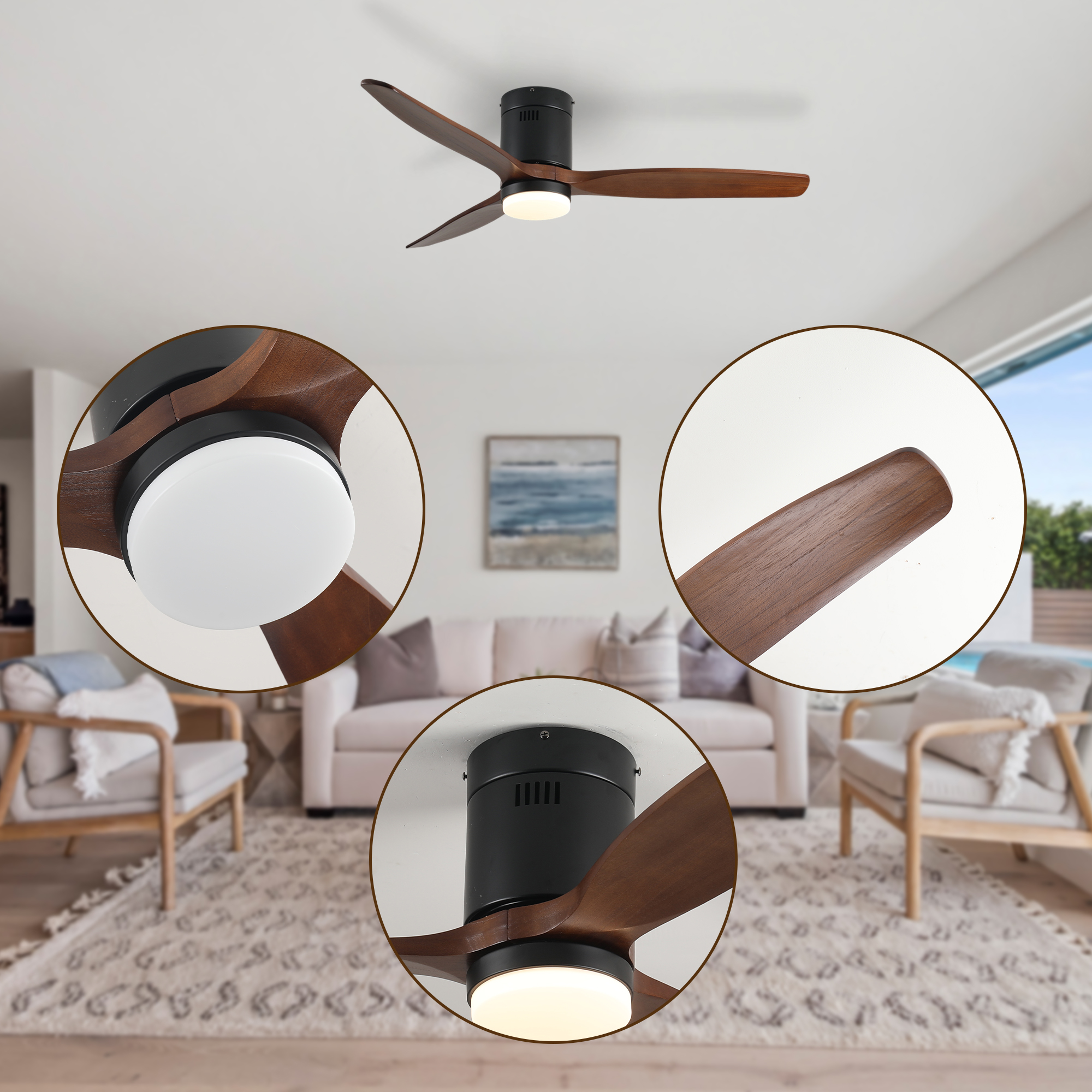 NEOSGO 52 Inch Ceiling Fan with Light, 3 Dark Walnut Solid Wood Blades,Remote Control,6-speed Reversible DC Motor for Bed Room,Dining Room,Living Room. combines ceiling lighting and airflow in one fixture, making it useful for rooms that need everyday comfort as well as a more finished overhead look. The caged or close-to-ceiling style shown in the product presentation helps it work well in spaces where customers want decorative character without the visual bulk of a larger hanging fixture. It is well suited for kitchens, dining rooms, bedrooms, living areas, and similar spaces where air movement, ambient light, and a coordinated design all matter. This is a practical choice for customers who want to save ceiling space while improving comfort and keeping the room visually polished. Overall size is approximately 34.84 x 8.46 x 8.46 inches with a listed weight of 12.79. The current listing includes 9 product images, which help clarify the product shape, proportions, and visual placement in a real room setting.