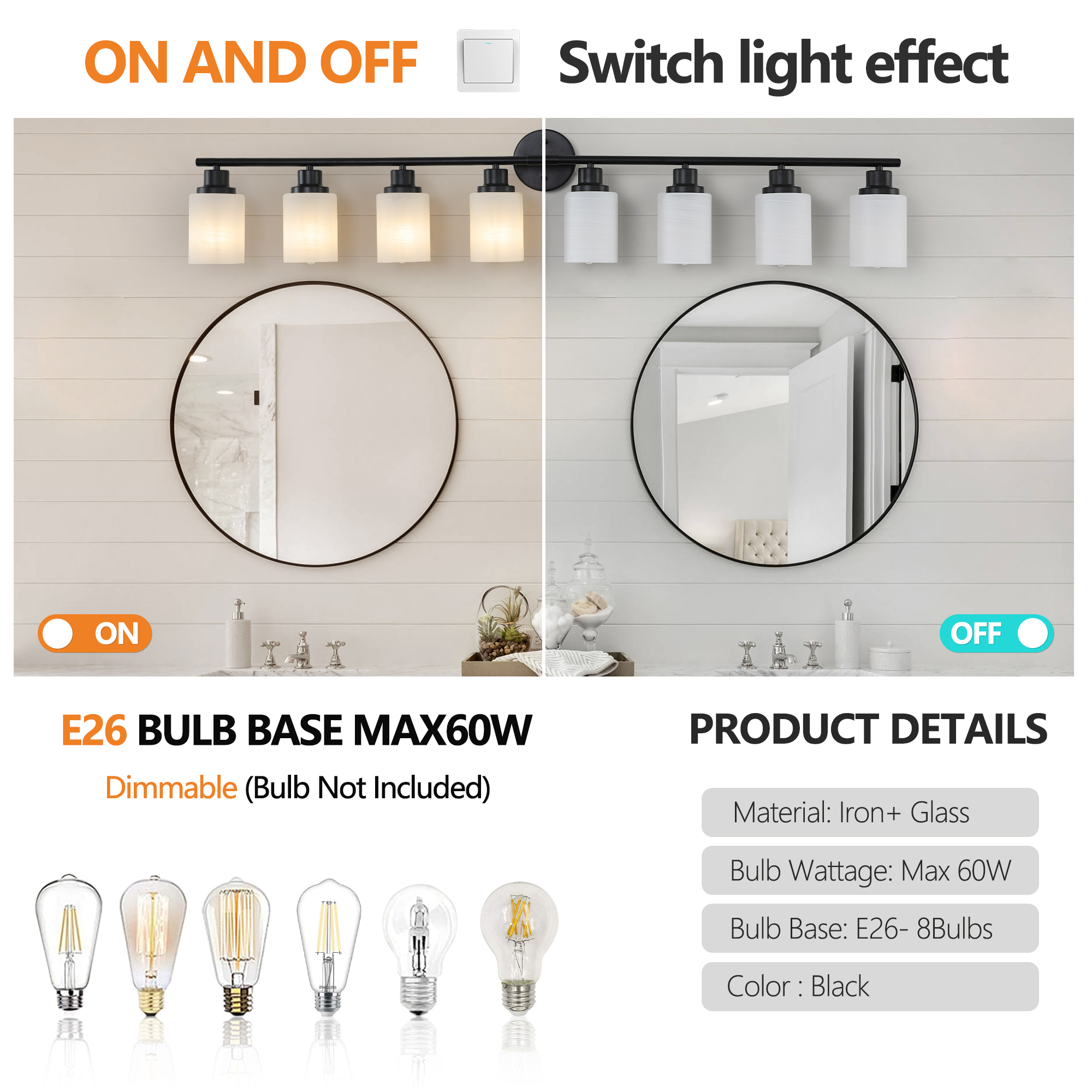NEOSGO 52" Modern 8-Light Vanity Bathroom Mirror Light, Frosted White Glass with Black Iron Frame, Contemporary Wall Sconce for Bedroom, Bathroom, and Dressing Room (Bulb Not Included) is designed to improve daily bathroom routines with a clearer mirror area and more useful lighting around the vanity space. The product presentation suggests a modern wall-mounted mirror intended for grooming, makeup, skincare, shaving, and other tasks that benefit from more even front-facing light. It works especially well in bathrooms, powder rooms, and remodeled vanity areas where customers want the mirror to provide both practical function and a cleaner visual upgrade. This type of mirror is a strong fit for shoppers looking to make the room feel brighter, more modern, and easier to use every day. Overall size is approximately 27.2 x 14.6 x 8.3 inches with a listed weight of 9.9. The current listing includes 9 product images, which help clarify the product shape, proportions, and visual placement in a real room setting.
