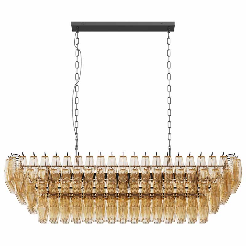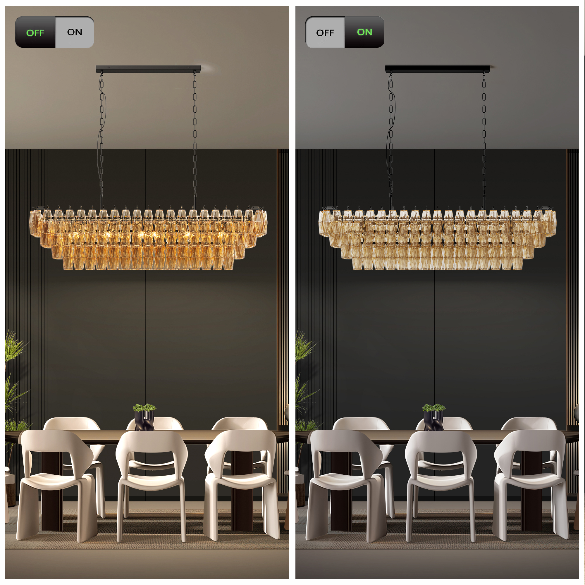 NEOSGO 54" Black Rectangular Chandeliers for Dining Room, 12-Light 4 Tiered Large Smoke Glass Chandelier, Modern Kitchen Island Farmhouse Hanging Light Fixture for Living Room Foyer(Bulb not included) is designed to serve as both a lighting source and a decorative focal point within the room. This type of fixture is especially effective above dining tables, in entryways, and in living spaces where the customer wants overhead light with stronger visual impact. The product presentation suggests a style-driven fixture that helps define the ceiling area and gives the space a more elevated, finished character. It is a strong fit for customers who want lighting that contributes to the overall look of the room rather than functioning as a utility piece alone. Overall size is approximately 55.1 x 23.6 x 18.5 inches with a listed weight of 95.6. The current listing includes 10 product images, which help clarify the product shape, proportions, and visual placement in a real room setting.