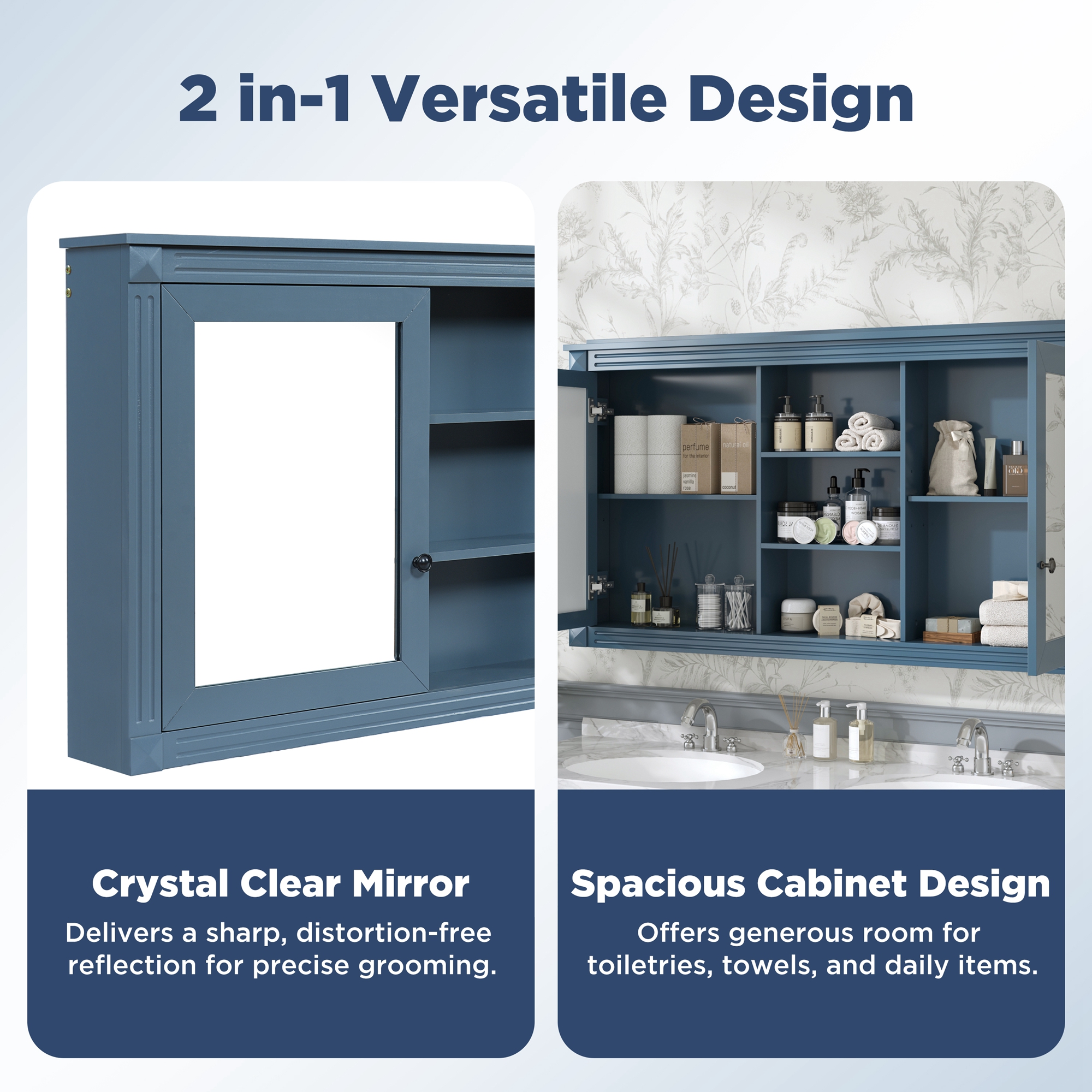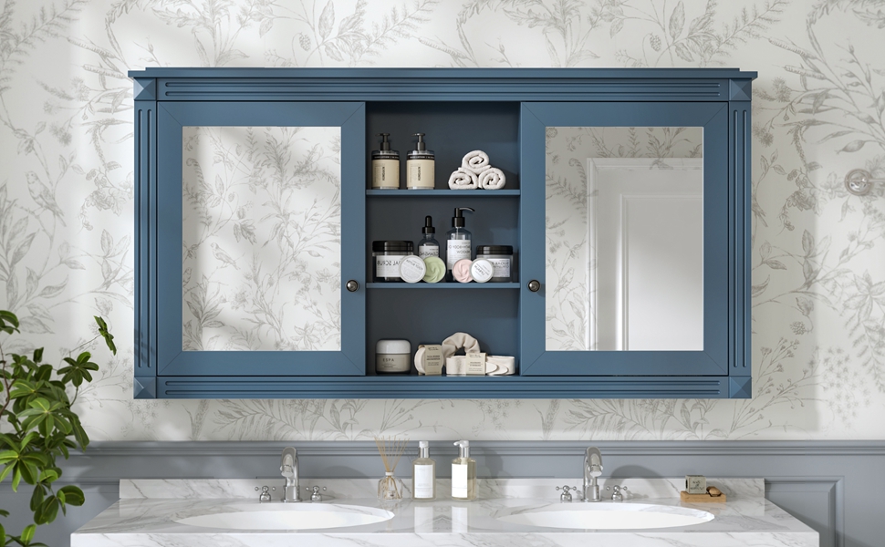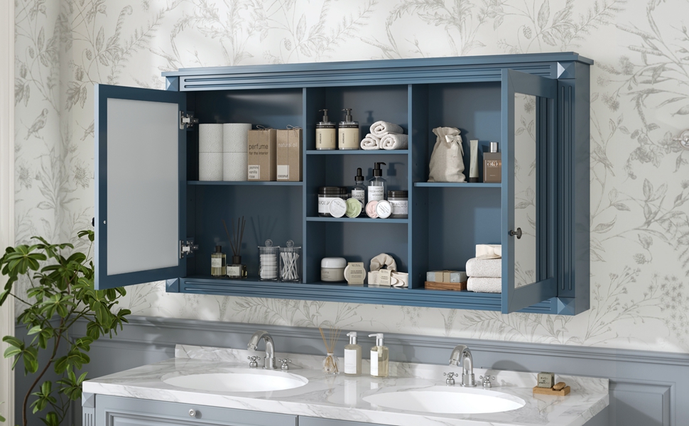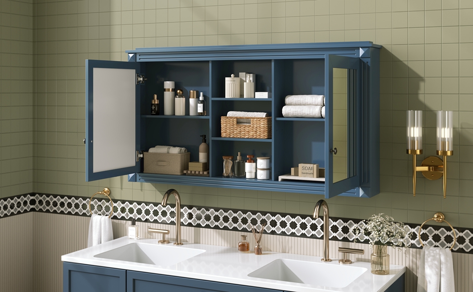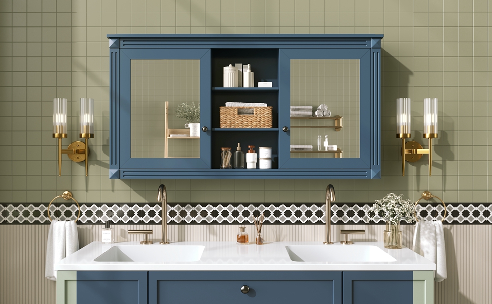 MRS 55 inch Wall-Mount 2-in-1 Mirror Cabinet with Adjustable Shelves, Soft-Closing Hinges, High-Definition Mirrors, for Bathroom Vanity, Living Room, Bedroom Storage Organizer. Designed to provide practical task lighting around a vanity or bathroom mirror while supporting everyday grooming routines. Material: Solid Wood+MDF. Product dimensions and weight: length 58.27, width 24.21, height 6.69, weight 62.17.