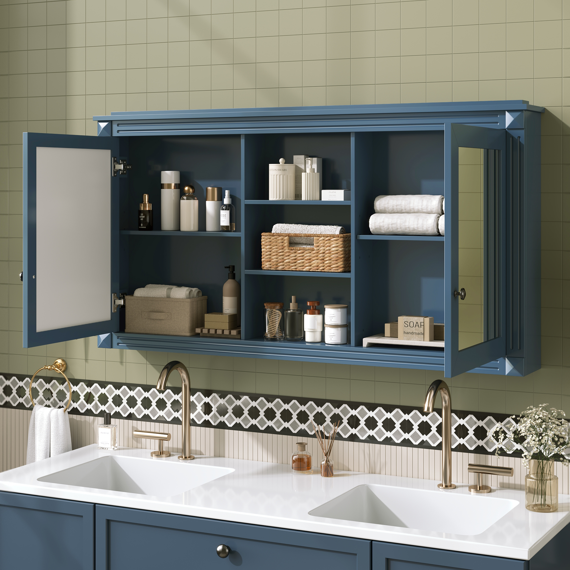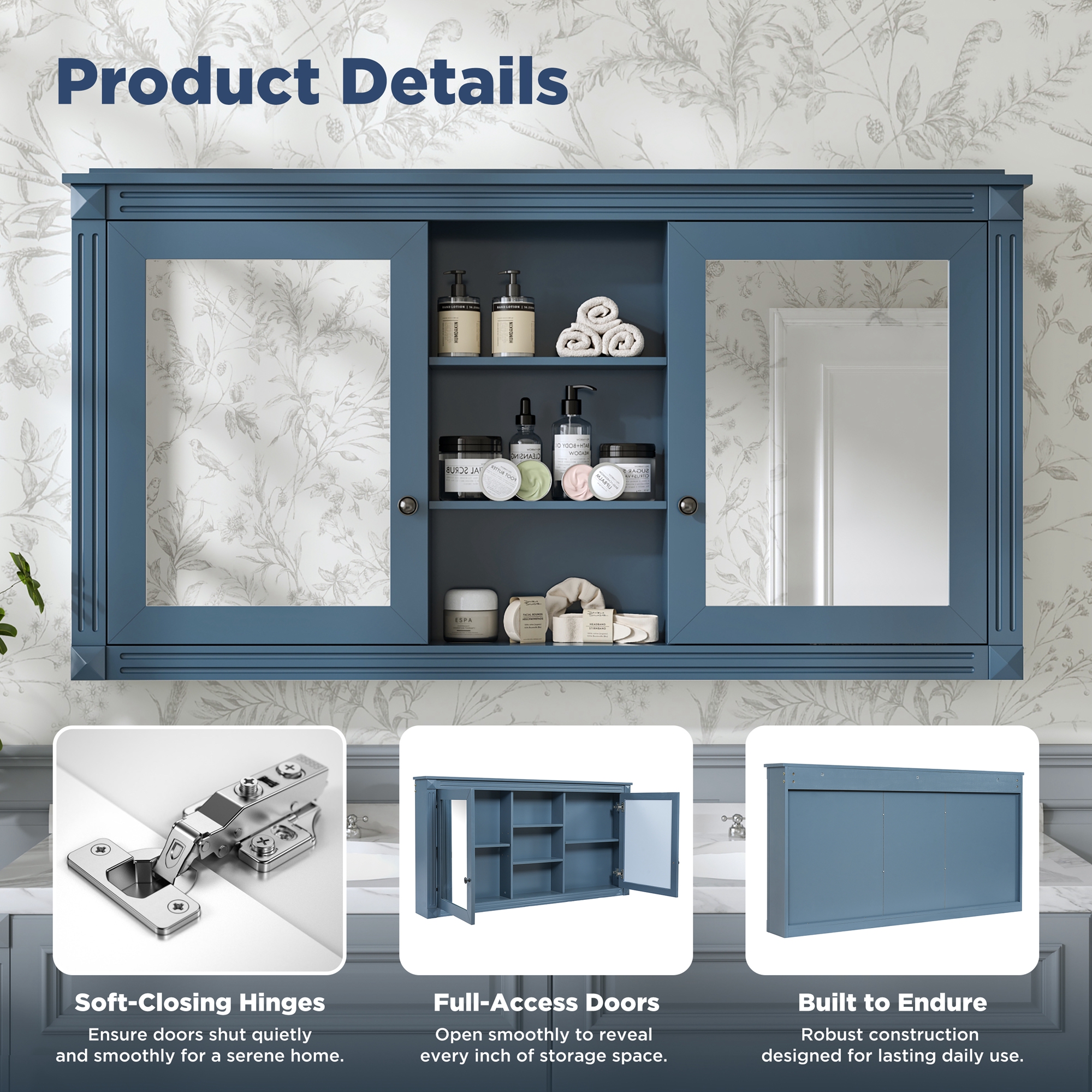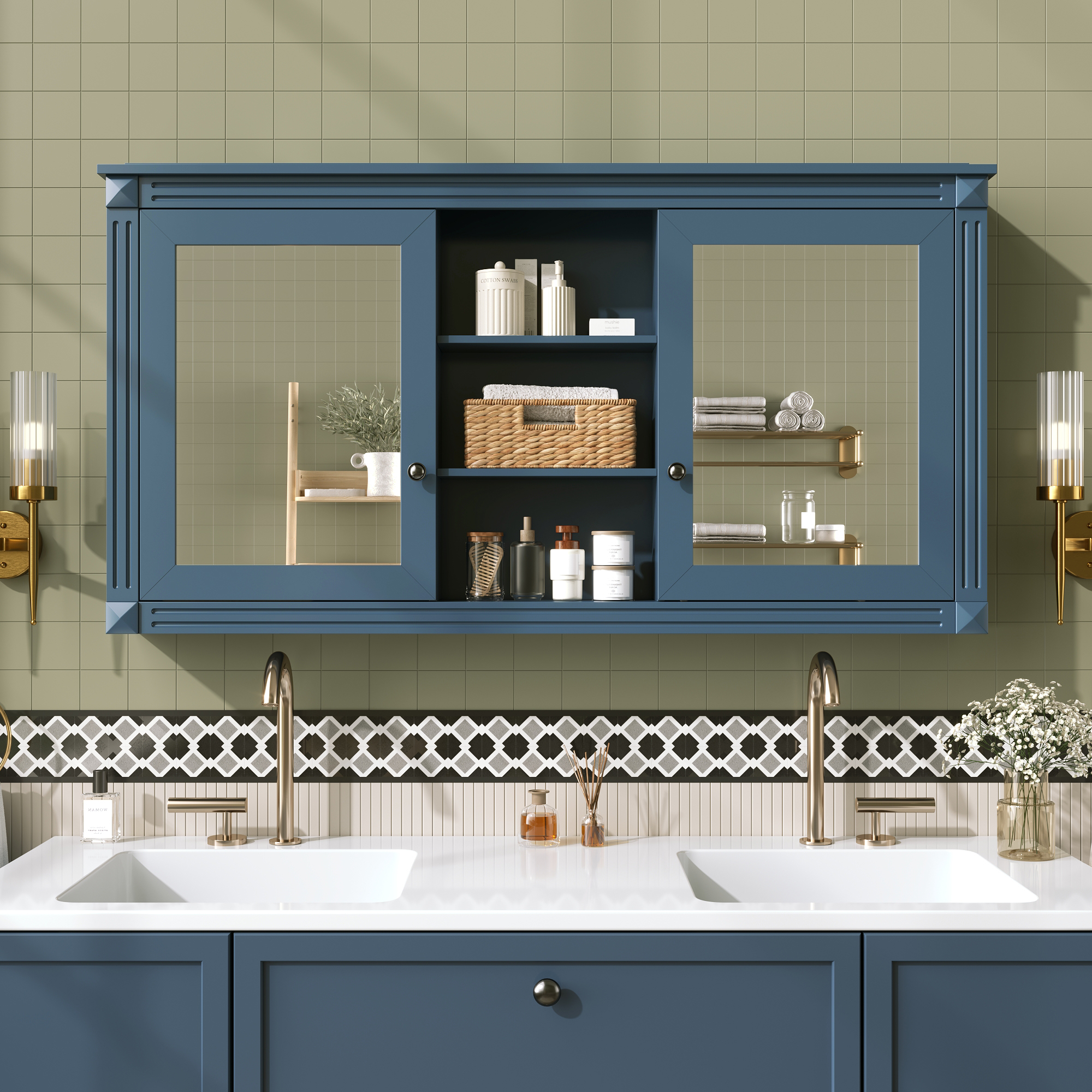 MRS 55 inch Wall-Mount 2-in-1 Mirror Cabinet with Adjustable Shelves, Soft-Closing Hinges, High-Definition Mirrors, for Bathroom Vanity, Living Room, Bedroom Storage Organizer. Designed to provide practical task lighting around a vanity or bathroom mirror while supporting everyday grooming routines. Material: Solid Wood+MDF. Product dimensions and weight: length 58.27, width 24.21, height 6.69, weight 62.17.