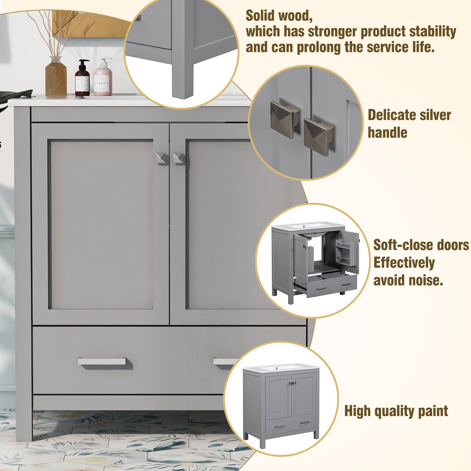 24" Gray Shaker Base Cabinet with Soft-Close Door,Drawer,Space-Saving Solid Wood Unit with Adjustable Shelf for Kitchen, Bath, Laundry, Garage (24"W x 24"D x 34.5"H)