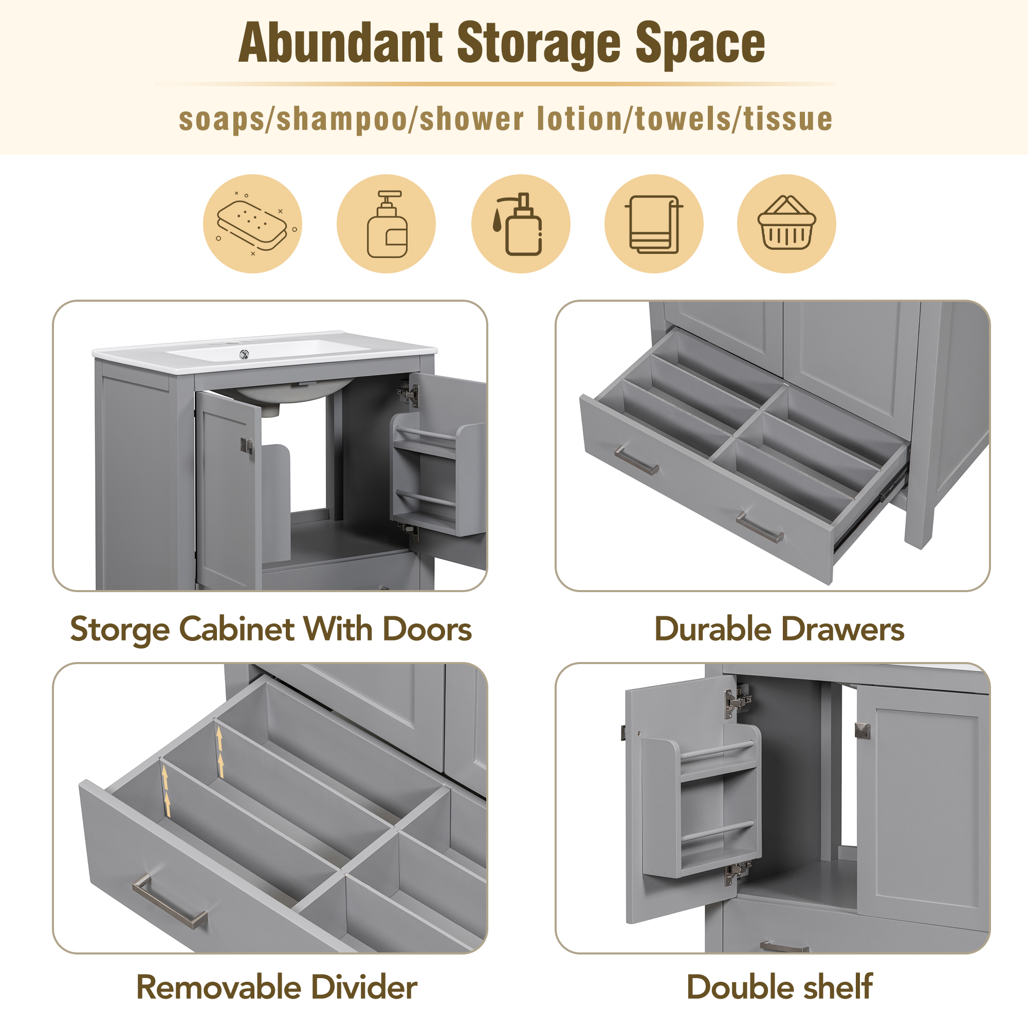 60" Grey Bathroom Vanity Set with Double Vanities (Separate), Double Ceramic Sinks, Storage Shelf, and Divided Drawers (Mirror not included)– Modern Bathroom Solution for Spacious Bathrooms