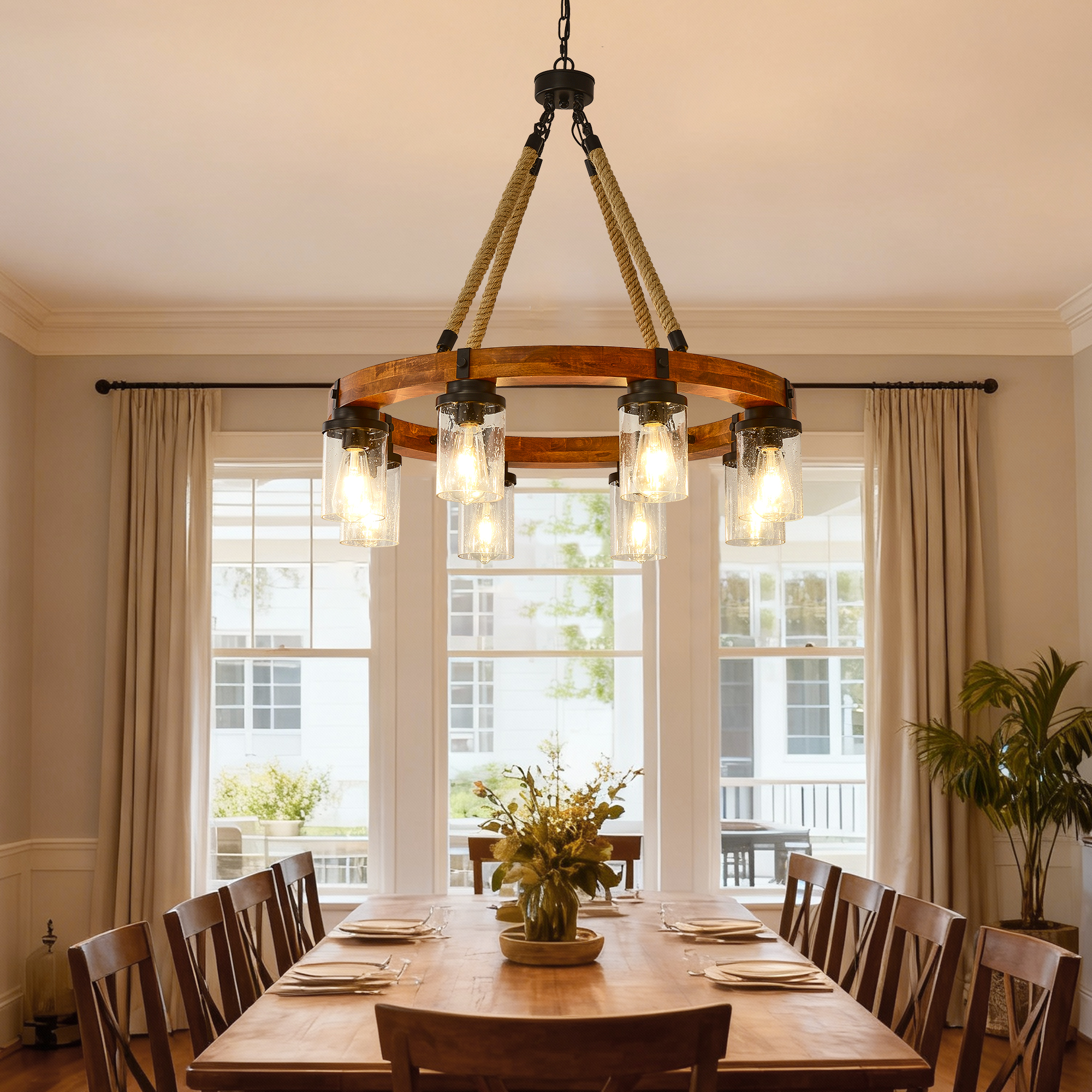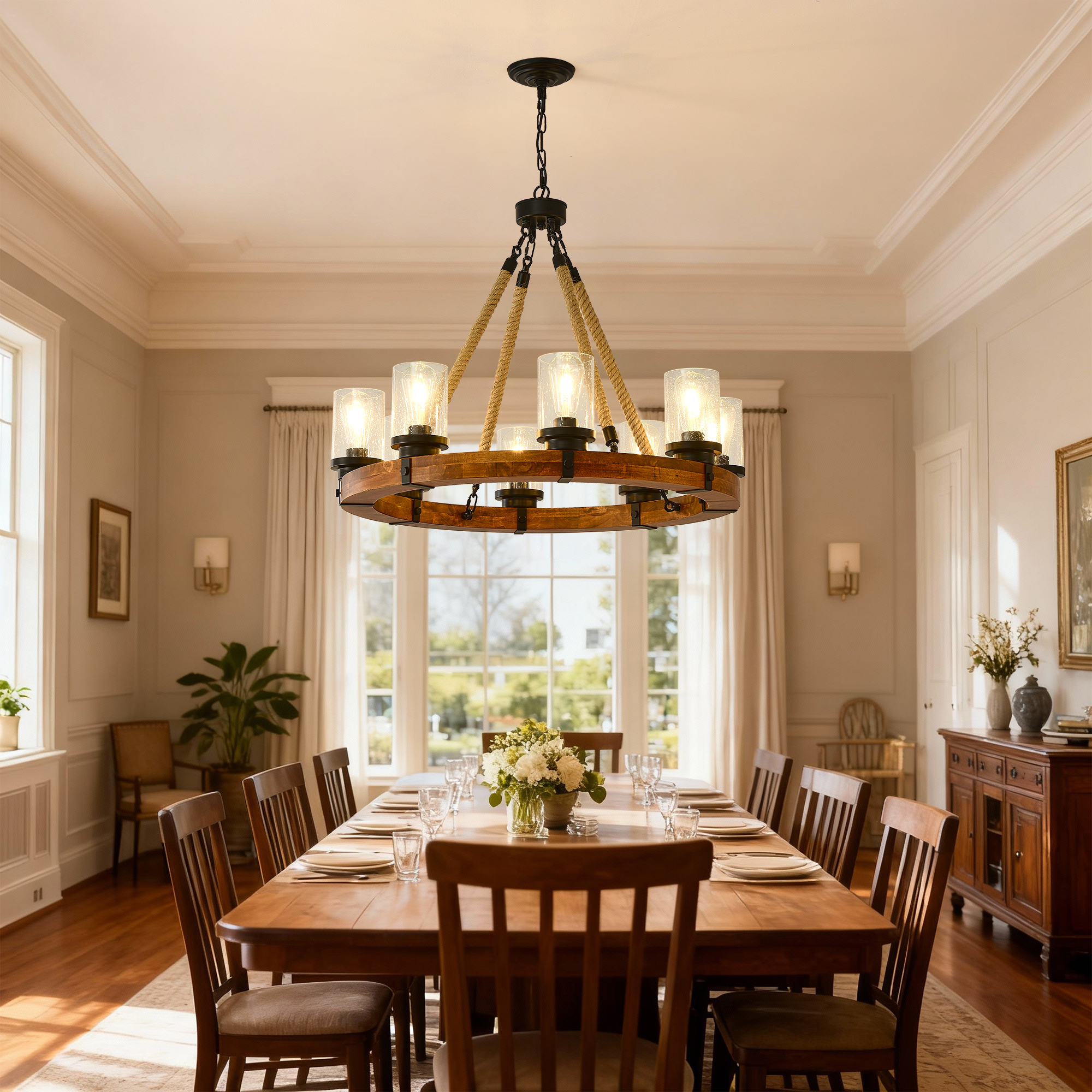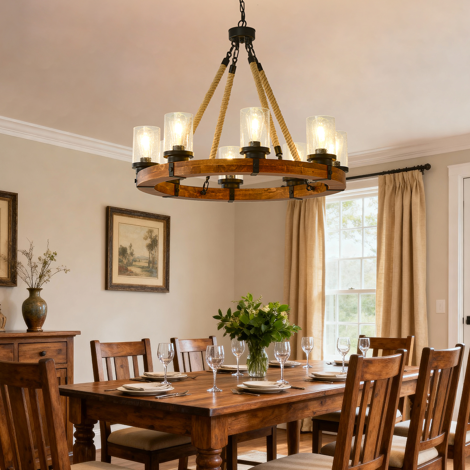 NEOSGO 8 Light Rustic Wagon Wheel Chandelier,31"Wooden Pendant Light with Seeded Glass Shade, Industrial Chandeliers for Dining Room Kitchen lsland Foyer (Solid One-Piece Wood Frame Design)-NO INCLUDED BULBS is designed to serve as both a lighting source and a decorative focal point within the room. This type of fixture is especially effective above dining tables, in entryways, and in living spaces where the customer wants overhead light with stronger visual impact. The product presentation suggests a style-driven fixture that helps define the ceiling area and gives the space a more elevated, finished character. It is a strong fit for customers who want lighting that contributes to the overall look of the room rather than functioning as a utility piece alone. Overall size is approximately 32.09 x 32.09 x 8.66 inches with a listed weight of 27.5. The current listing includes 12 product images, which help clarify the product shape, proportions, and visual placement in a real room setting.