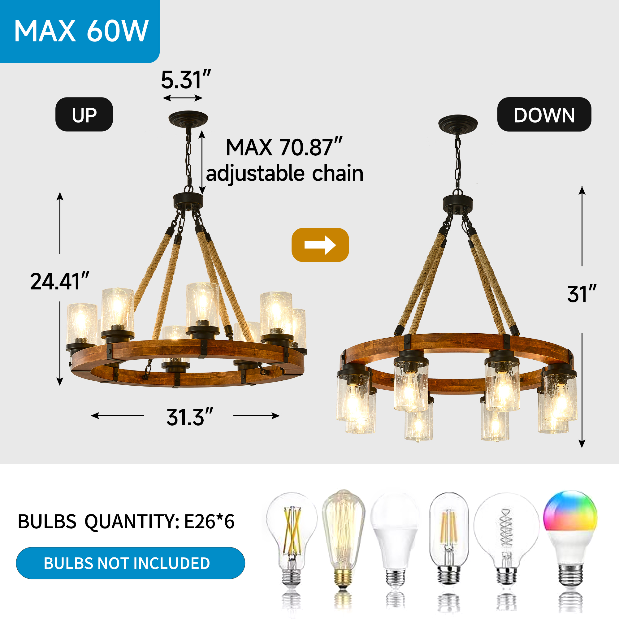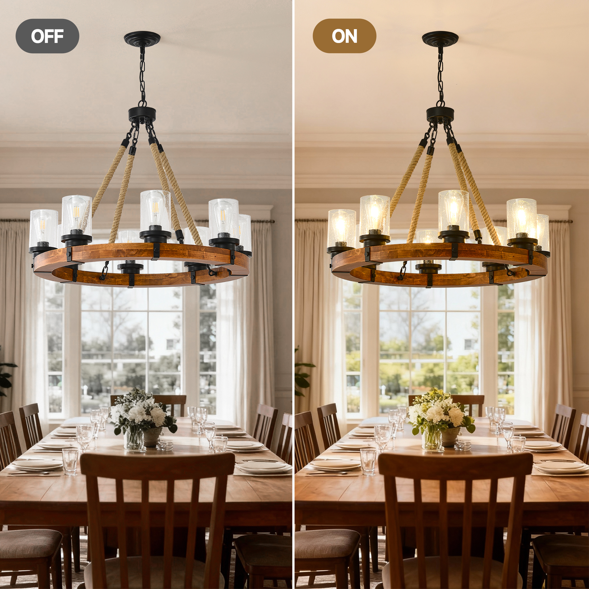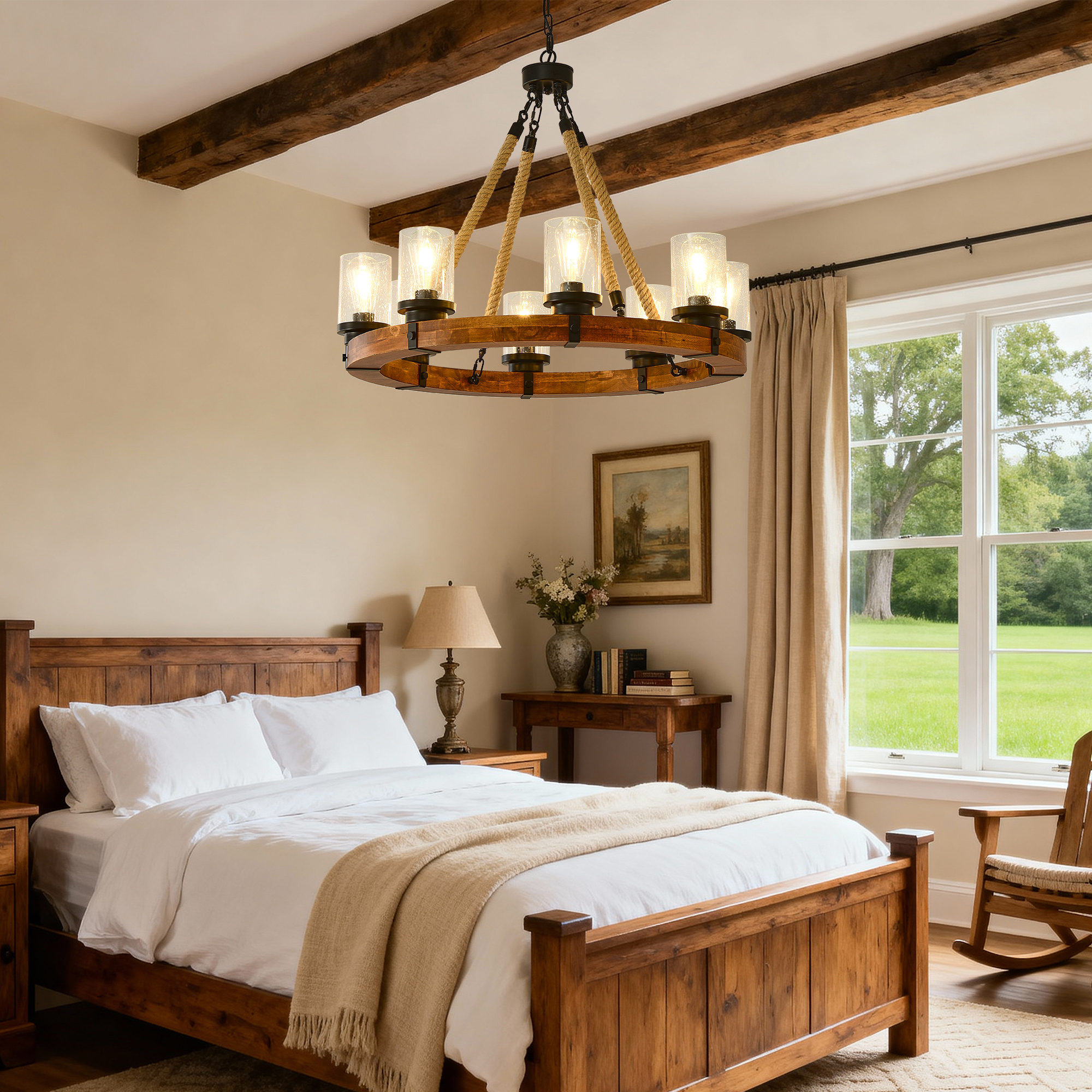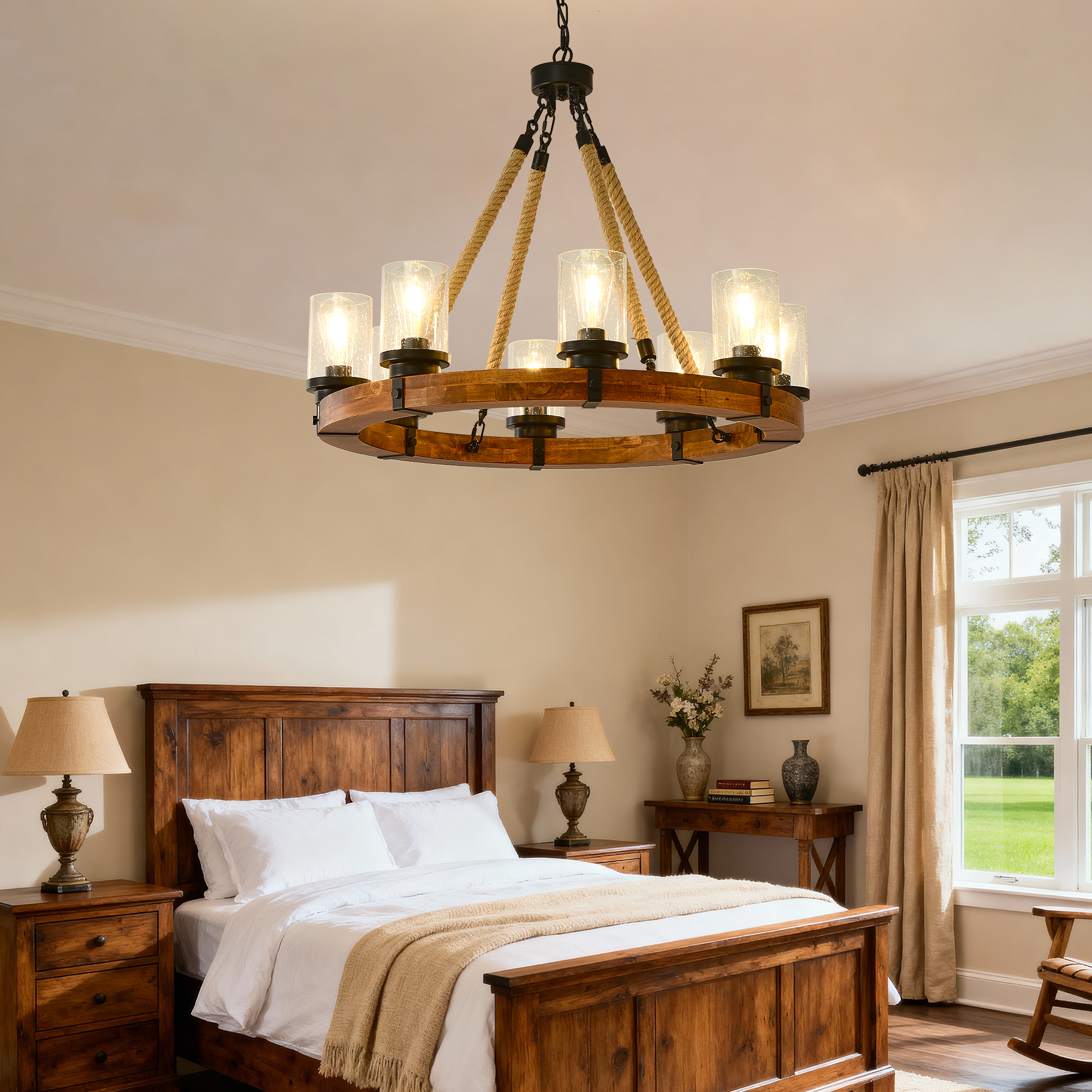 NEOSGO 8 Light Rustic Wagon Wheel Chandelier,31"Wooden Pendant Light with Seeded Glass Shade, Industrial Chandeliers for Dining Room Kitchen lsland Foyer (Solid One-Piece Wood Frame Design)-NO INCLUDED BULBS is designed to serve as both a lighting source and a decorative focal point within the room. This type of fixture is especially effective above dining tables, in entryways, and in living spaces where the customer wants overhead light with stronger visual impact. The product presentation suggests a style-driven fixture that helps define the ceiling area and gives the space a more elevated, finished character. It is a strong fit for customers who want lighting that contributes to the overall look of the room rather than functioning as a utility piece alone. Overall size is approximately 32.09 x 32.09 x 8.66 inches with a listed weight of 27.5. The current listing includes 12 product images, which help clarify the product shape, proportions, and visual placement in a real room setting.
