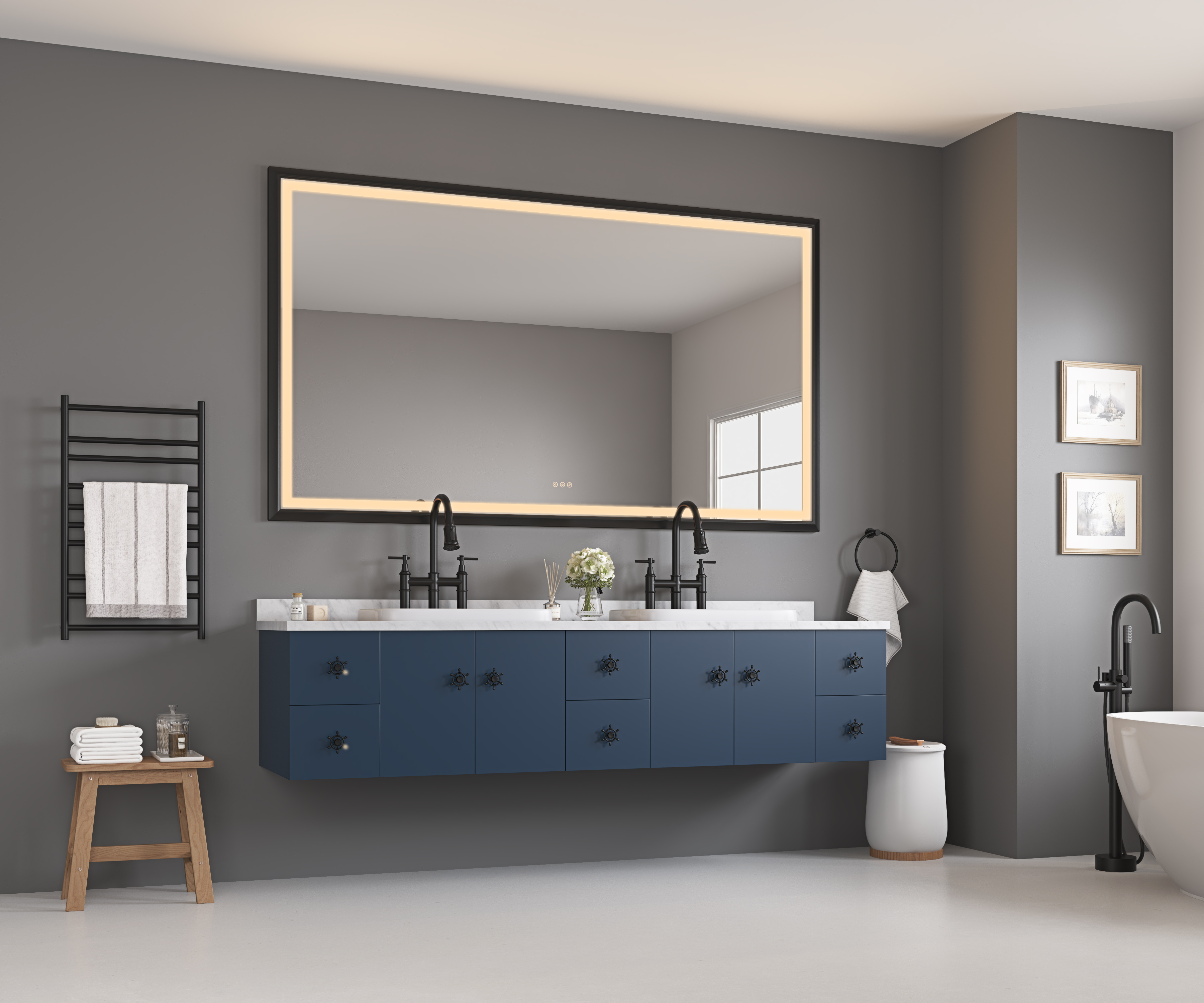 QH-Store 84in. W x 48in. H Oversized Rectangular Black Framed LED Mirror Anti-Fog Dimmable Wall Mount Bathroom Vanity Mirror HD Wall Mirror Kit For Gym And Dance Studio 48X 84Inches With Safety Ba. Designed to provide practical task lighting around a vanity or bathroom mirror while supporting everyday grooming routines. Material: Aluminium. Product dimensions and weight: length 89, width 53, height 4.3, weight 152.
