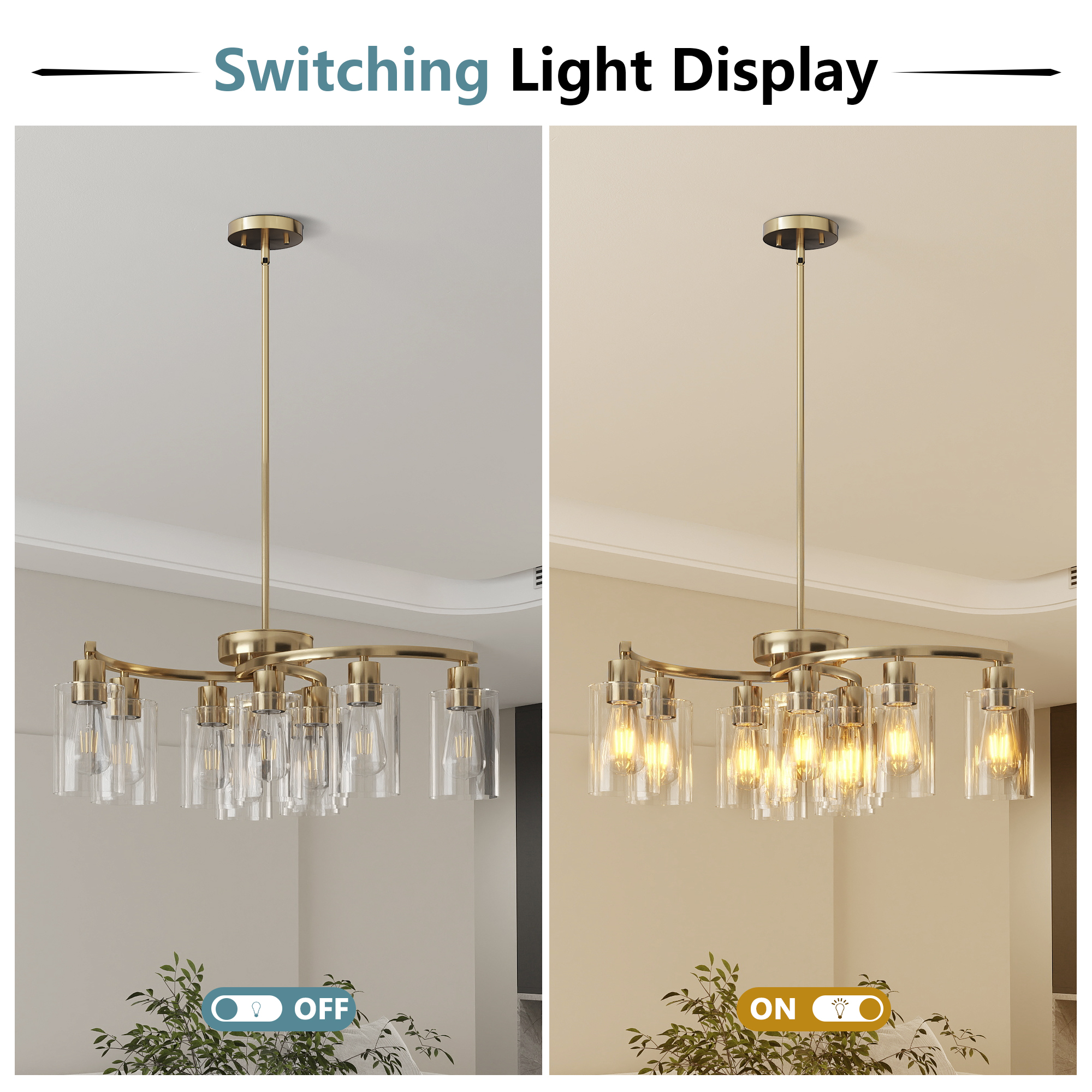 NEOSGO 9-Light Gold Glass Chandelier, Adjustable Height Dining Room Light Fixtures Over Table, Contemporary Hanging Chandelier for Kitchen Island Living Room Foyer Office, Clear Glass Shade is designed to serve as both a lighting source and a decorative focal point within the room. This type of fixture is especially effective above dining tables, in entryways, and in living spaces where the customer wants overhead light with stronger visual impact. The product presentation suggests a style-driven fixture that helps define the ceiling area and gives the space a more elevated, finished character. It is a strong fit for customers who want lighting that contributes to the overall look of the room rather than functioning as a utility piece alone. Overall size is approximately 26.57 x 24.61 x 8.27 inches with a listed weight of 13.6. The current listing includes 8 product images, which help clarify the product shape, proportions, and visual placement in a real room setting.