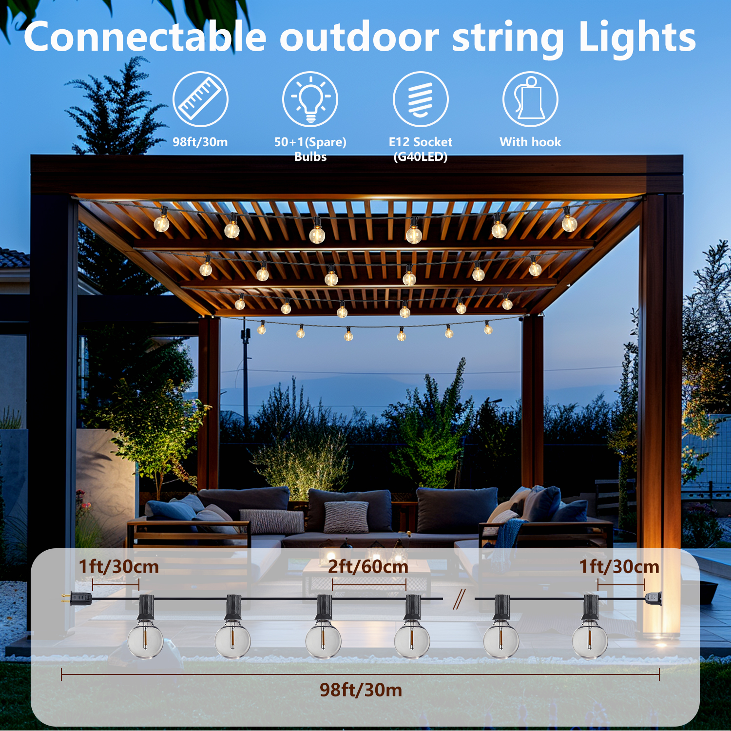 98FT LED Outdoor String Lights, Plug-in Waterproof Patio Lights with 50 Shatterproof Bulbs, Warm White Outdoor Hanging Light Decor for Backyard Deck Garden Bistro Porch Party