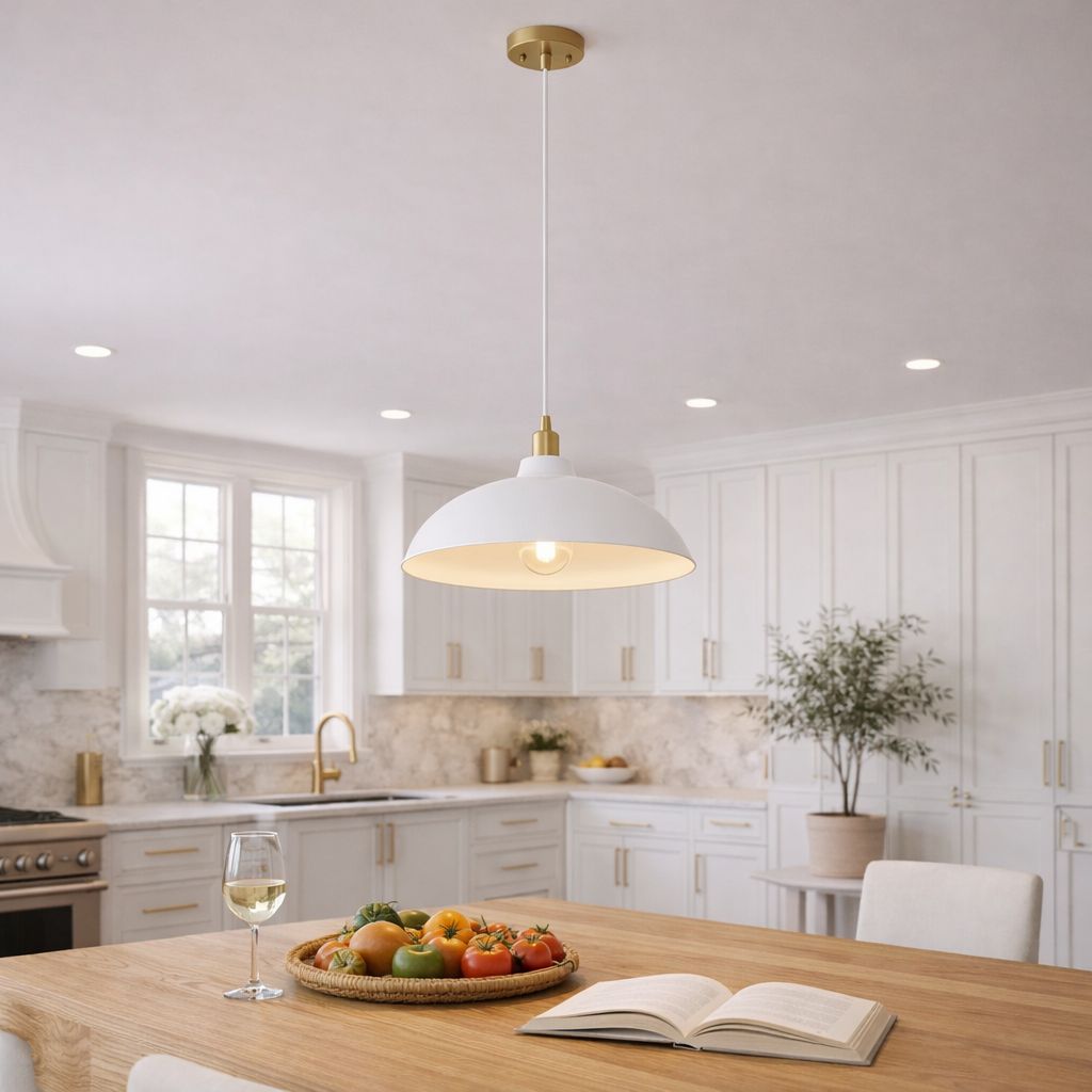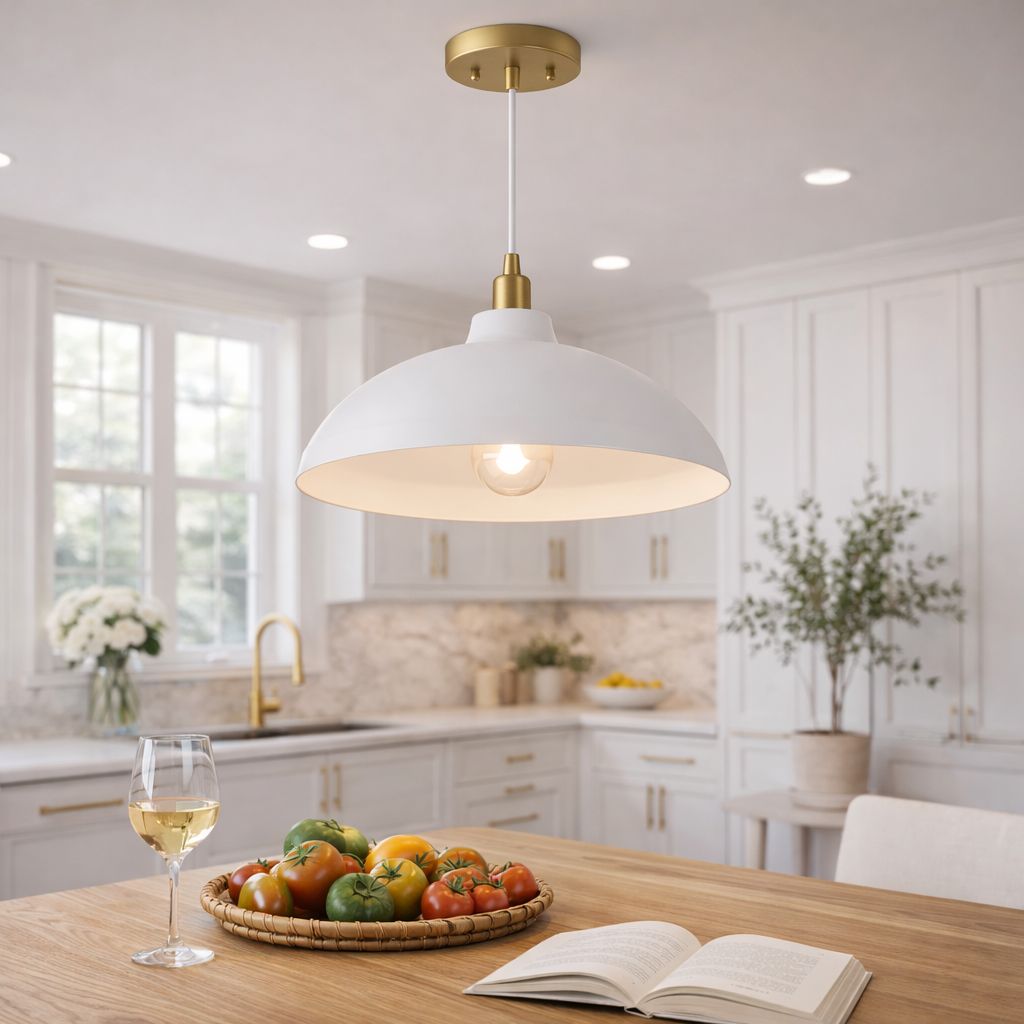 Astral Single Light White Pendant Lamp with Golder Brass Finish for Entrance Kitchen Island 14"D × 8"H Elevate your space with the Astral Single Light Pendant Lamp! With a stunning white exterior and glamorous gold brass finish, this lamp is perfect for an entrance or kitchen island. Measuring 14"D x 8"H, it adds a touch of elegance and brightness to any room. Make a statement with this stylish and functional piece. Add a touch of luxury and sophistication to your space with the Astral Single Light Pendant Lamp. Its stunning white exterior and glamorous gold brass finish make it a perfect addition to your entrance or kitchen island. Measuring 14"D x 8"H, it effortlessly elevates any room with its elegant yet functional design. Make a statement with this must-have piece that will add both style and brightness to your space.