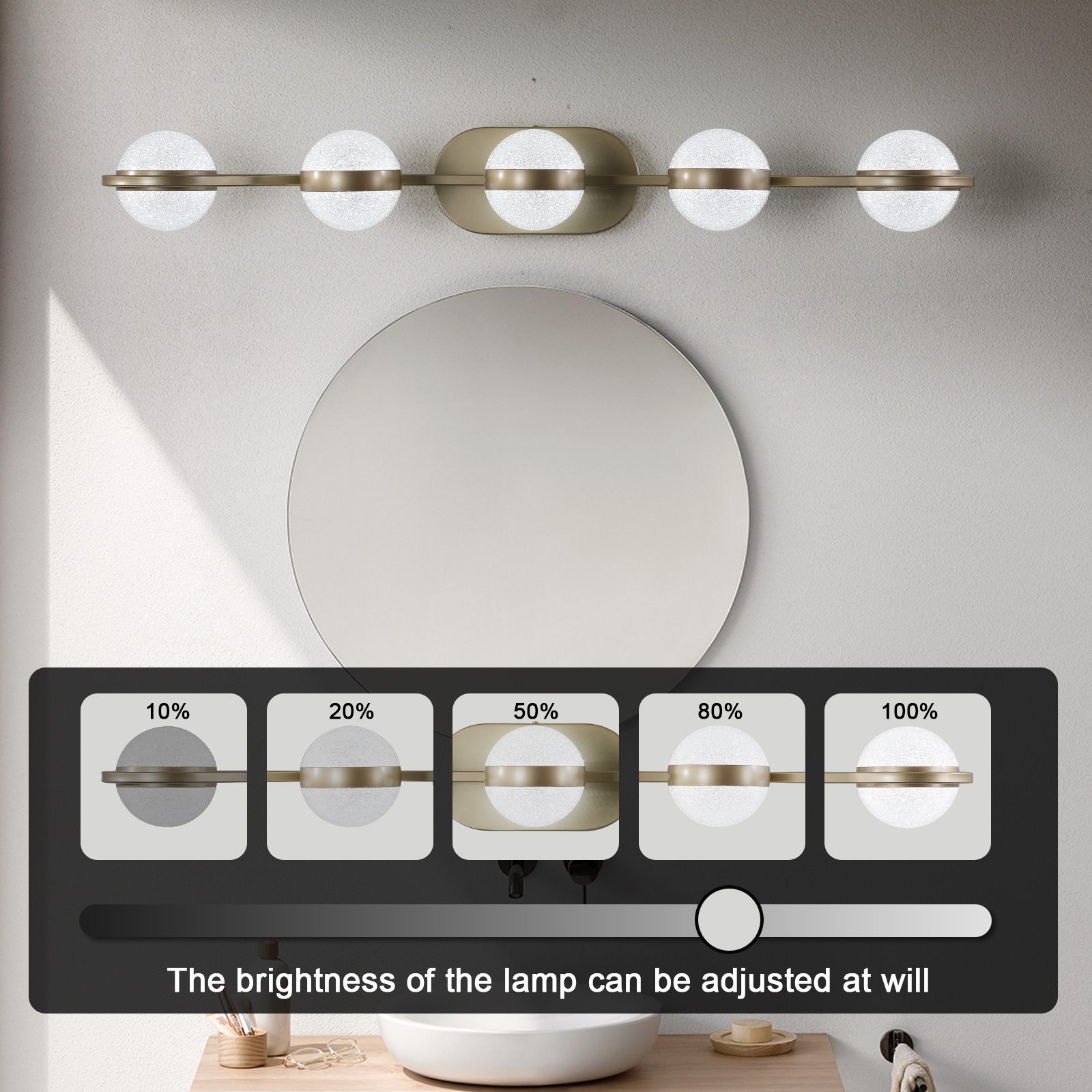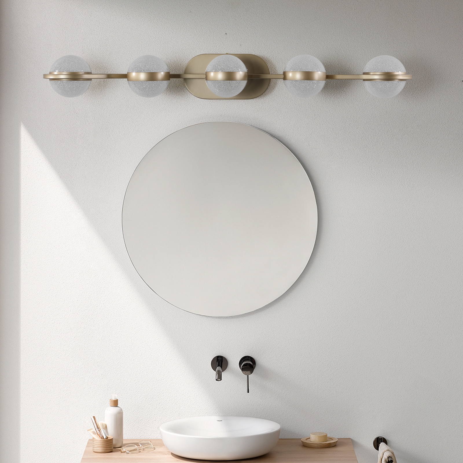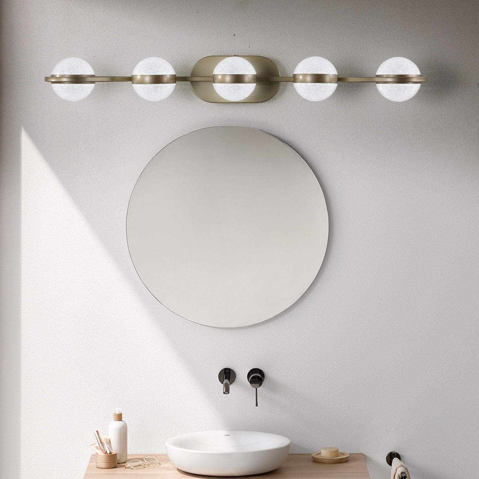 Bathroom Vanity Light, LED 5 Bulb Crystal Sand Acrylic Shades, Wall Mounted Decorative Lighting Fixture, Suitable for Bathroom Vanity Mirror (Champagne Gold)