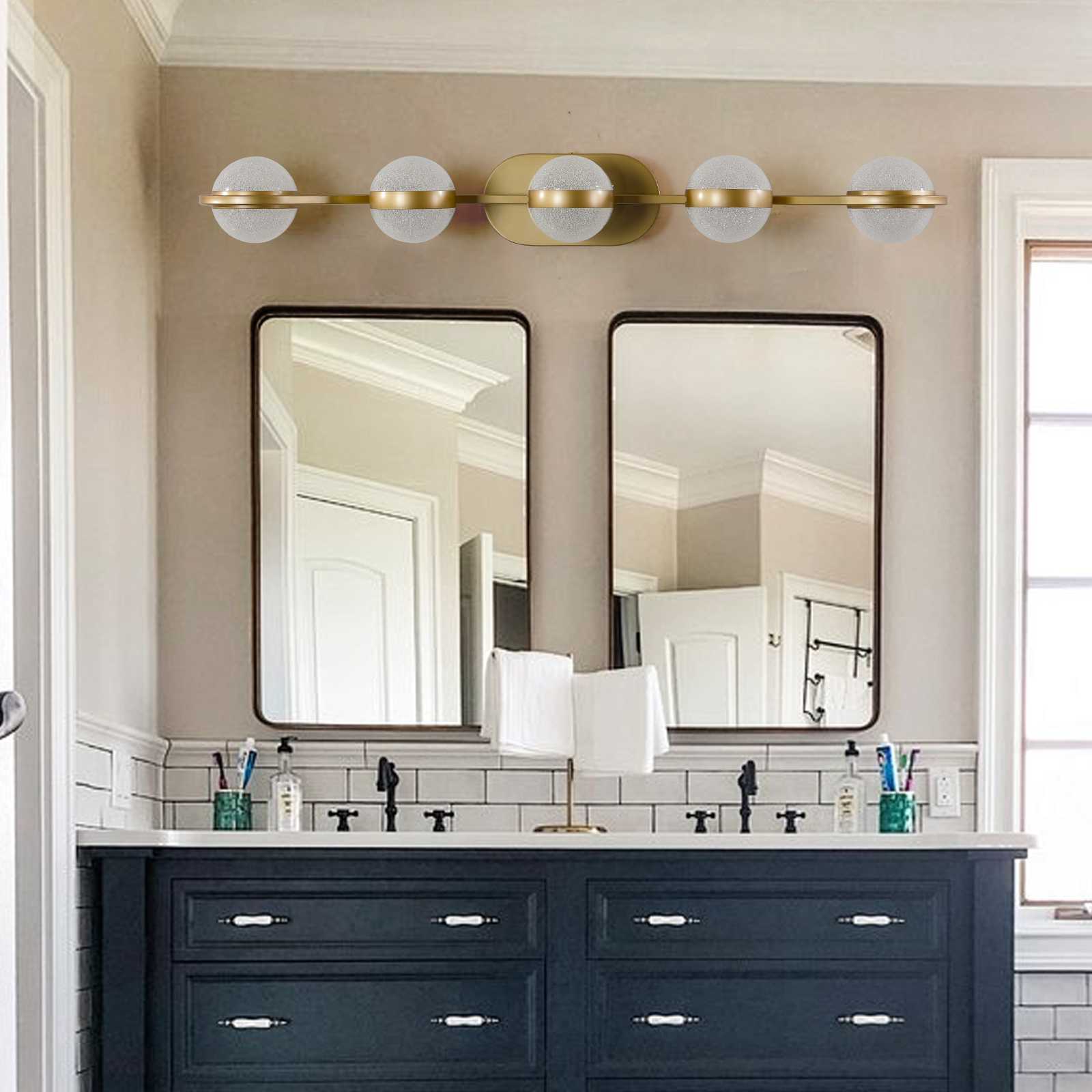 NEOSGO Bathroom Vanity Light, LED 5 Bulb Crystal Sand Acrylic Shades, Wall Mounted Decorative Lighting Fixture, Suitable for Bathroom Vanity Mirror (Champagne Gold) is designed to improve daily bathroom routines with a clearer mirror area and more useful lighting around the vanity space. The product presentation suggests a modern wall-mounted mirror intended for grooming, makeup, skincare, shaving, and other tasks that benefit from more even front-facing light. It works especially well in bathrooms, powder rooms, and remodeled vanity areas where customers want the mirror to provide both practical function and a cleaner visual upgrade. This type of mirror is a strong fit for shoppers looking to make the room feel brighter, more modern, and easier to use every day. Overall size is approximately 39.76 x 9.45 x 7.48 inches with a listed weight of 7.8. The current listing includes 12 product images, which help clarify the product shape, proportions, and visual placement in a real room setting.