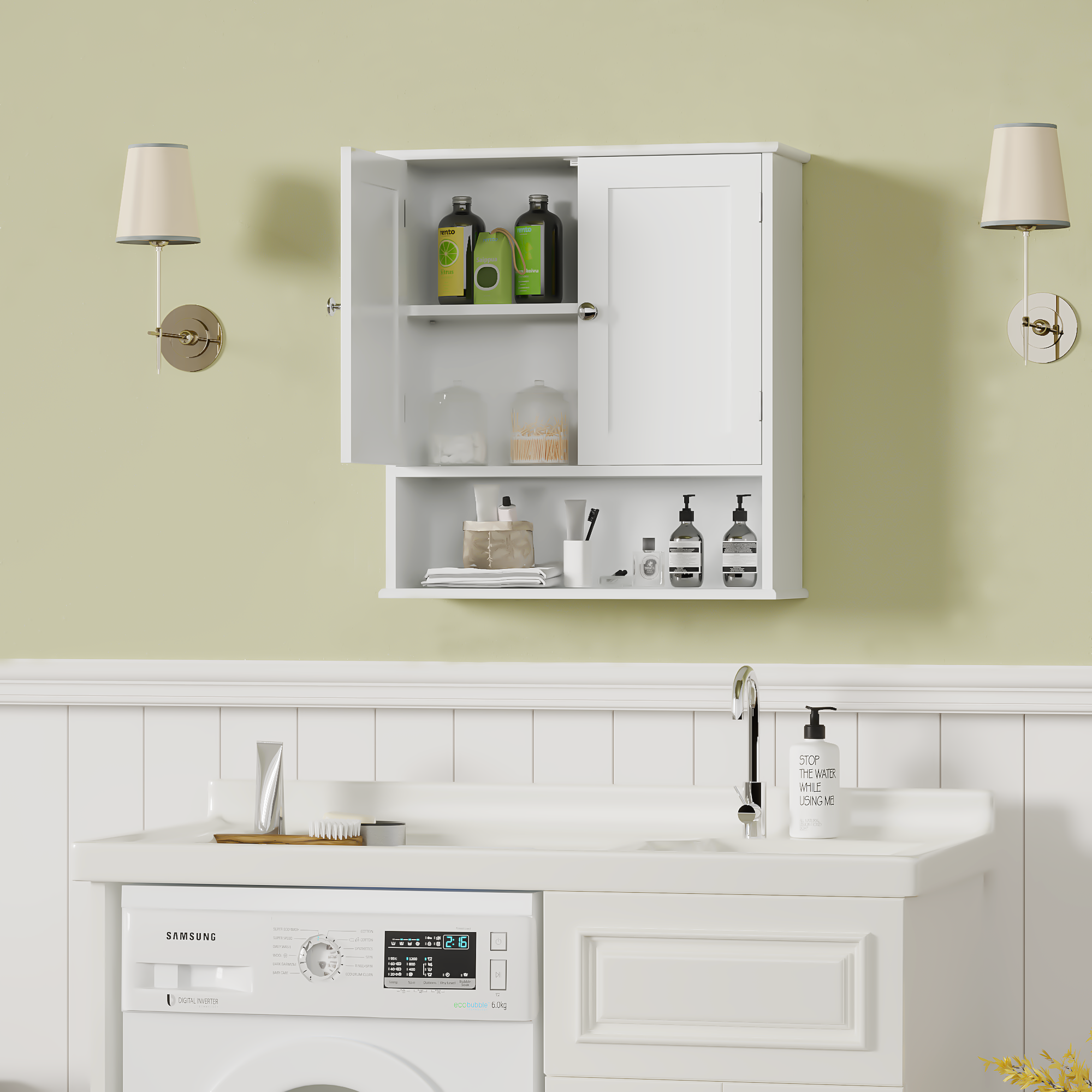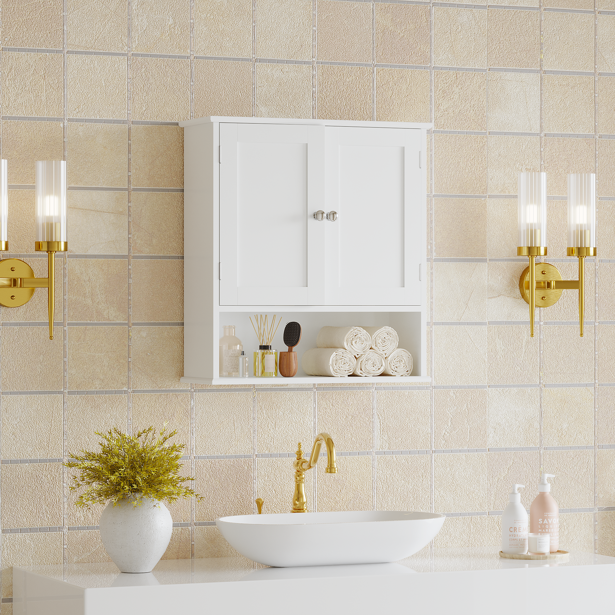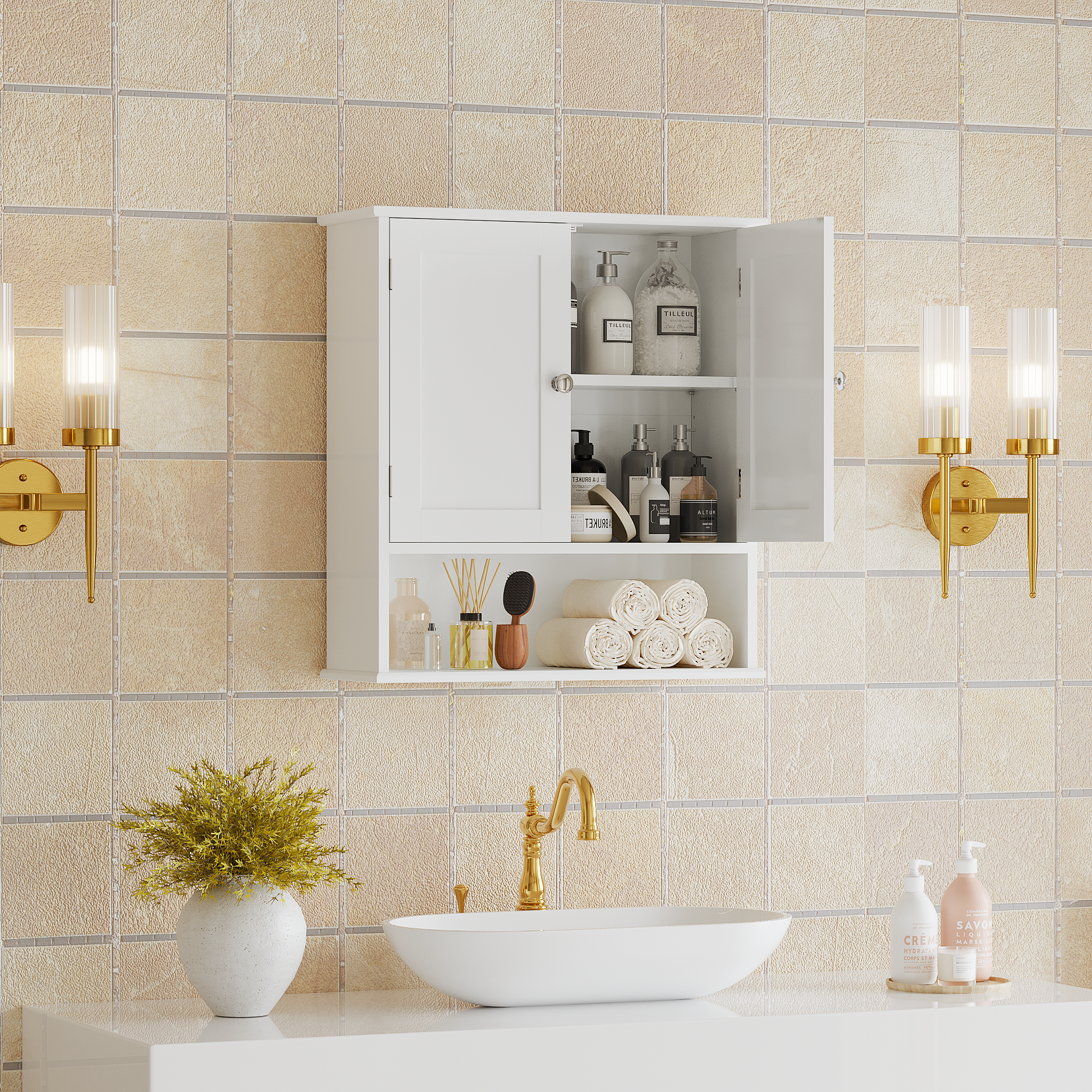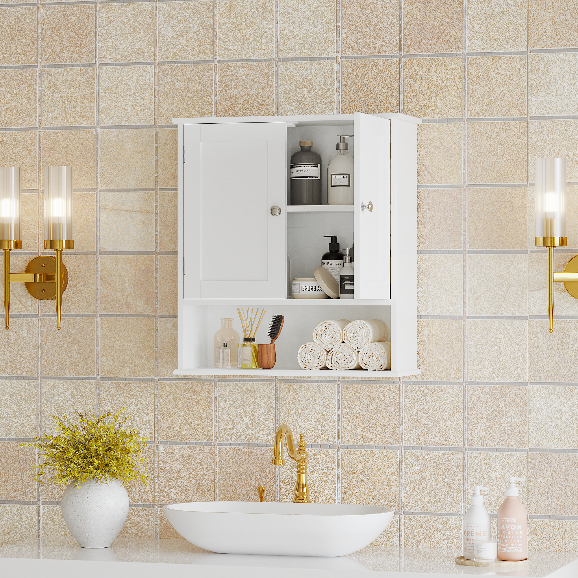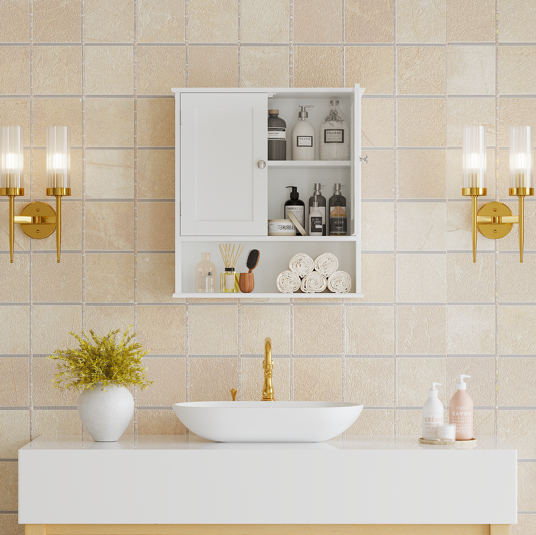 MOONRIVER Bathroom Wall Cabinet with Door, Over Toilet Storage Cabinet with and Adjustable Shelves, 3-Tier Medicine Cabinet Wall Mounted, for Bathroom, Kitchen, Entryway, Laundry Room, White. Works well as accent or supplemental wall lighting for hallways, bedrooms, bathrooms, and other interior spaces. Material: MDF. Product dimensions and weight: length 27.16, width 17.12, height 4.13, weight 18.76.