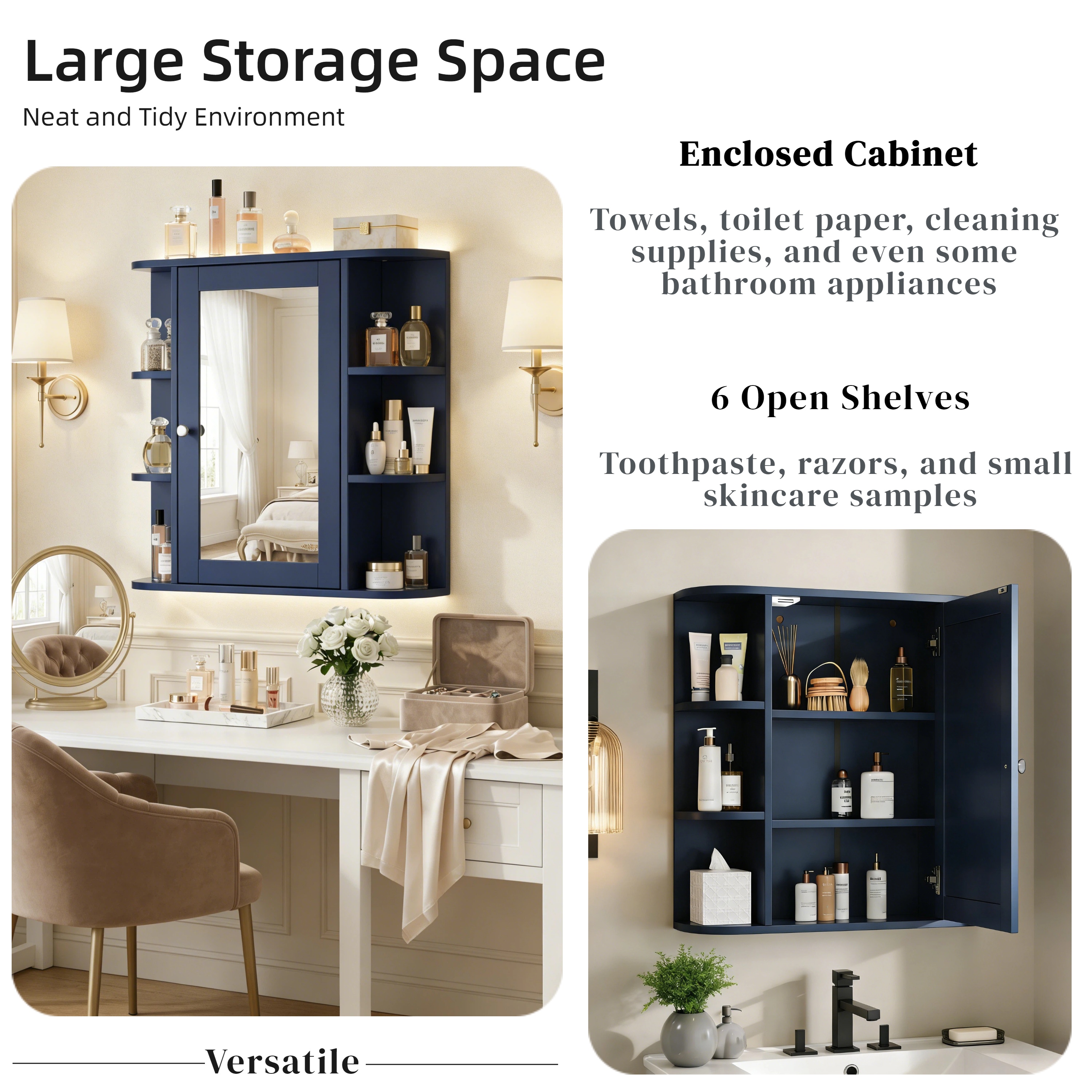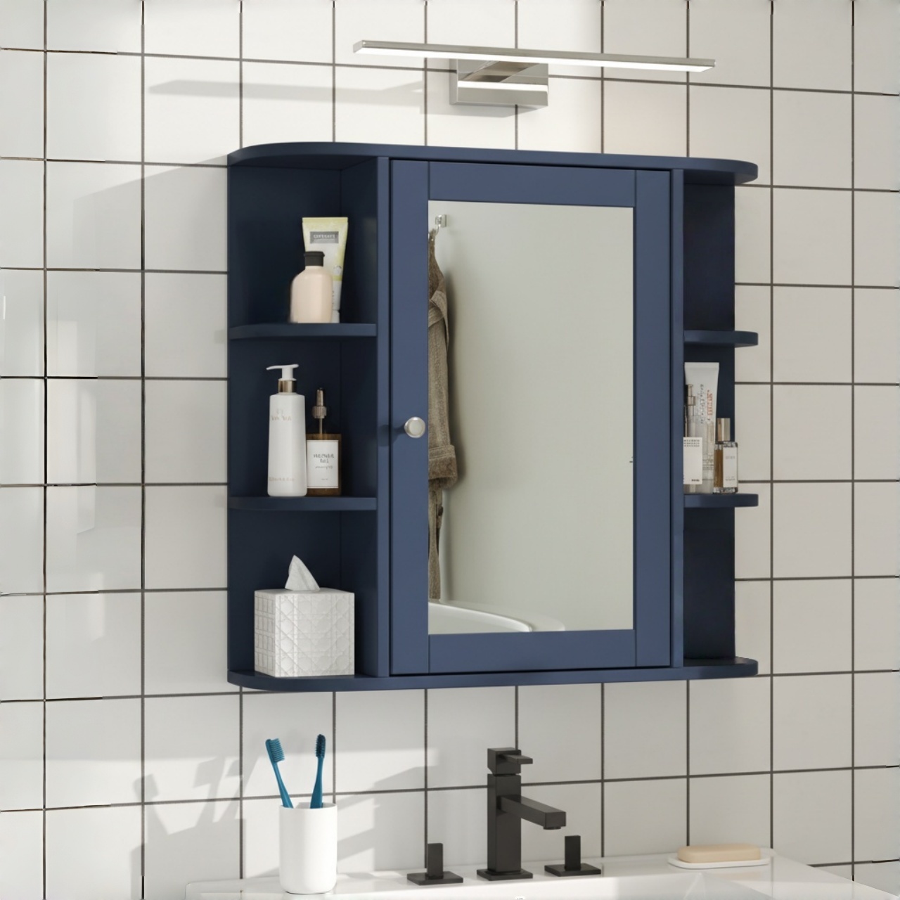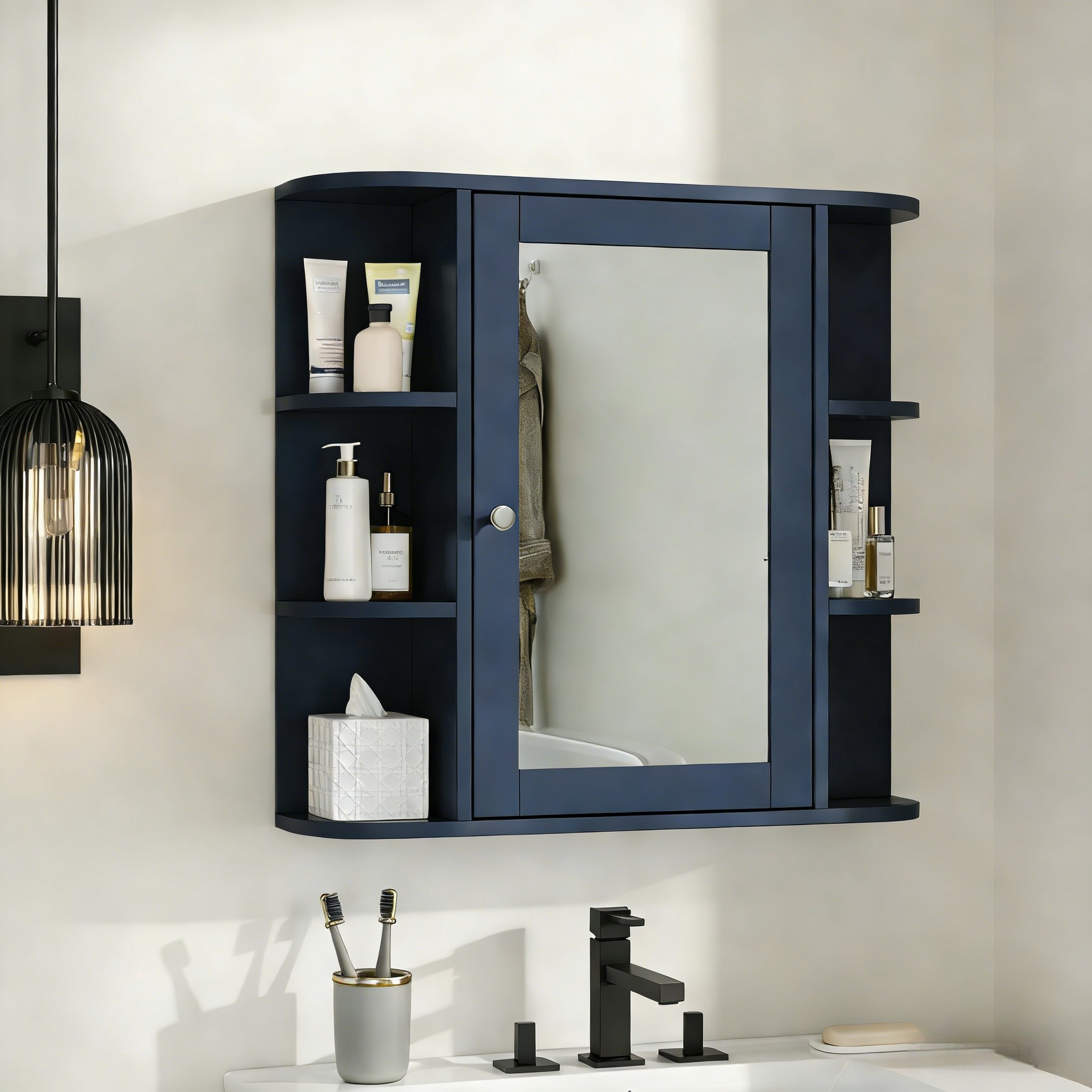 NH-ECHO Bathroom Wall Storage Cabinet with Mirror, Medicine Cabinet with Adjustable Wood Shelf & Doors, Mounted Storage Cabinets with 6 Open Shelves, Blue. Designed to provide practical task lighting around a vanity or bathroom mirror while supporting everyday grooming routines. Material: MDF. Product dimensions and weight: length 31.1, width 17.32, height 4.92, weight 24.69.
