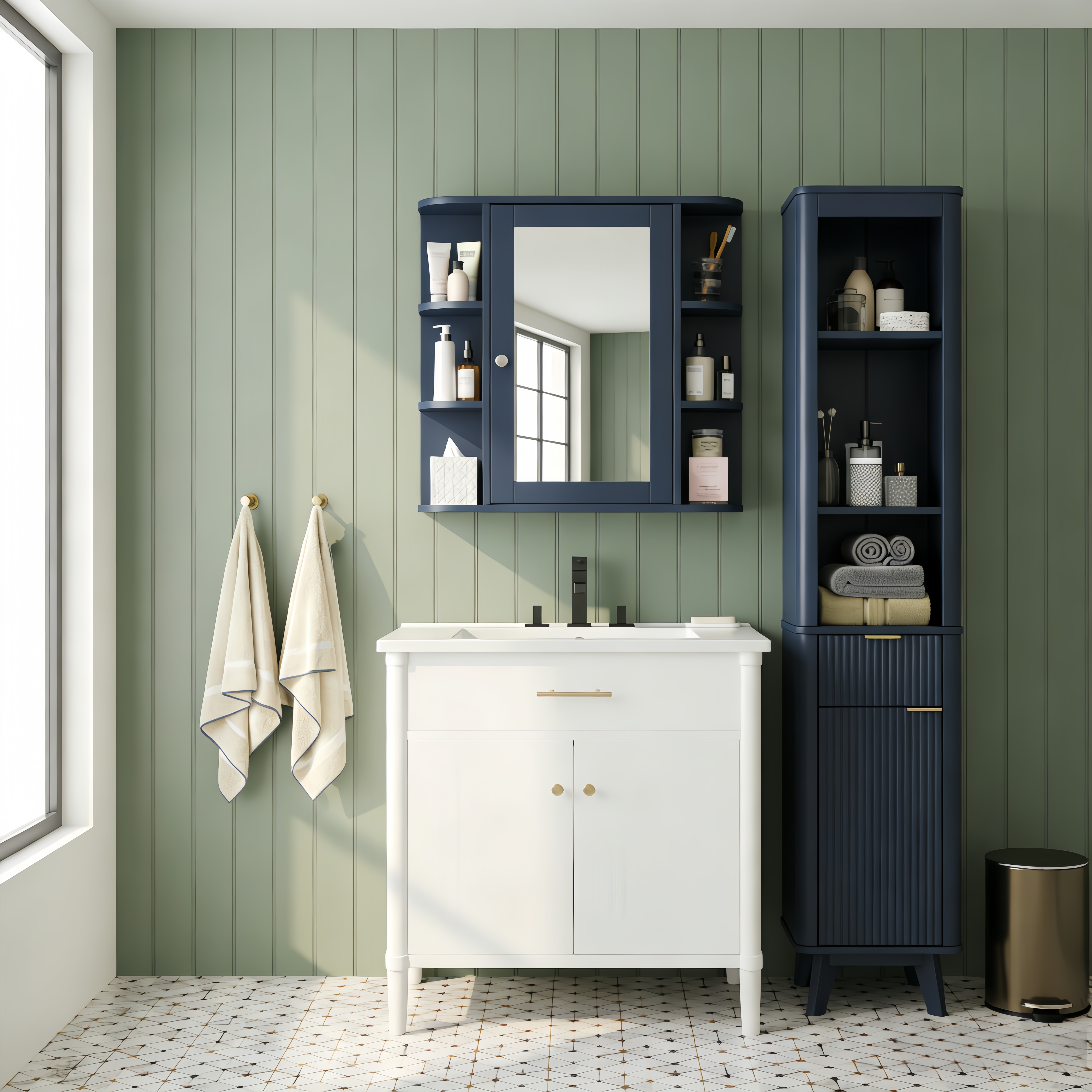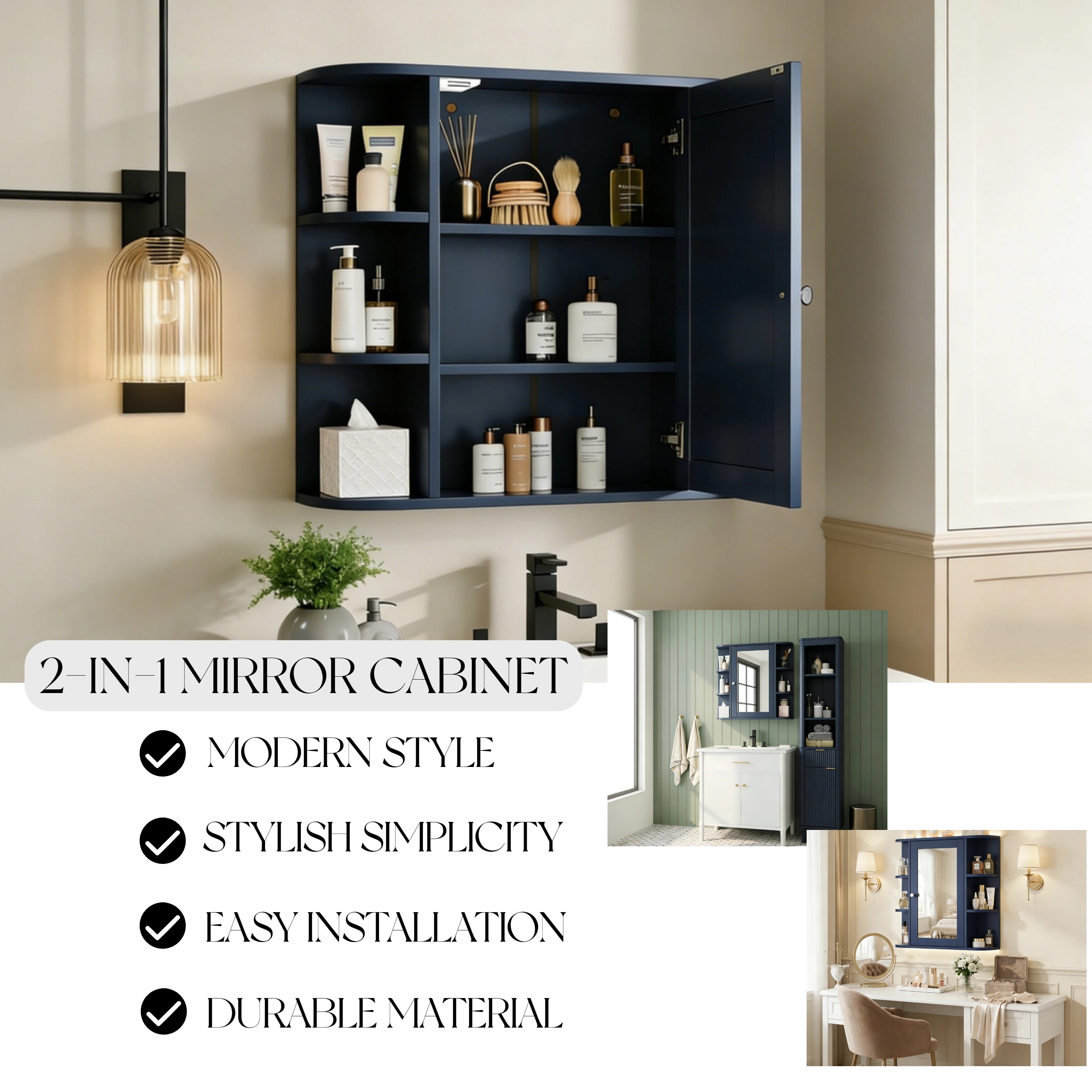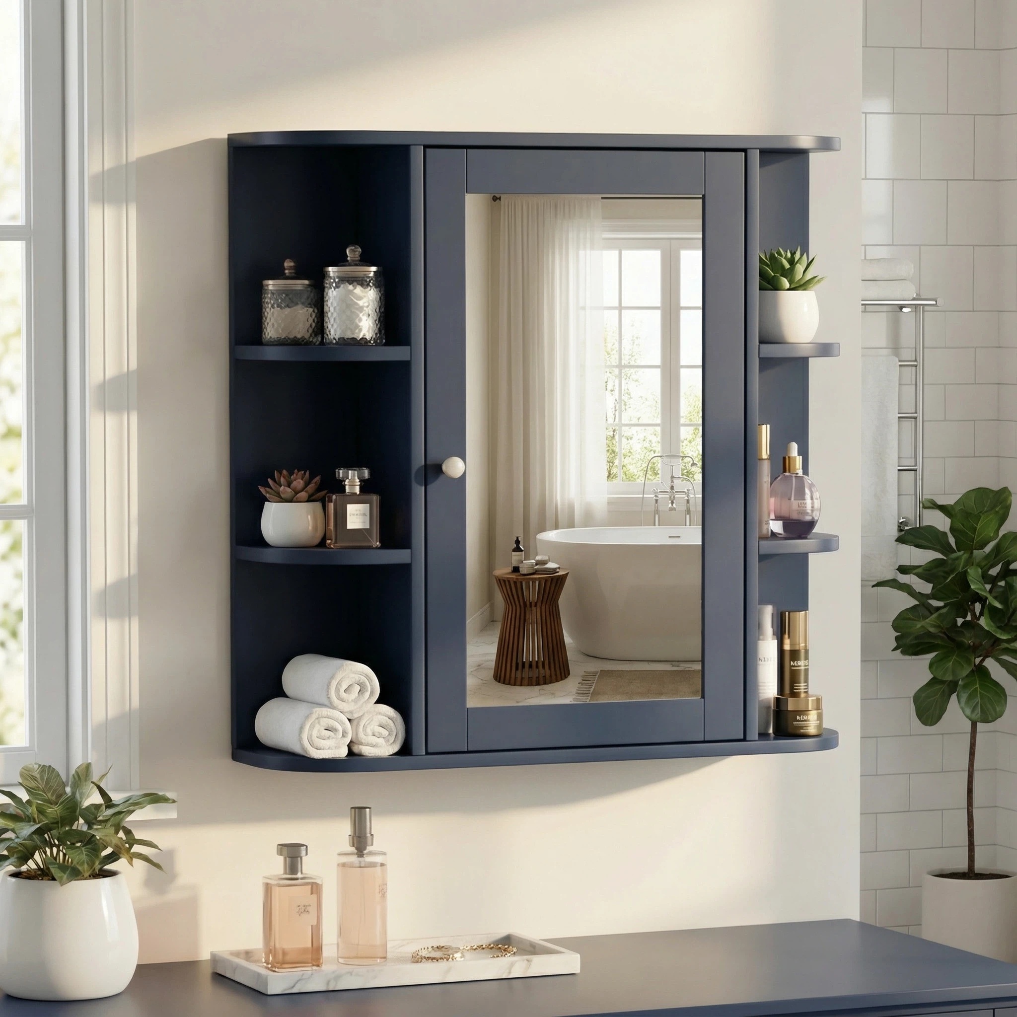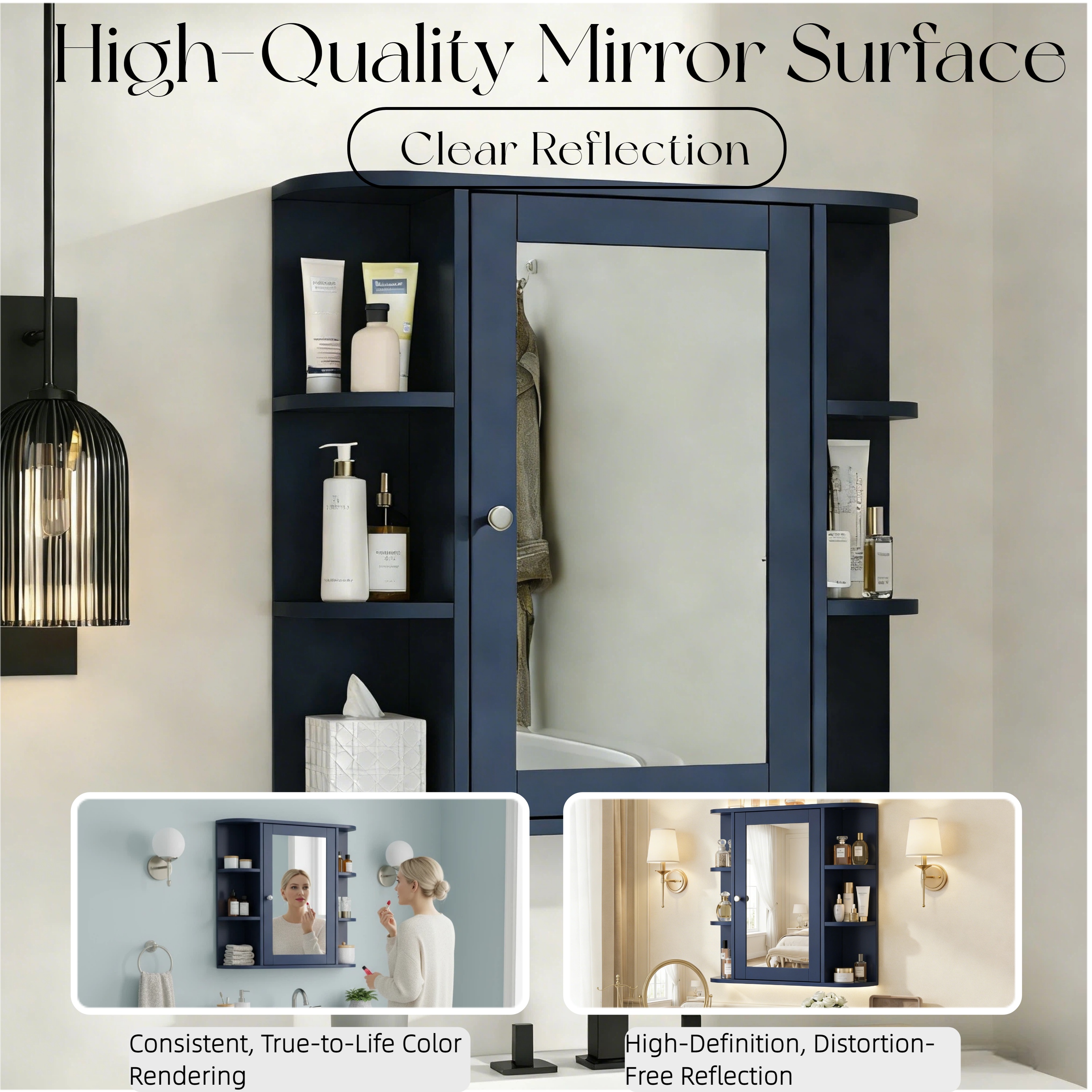 NH-ECHO Bathroom Wall Storage Cabinet with Mirror, Medicine Cabinet with Adjustable Wood Shelf & Doors, Mounted Storage Cabinets with 6 Open Shelves, Blue. Designed to provide practical task lighting around a vanity or bathroom mirror while supporting everyday grooming routines. Material: MDF. Product dimensions and weight: length 31.1, width 17.32, height 4.92, weight 24.69.