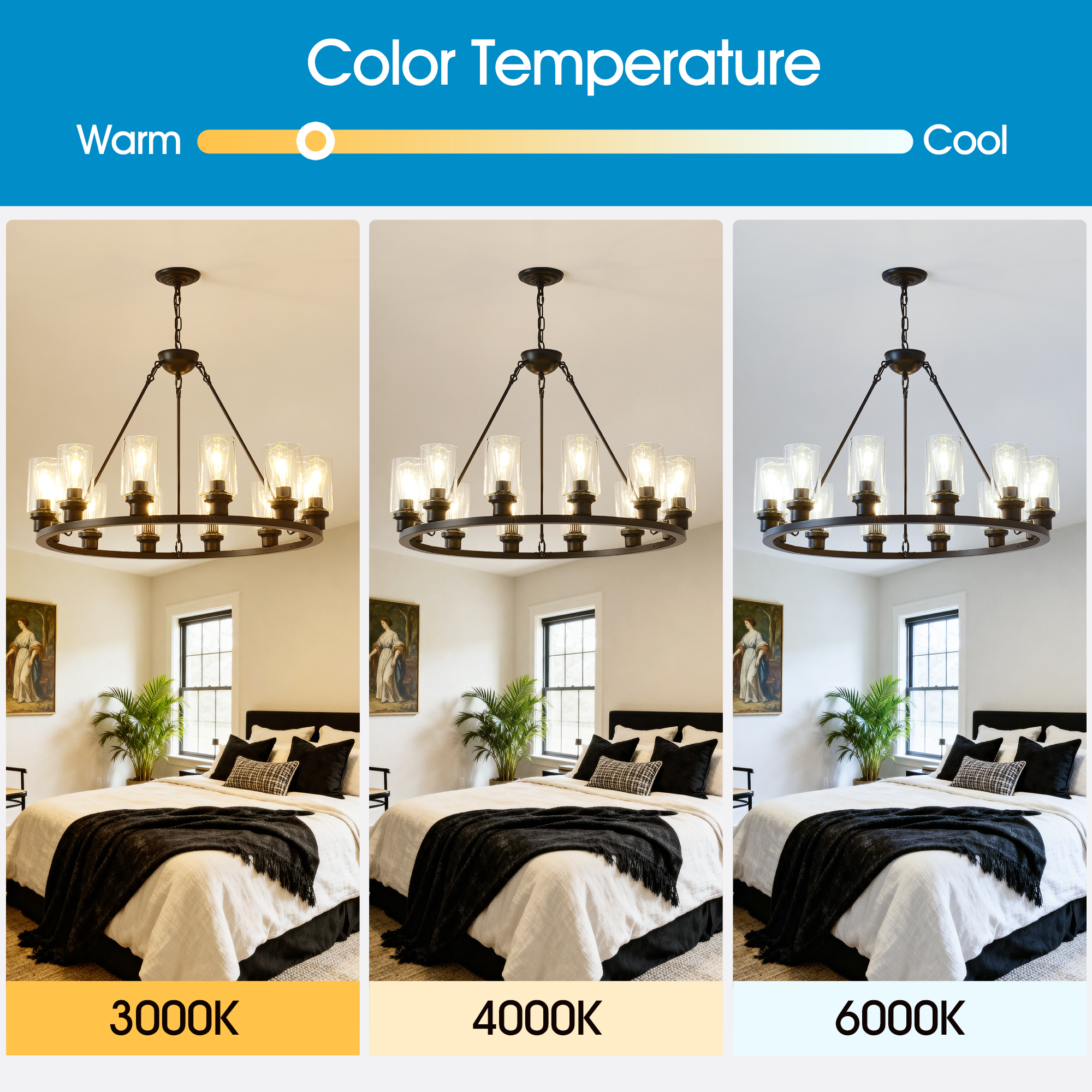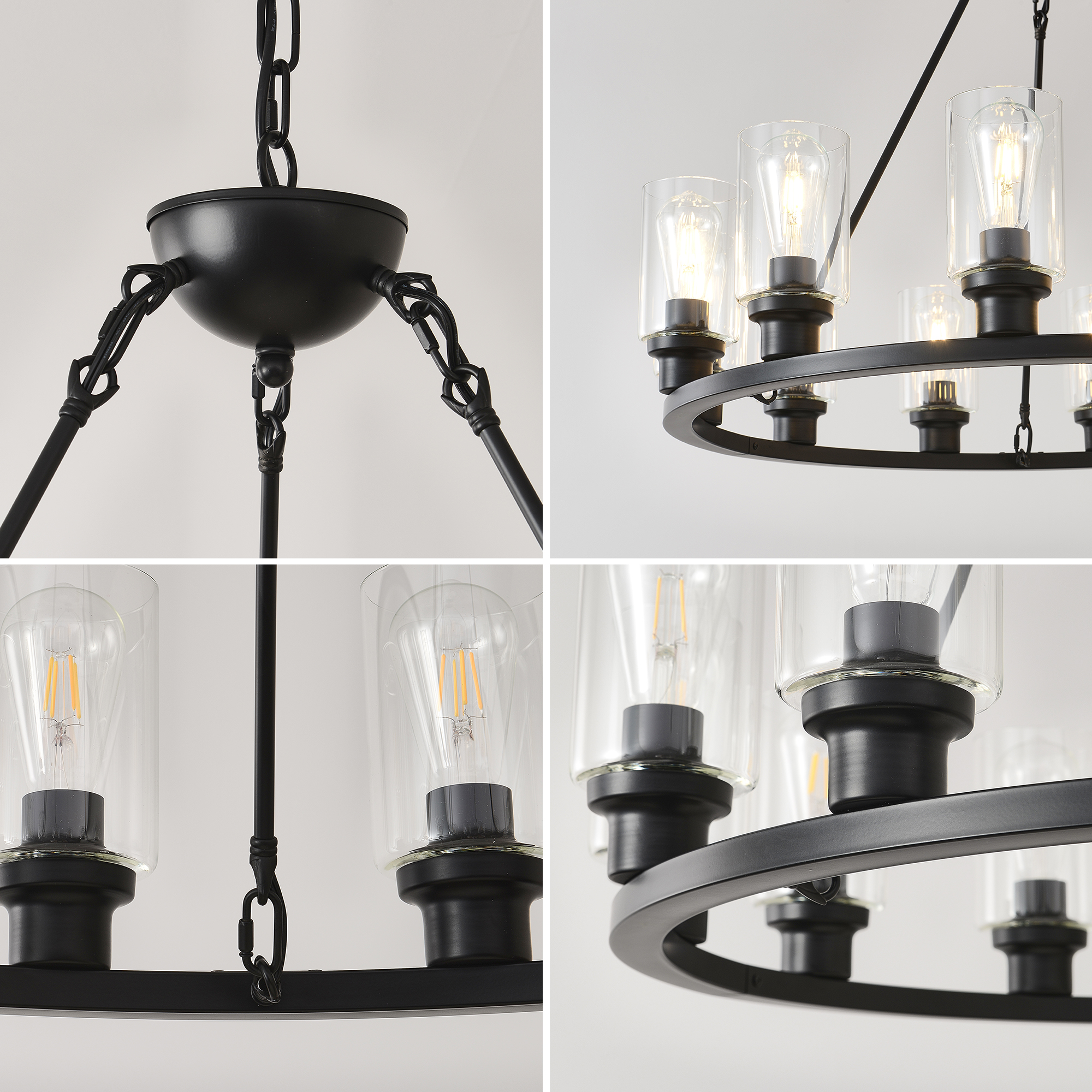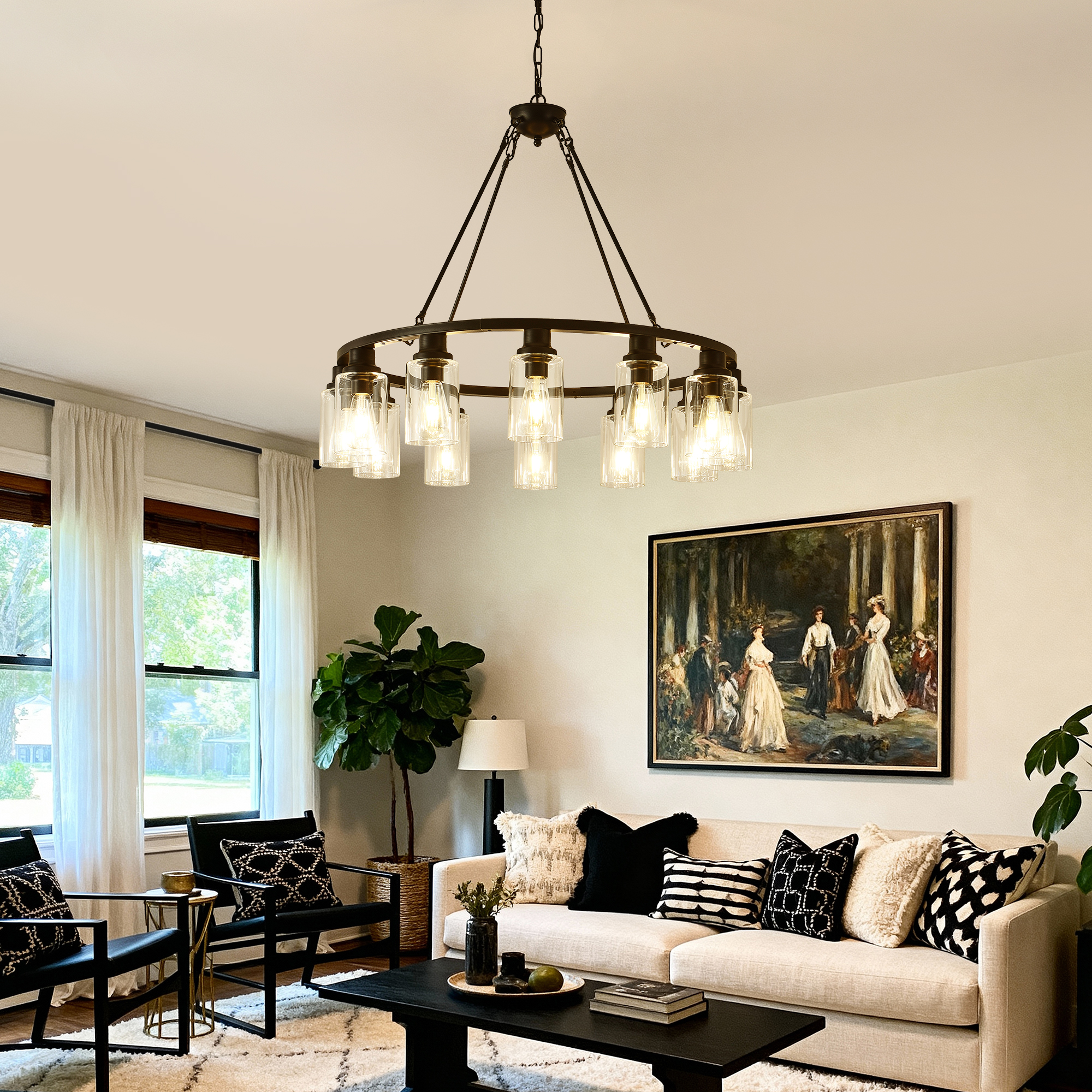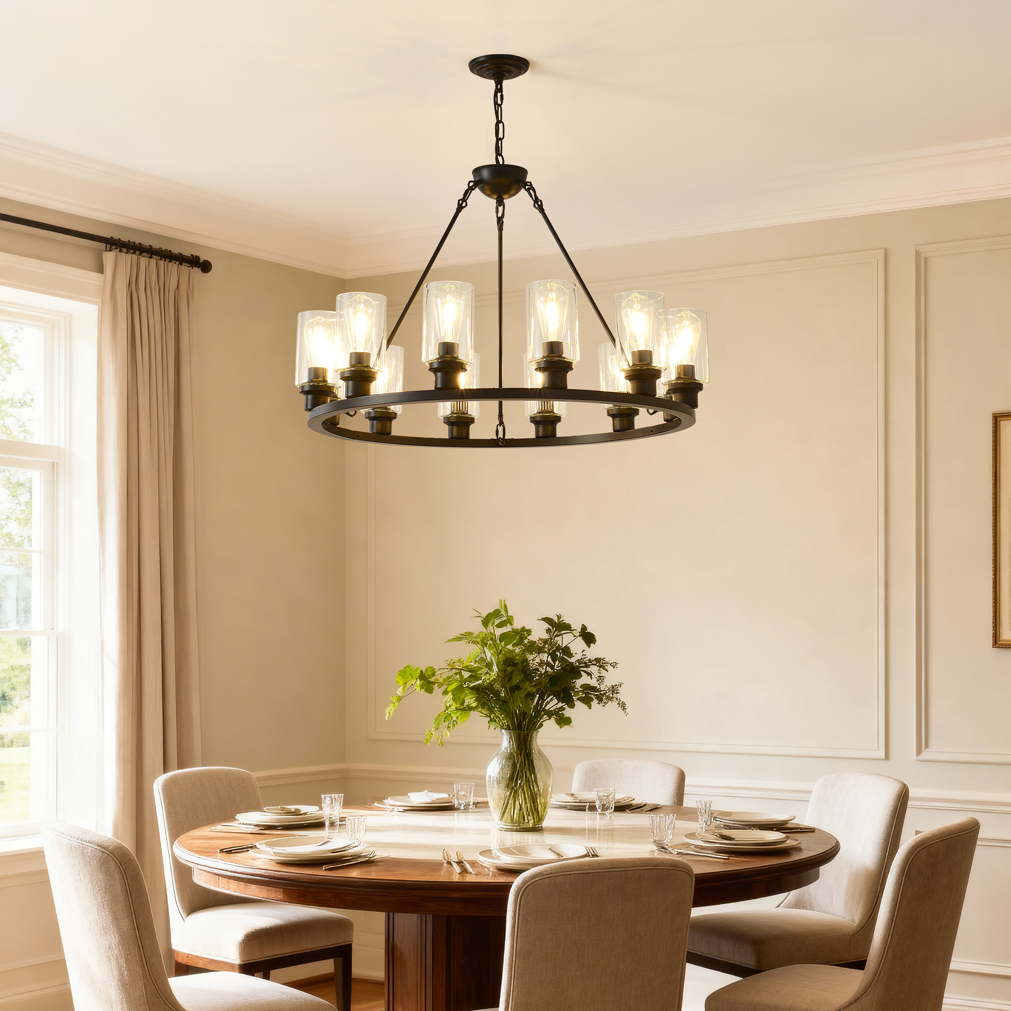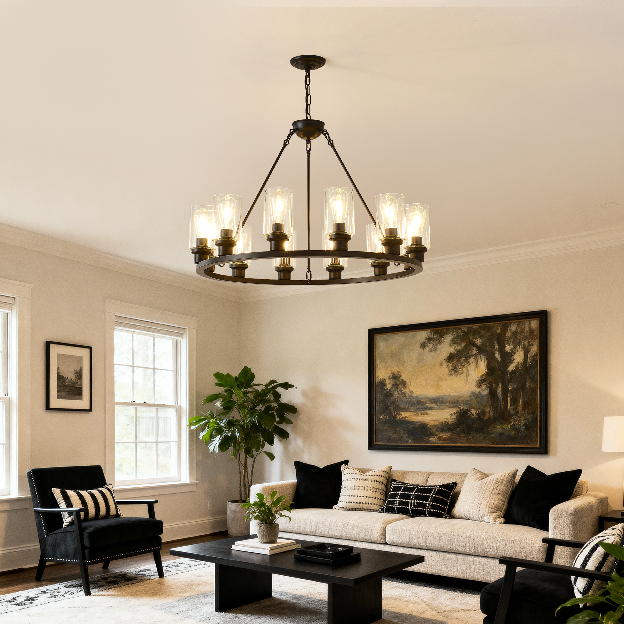 NEOSGO Black Wagon Wheel Chandelier 31.5 Inch Modern Farmhouse Glass Pendant Light 12-Light Ceiling Hanging Lighting Fixtures for Living Room Dining Room Kitchen Island Foyer--NO INCLUDED BULBS is designed to serve as both a lighting source and a decorative focal point within the room. This type of fixture is especially effective above dining tables, in entryways, and in living spaces where the customer wants overhead light with stronger visual impact. The product presentation suggests a style-driven fixture that helps define the ceiling area and gives the space a more elevated, finished character. It is a strong fit for customers who want lighting that contributes to the overall look of the room rather than functioning as a utility piece alone. Overall size is approximately 31.1 x 22.83 x 11.02 inches with a listed weight of 28.6. The current listing includes 9 product images, which help clarify the product shape, proportions, and visual placement in a real room setting.