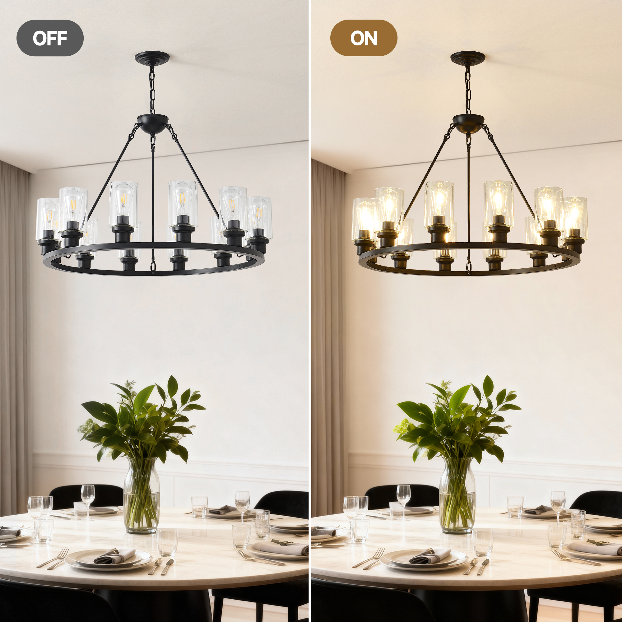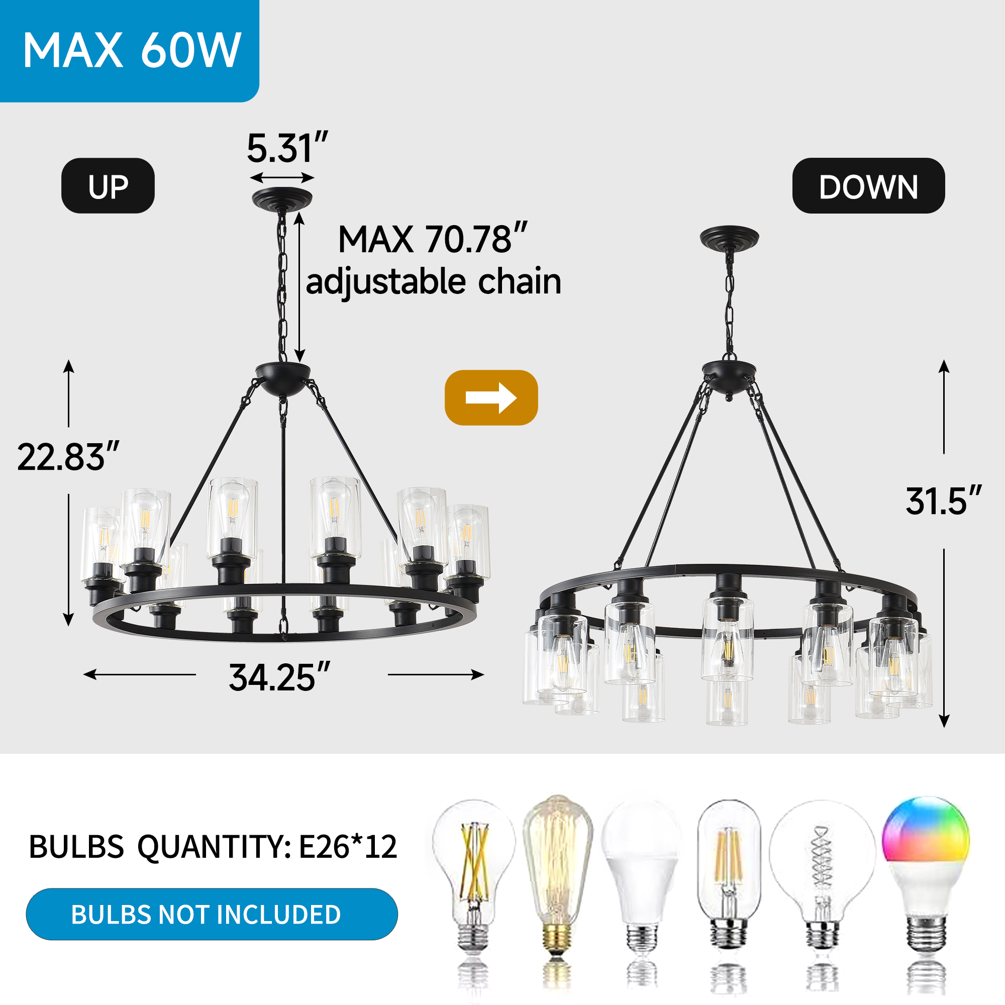 Black Wagon Wheel Chandelier 31.5 Inch Modern Farmhouse Glass Pendant Light 12-Light Ceiling Hanging Lighting Fixtures for Living Room Dining Room Kitchen Island Foyer--NO INCLUDED BULBS