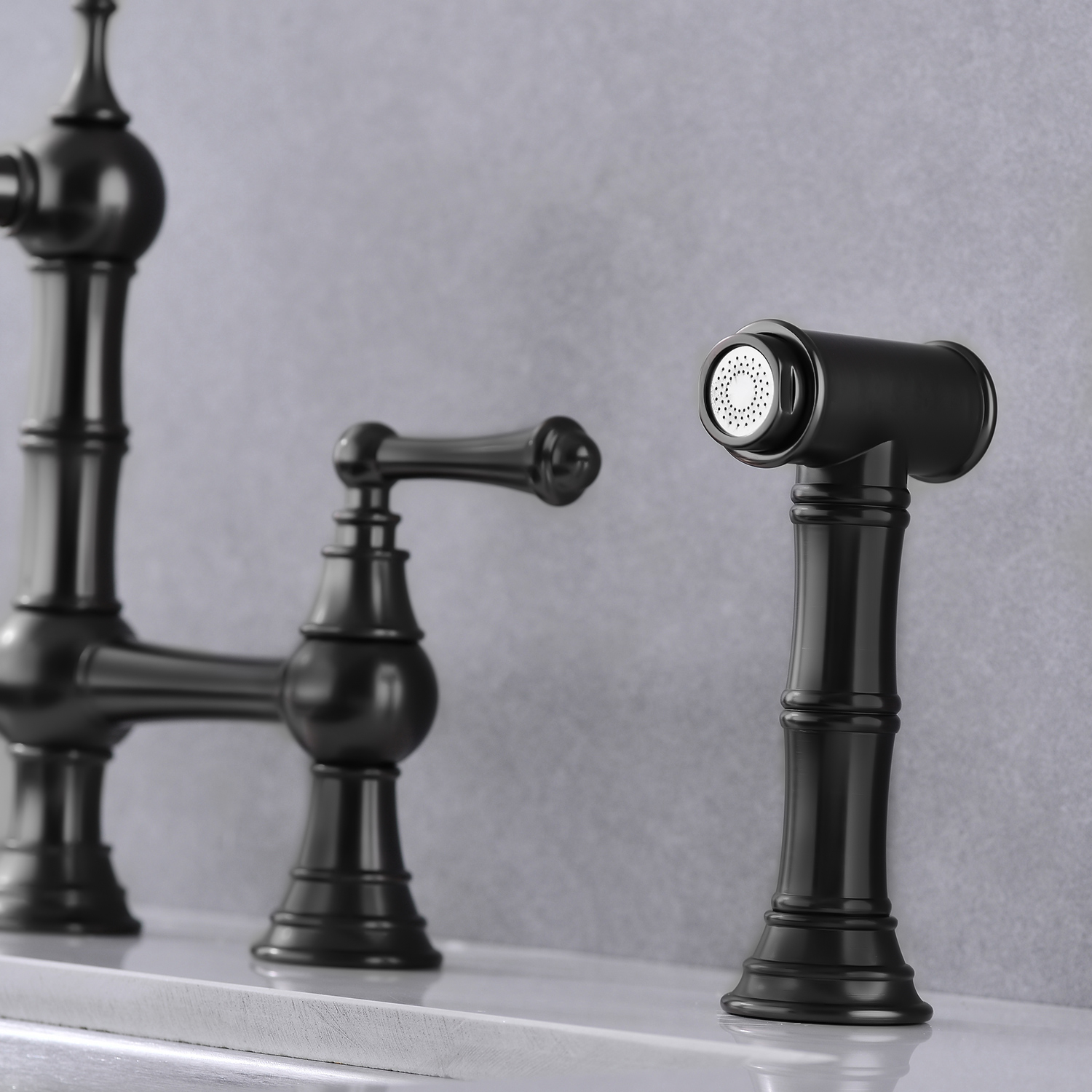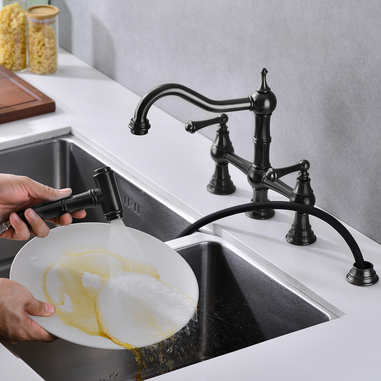 W2287 Bridge Dual Handles Kitchen Faucet With Pull-Out Side Spray in. Designed as a practical decorative lighting piece that supports everyday use while helping complete the look of the space. Material: brass. Product dimensions and weight: length 16.1, width 13.6, height 2.8, weight 8.3.