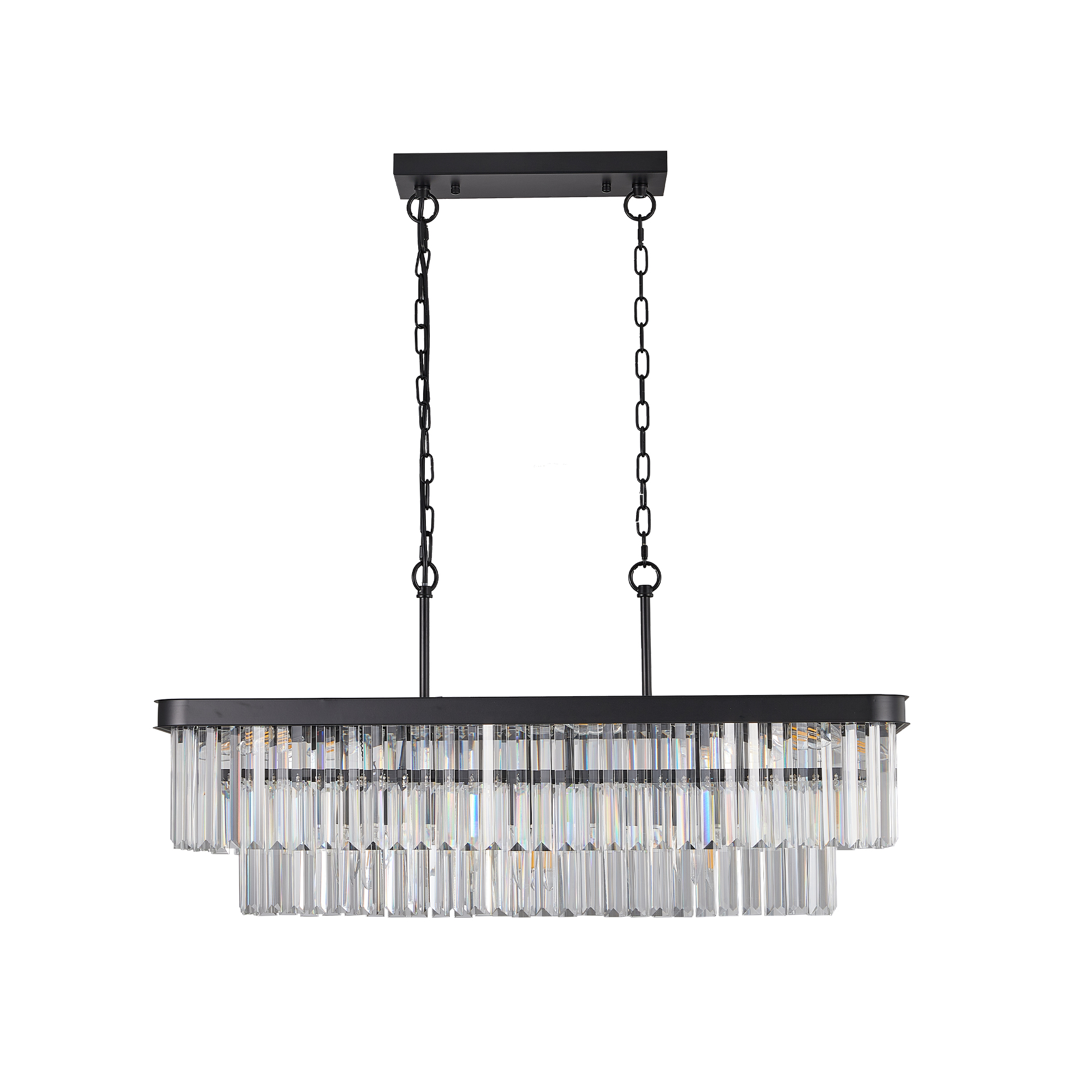 NEOSGO Chandeliers,Rectangular Crystal Chandelier Adjustable,E12 Modern Industrial Crystal Lights,Farmhouse Iron Ceiling Hanging Light for Kitchen Living Room Bedroom/Black(Bulb Not Included). Made to bring focused overhead illumination and decorative impact to dining areas, entryways, or other statement spaces. Product dimensions and weight: length 36.2, width 13.8, height 8.7, weight 27.4.