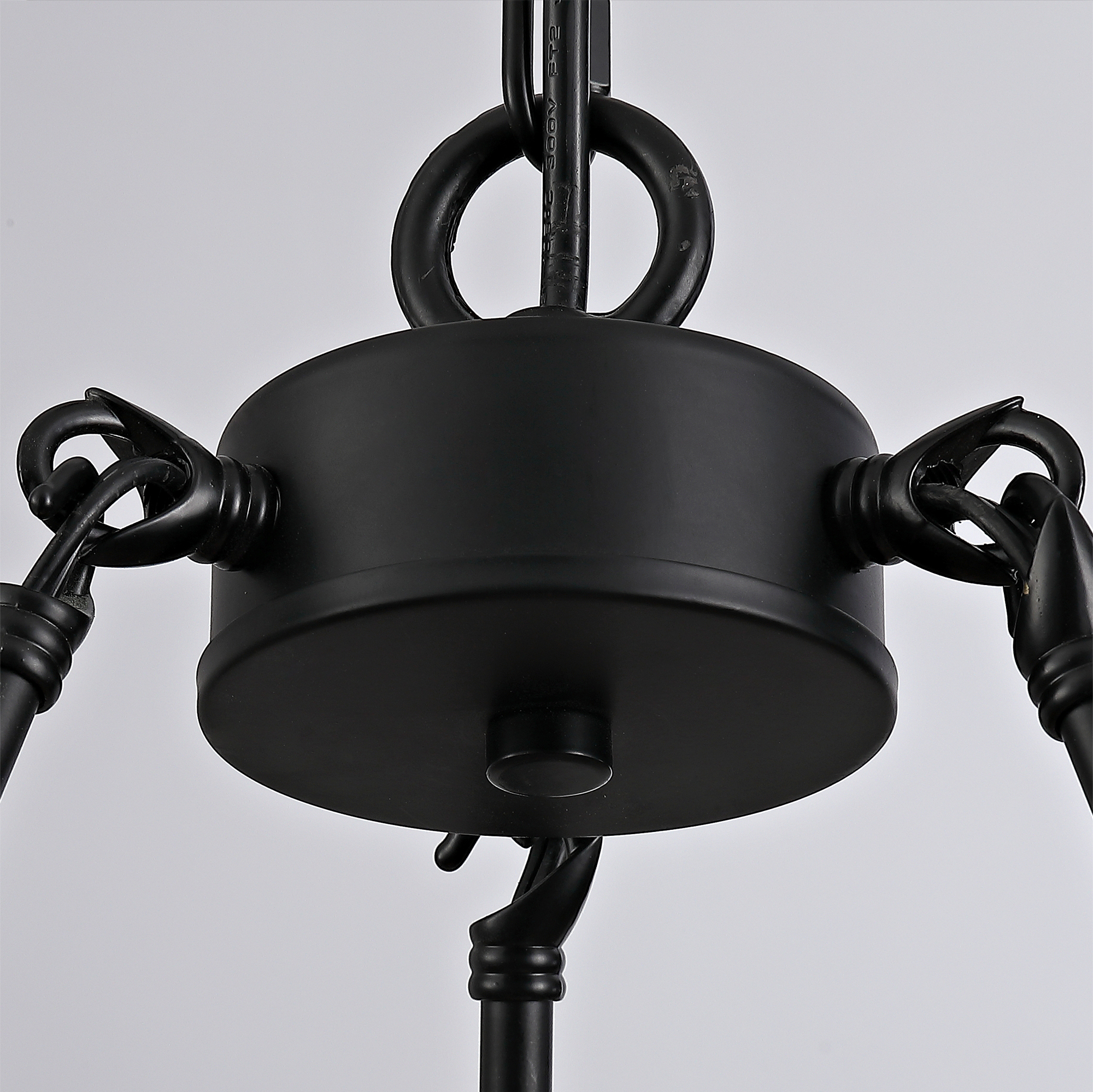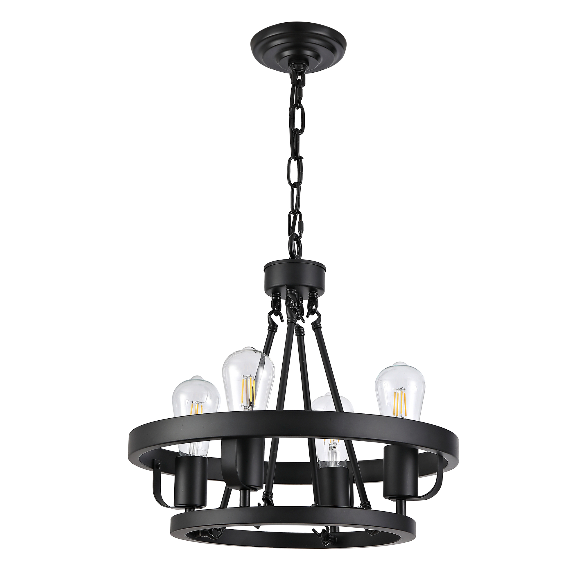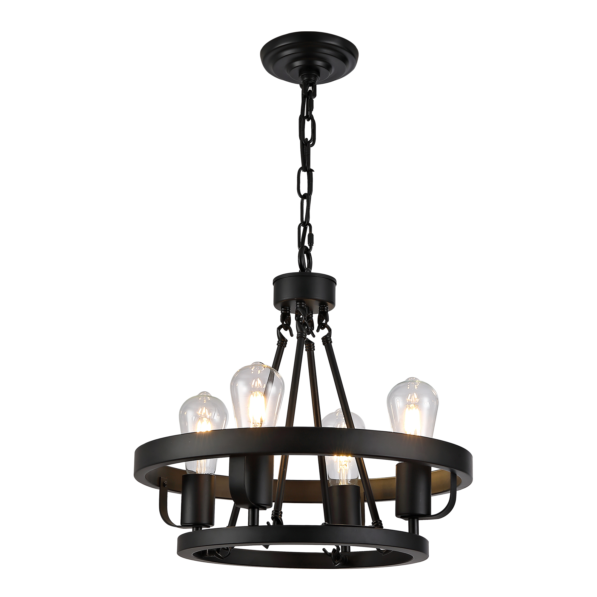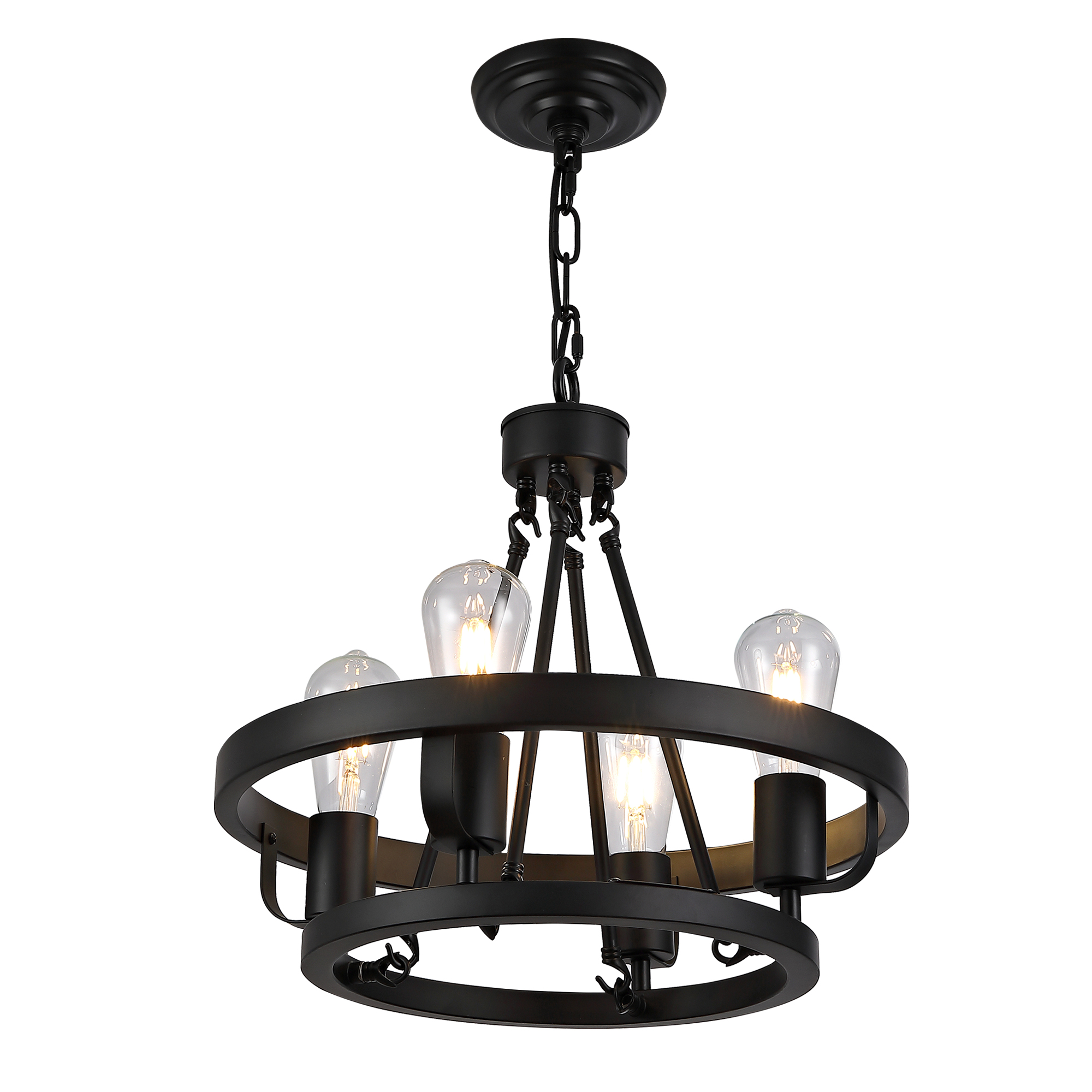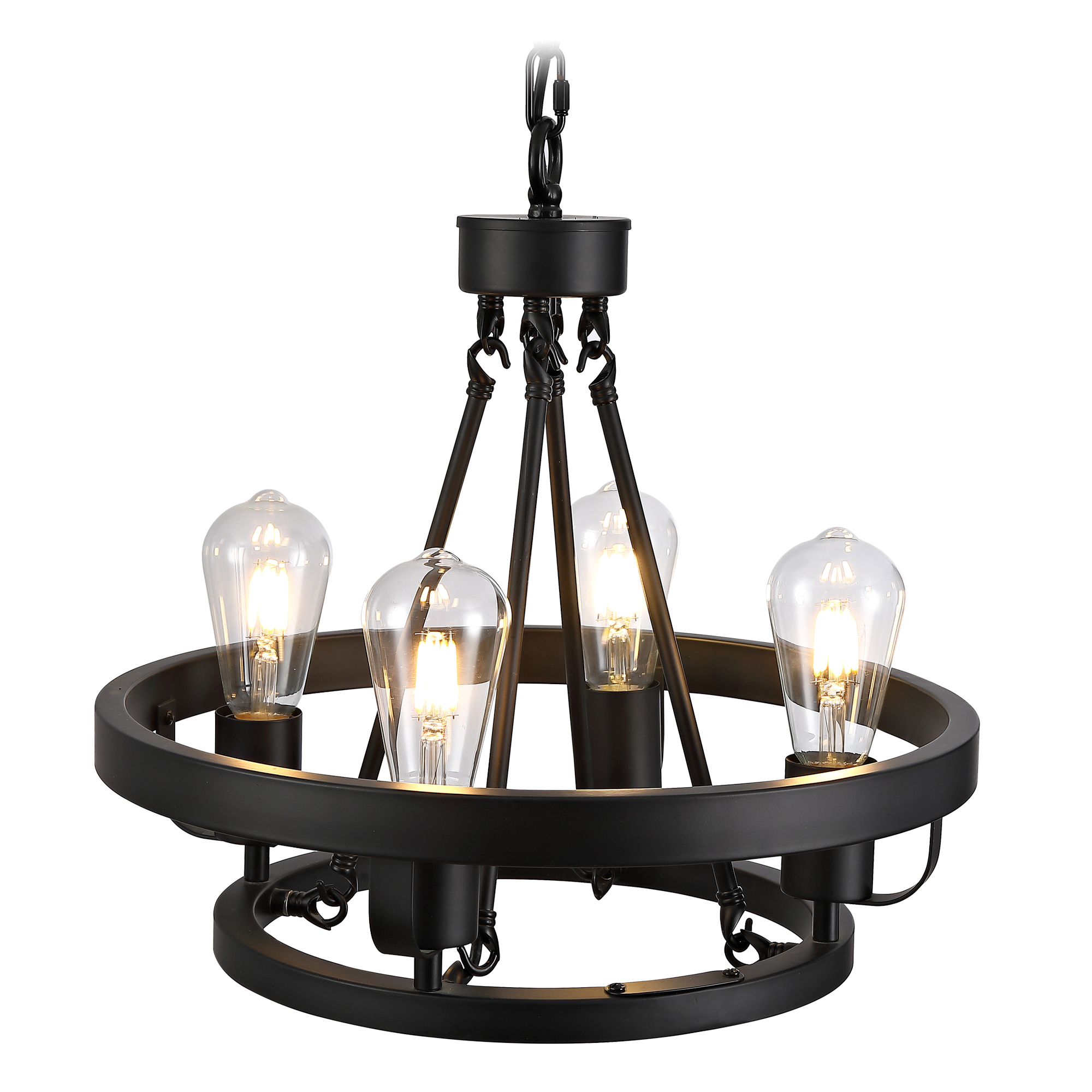 Four-light plug-in pendant lamp, carriage wheel design, black circular metal pendant with 39.5-foot chain, modern industrial-style outdoor lighting suitable for gazebos, bedrooms, and dining rooms.