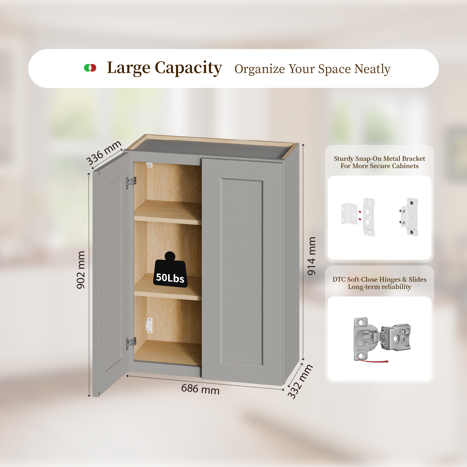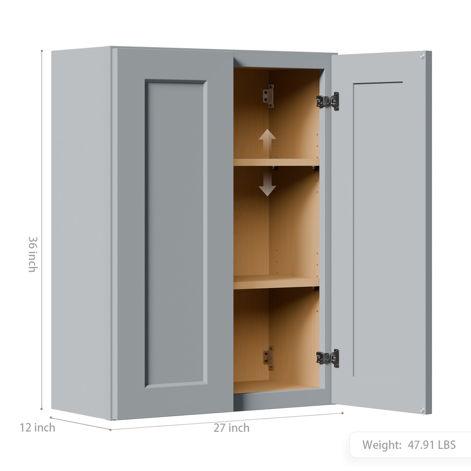 Shaker Made Gray Shaker Solid Wood Wall Cabinet with Soft-Close Doors, Adjustable Shelves - 27" Double Door Storage for Kitchen, Bathroom, Laundry, Garage (Easy Assembly, 27"W x 12"D x 36"H). Works well as accent or supplemental wall lighting for hallways, bedrooms, bathrooms, and other interior spaces. Material: Wood + Synthetic Wood. Product dimensions and weight: length 37.83, width 28.39, height 4.92, weight 47.91.