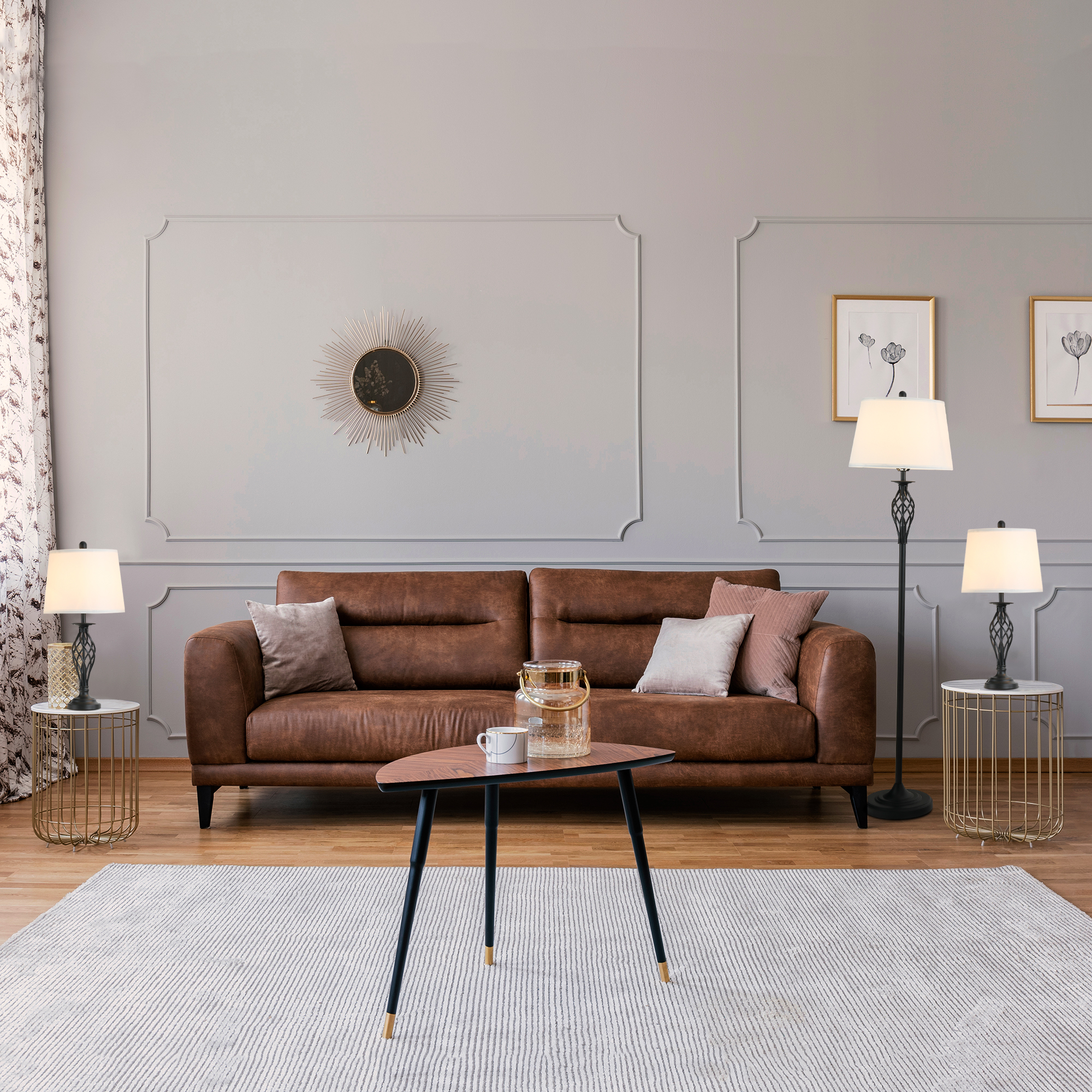 NEOSGO HOMCOM 3 Piece Table Floor Lamp Set with Metal Pole, Round Base, and Fabric Lampshade, for Living Room, Black/White. Useful as everyday supplemental lighting for reading, relaxing, or adding warmth to living spaces. Product dimensions and weight: length 20.5, width 20.5, height 10.2, weight 22.6.