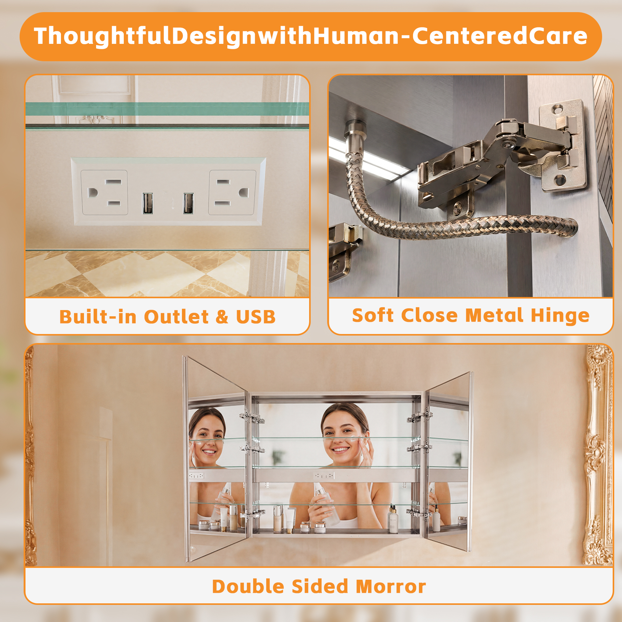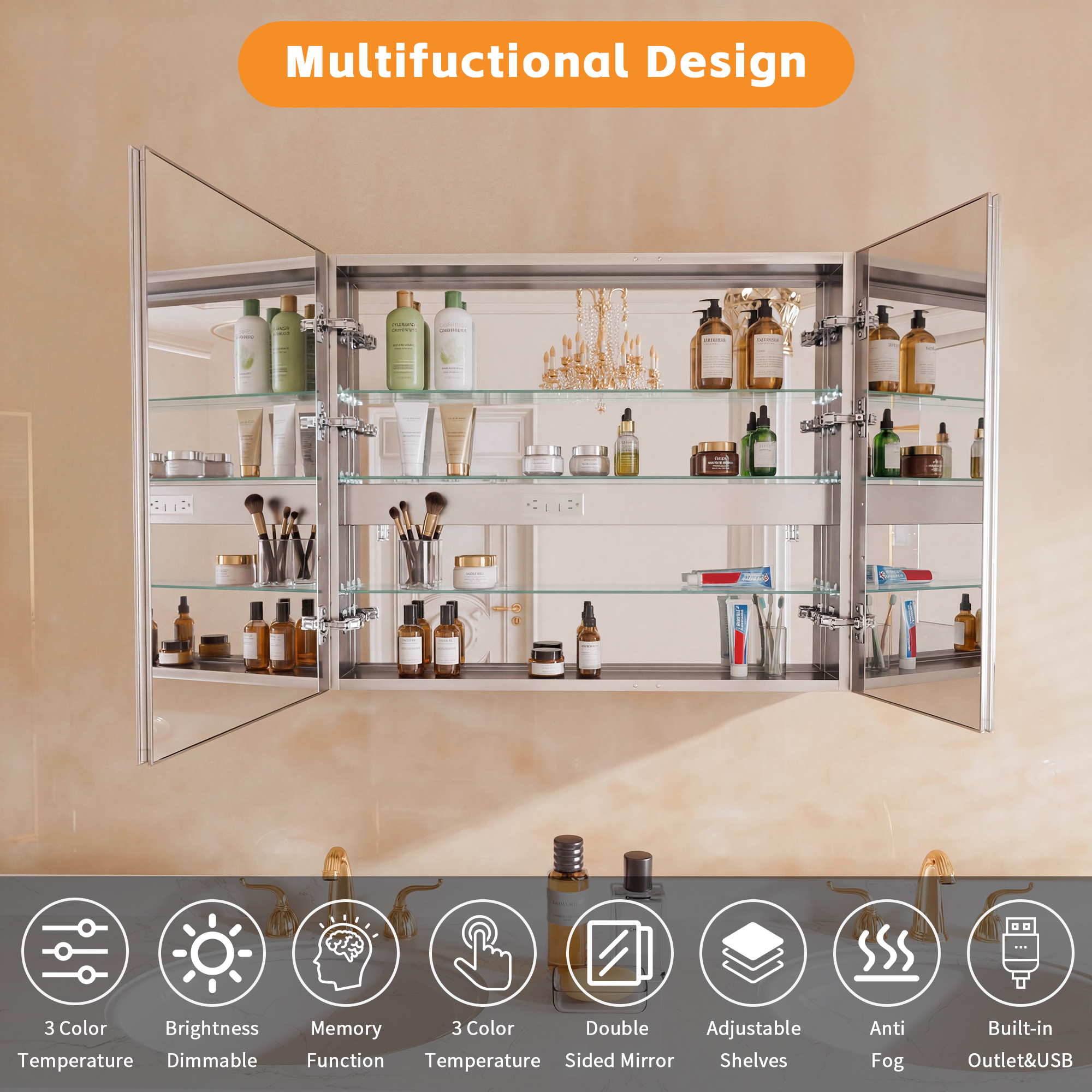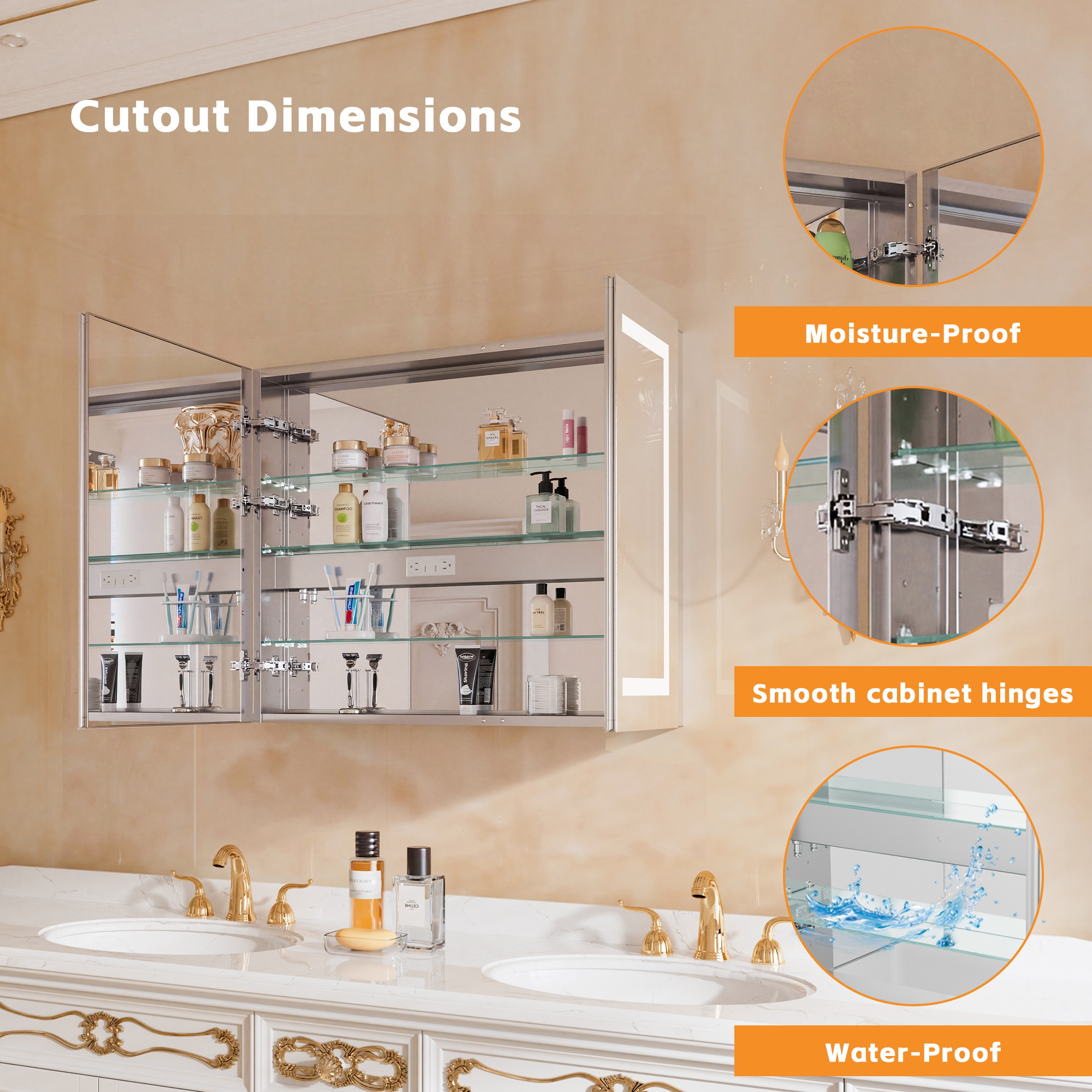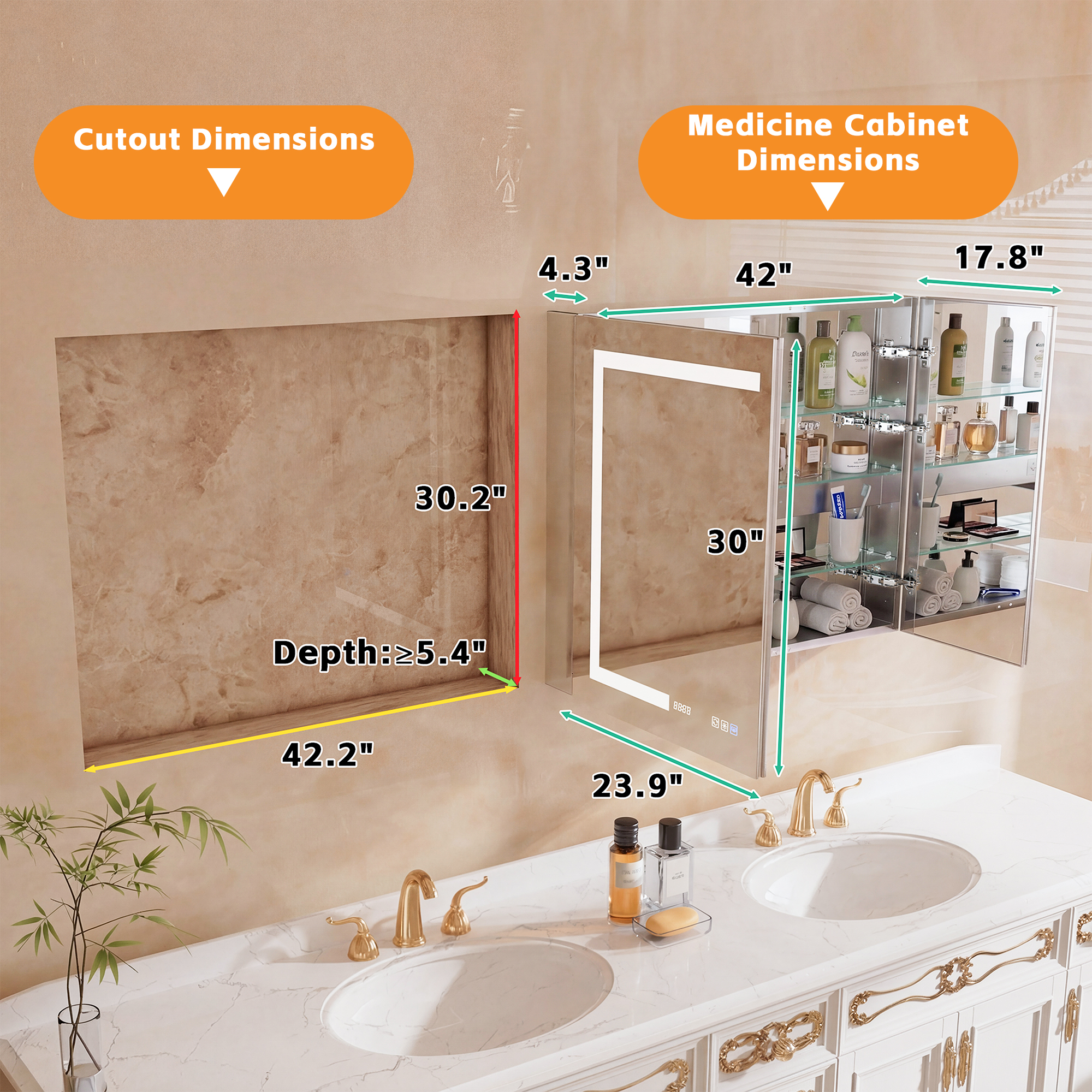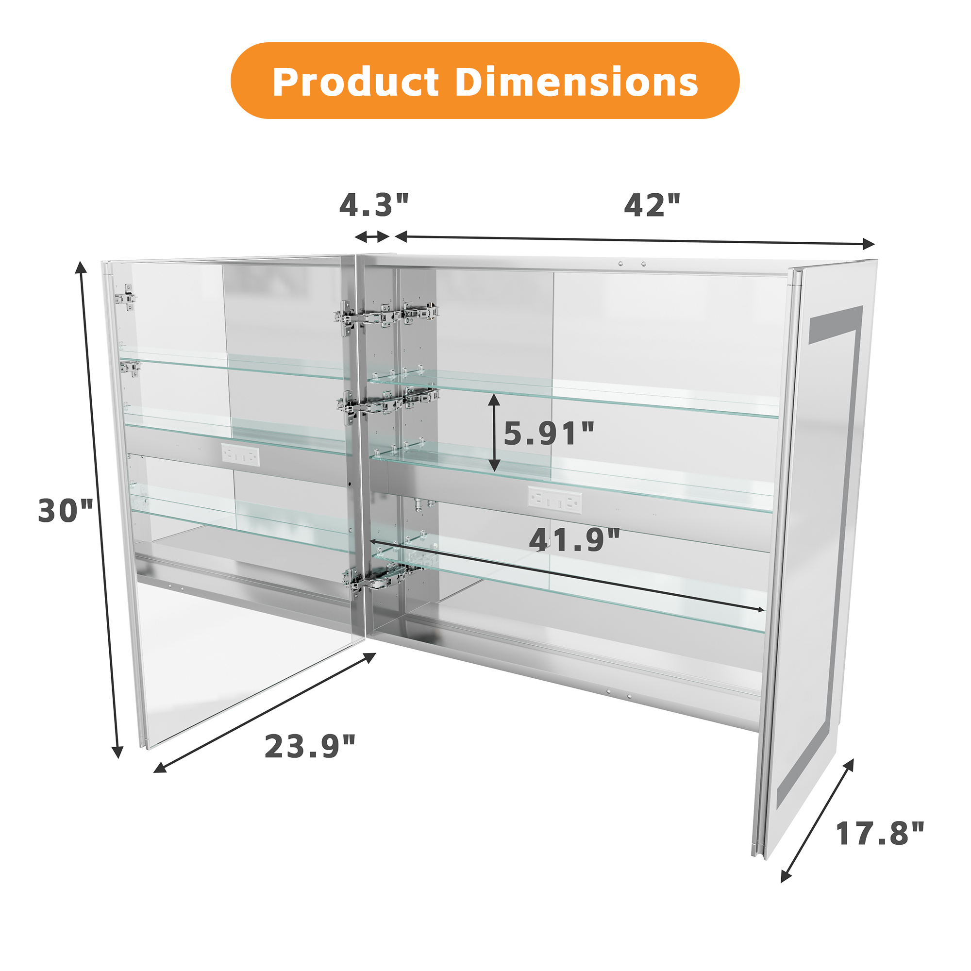 W5609 Lighted Bathroom Medicine Cabinet with Intelligent Mirror, 42" W x 30" H, Dimmable, Time & Temp Display, Anti-Fog, Built-in Outlet & USB, Adustable Shelf. Designed to provide practical task lighting around a vanity or bathroom mirror while supporting everyday grooming routines. Material: Aluminium,Glass. Product dimensions and weight: length 48.43, width 36.22, height 8.66, weight 78.1.