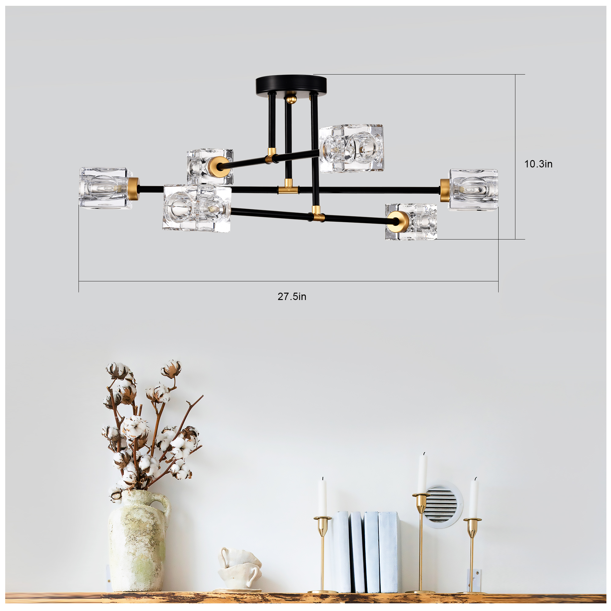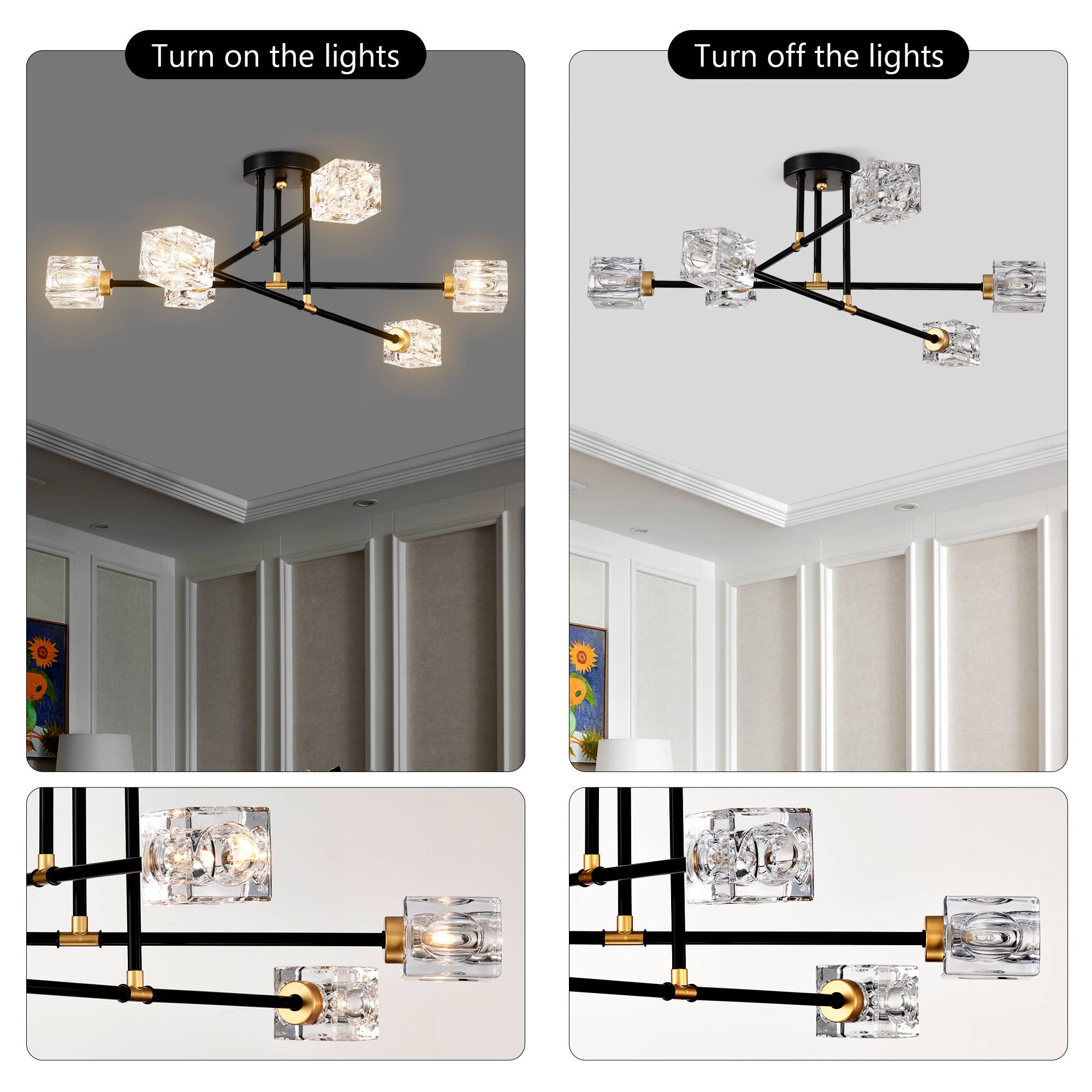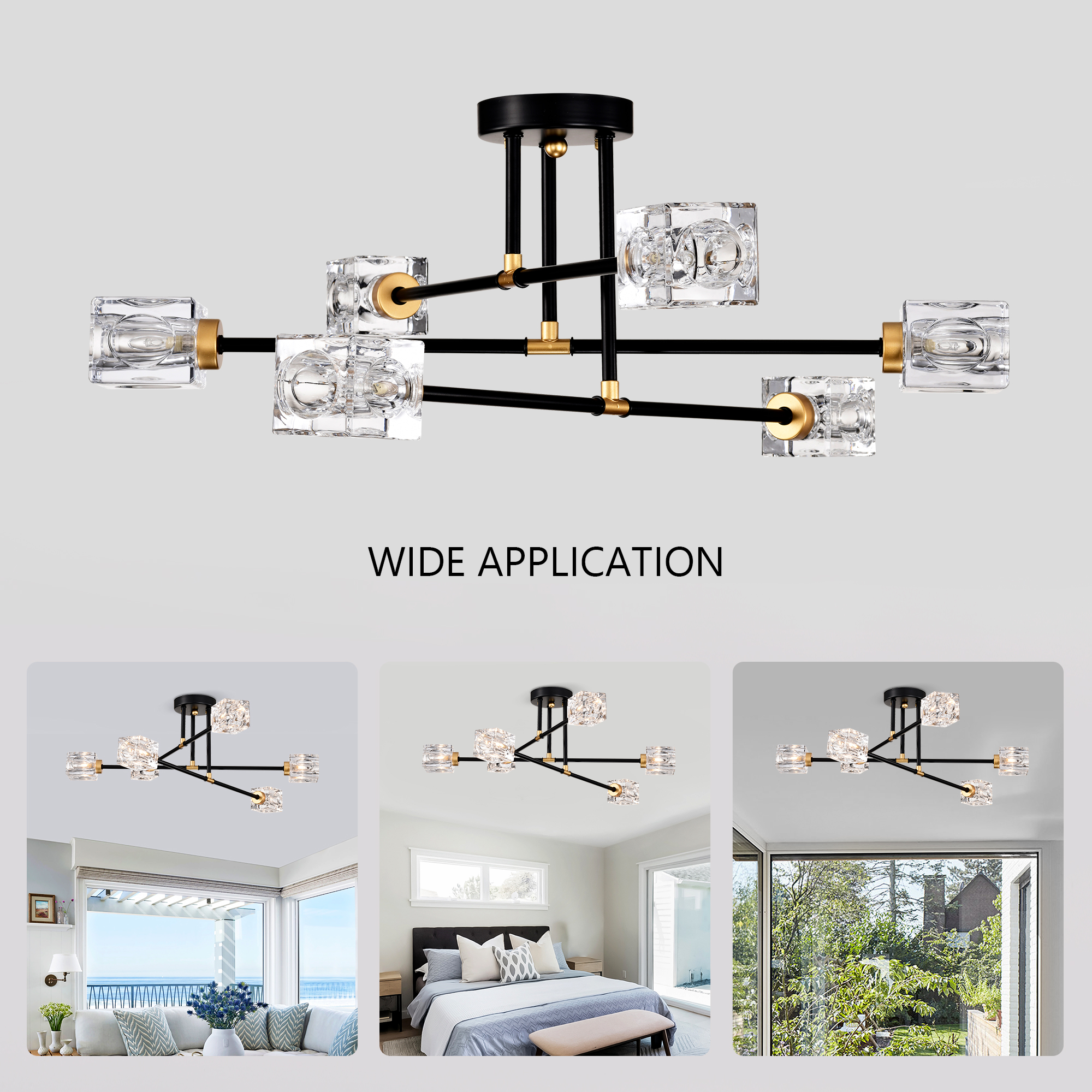 NEOSGO Modern Ceiling Lamp with Light Fixture (6*G9 Bulbs Included),Modern Semi Flush Mount Light Fixture Crystal Chandelier for Dining Room, Bedroom, Living Room--Matte Black +Matte Gold is designed to serve as both a lighting source and a decorative focal point within the room. This type of fixture is especially effective above dining tables, in entryways, and in living spaces where the customer wants overhead light with stronger visual impact. The product presentation suggests a style-driven fixture that helps define the ceiling area and gives the space a more elevated, finished character. It is a strong fit for customers who want lighting that contributes to the overall look of the room rather than functioning as a utility piece alone. Overall size is approximately 25.98 x 7.87 x 4.92 inches with a listed weight of 11.22. The current listing includes 12 product images, which help clarify the product shape, proportions, and visual placement in a real room setting.