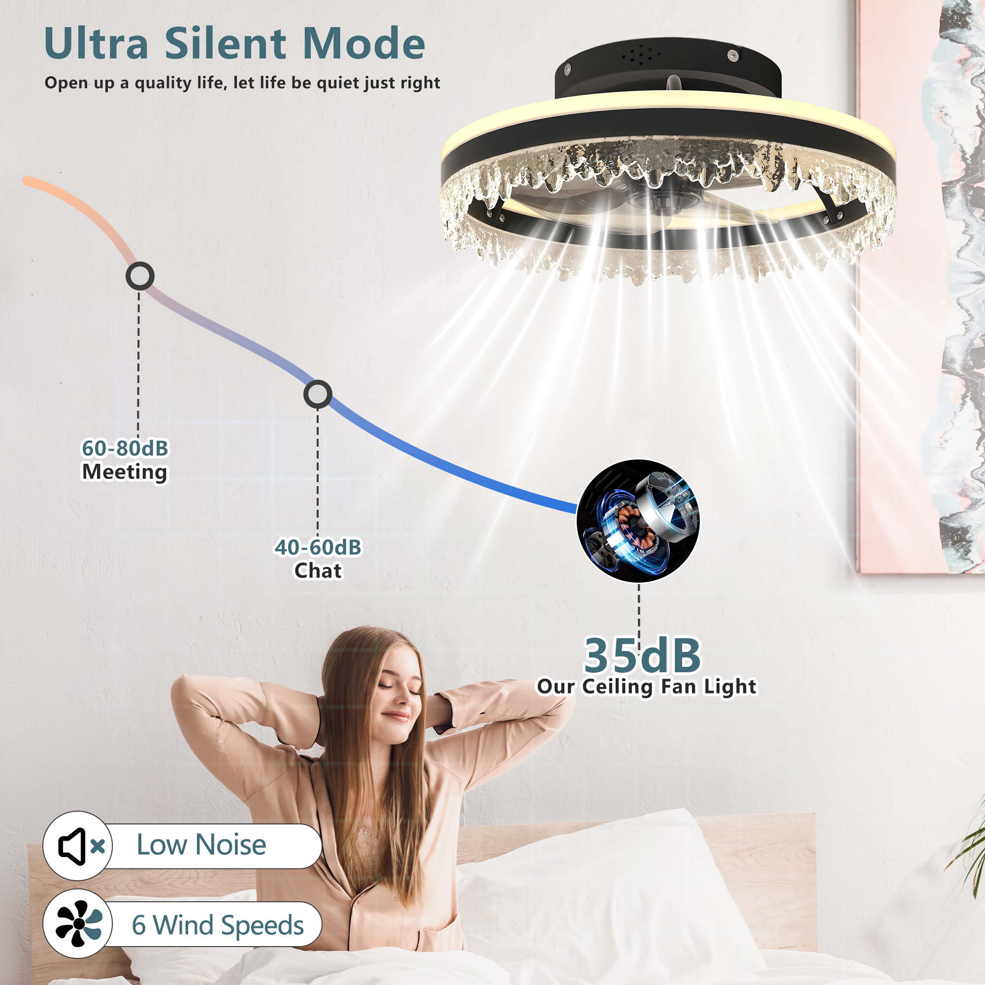 NEOSGO Modern LED Ceiling Fan with Light – 16'' Dimmable Ceiling Light with Invisible Blades and Crystal Design, Remote Control & Adjustable Color Temperature, Quiet Fan for Bedroom, Living Room,Black combines ceiling lighting and airflow in one fixture, making it useful for rooms that need everyday comfort as well as a more finished overhead look. The caged or close-to-ceiling style shown in the product presentation helps it work well in spaces where customers want decorative character without the visual bulk of a larger hanging fixture. It is well suited for kitchens, dining rooms, bedrooms, living areas, and similar spaces where air movement, ambient light, and a coordinated design all matter. This is a practical choice for customers who want to save ceiling space while improving comfort and keeping the room visually polished. Overall size is approximately 16.9 x 16.9 x 6.9 inches with a listed weight of 6.1. The current listing includes 9 product images, which help clarify the product shape, proportions, and visual placement in a real room setting.